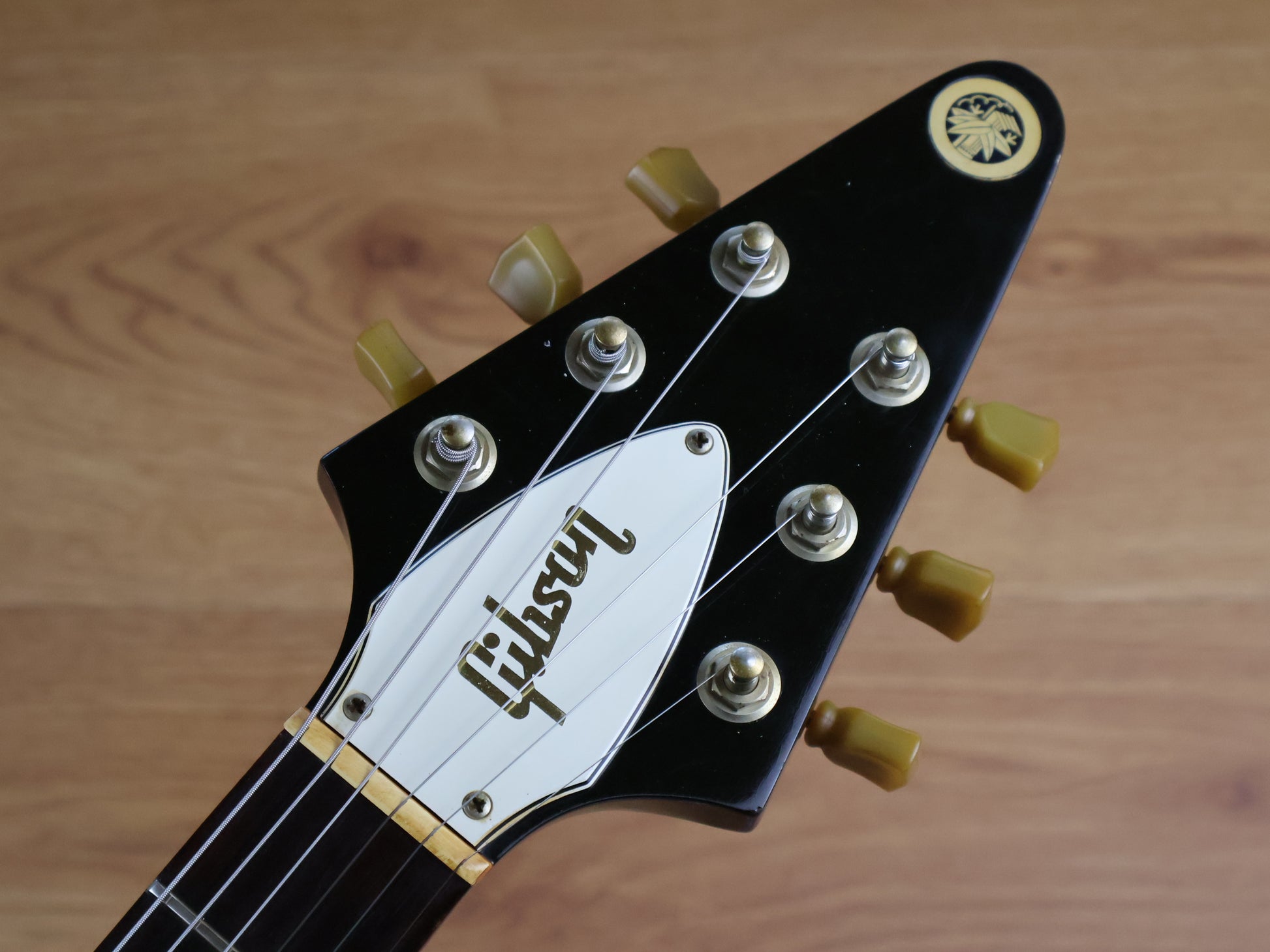 "Gibson returned the Flying V to its roots in 1990 after experimenting with numerous aspects of the design throughout the '80s. Eschewing the offset knobs and beveled edges from the previous decade, Gibson returned to one of the earliest standard production versions of the Flying V from 1967 for inspiration, using a more traditional triangle-knob layout, and plain mahogany body woods"