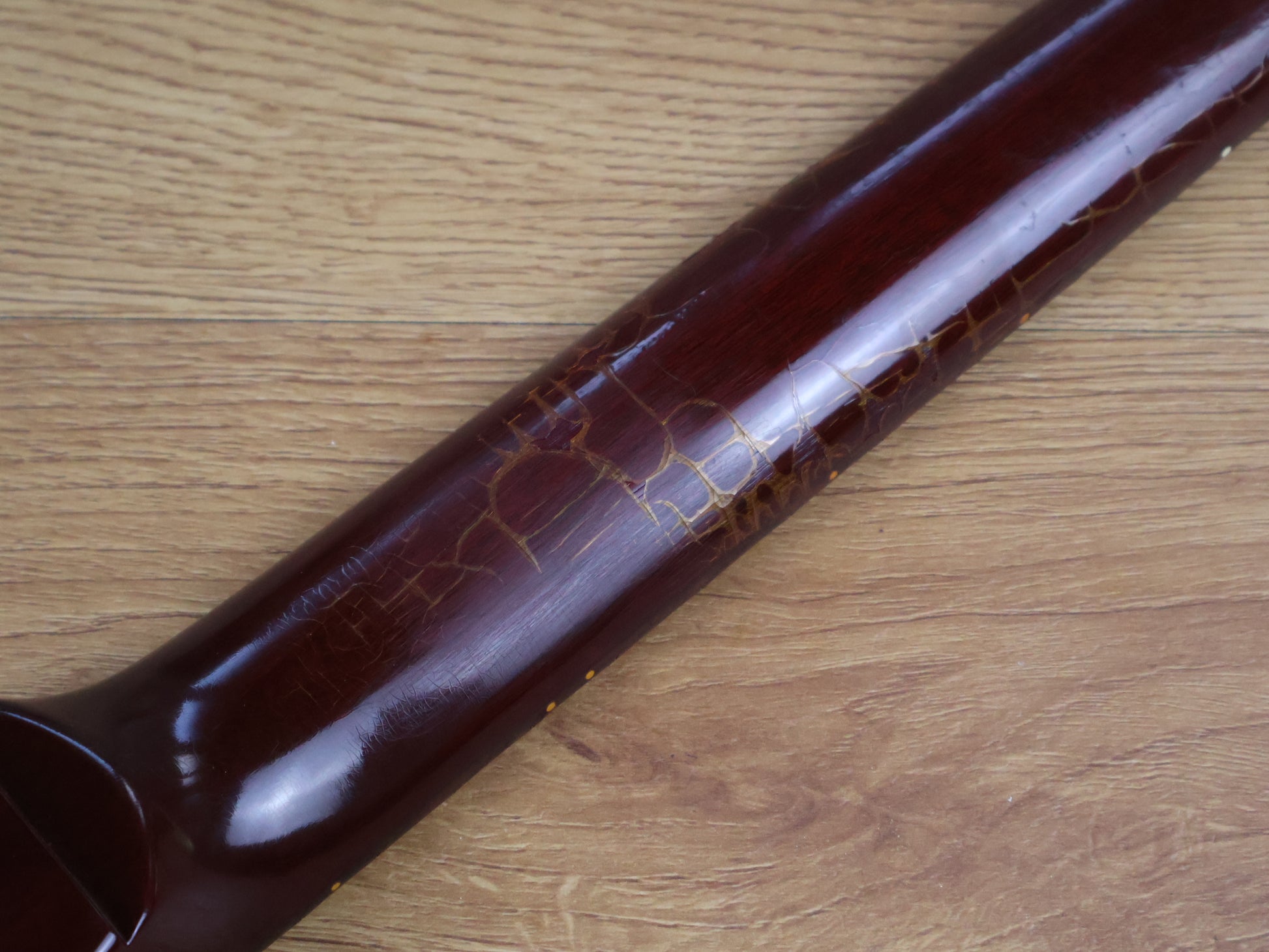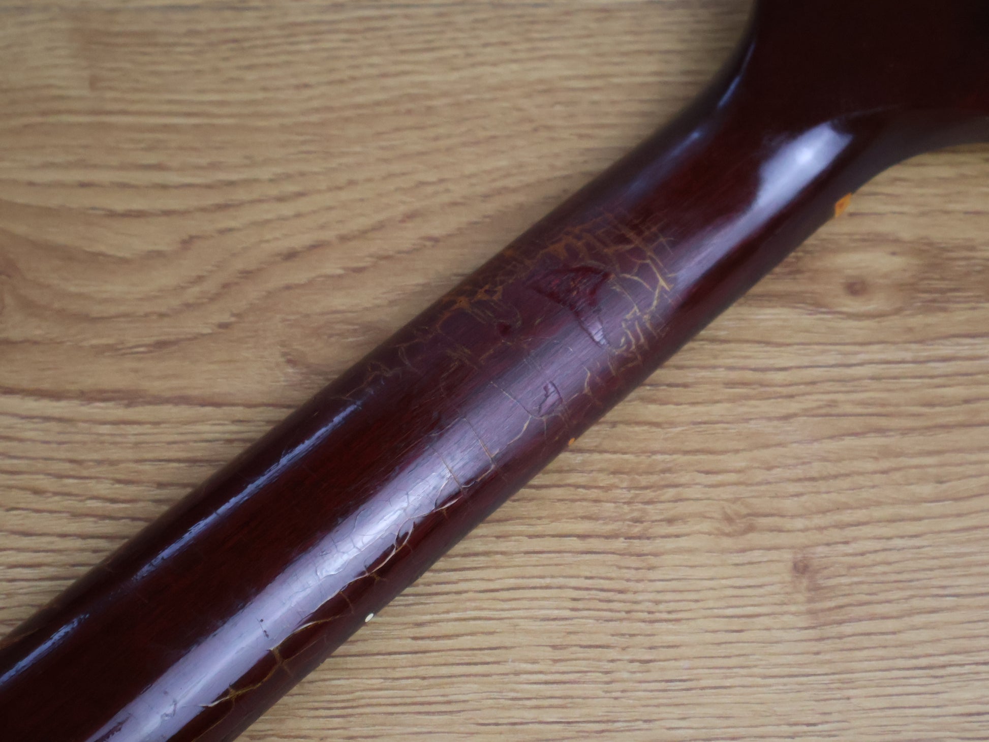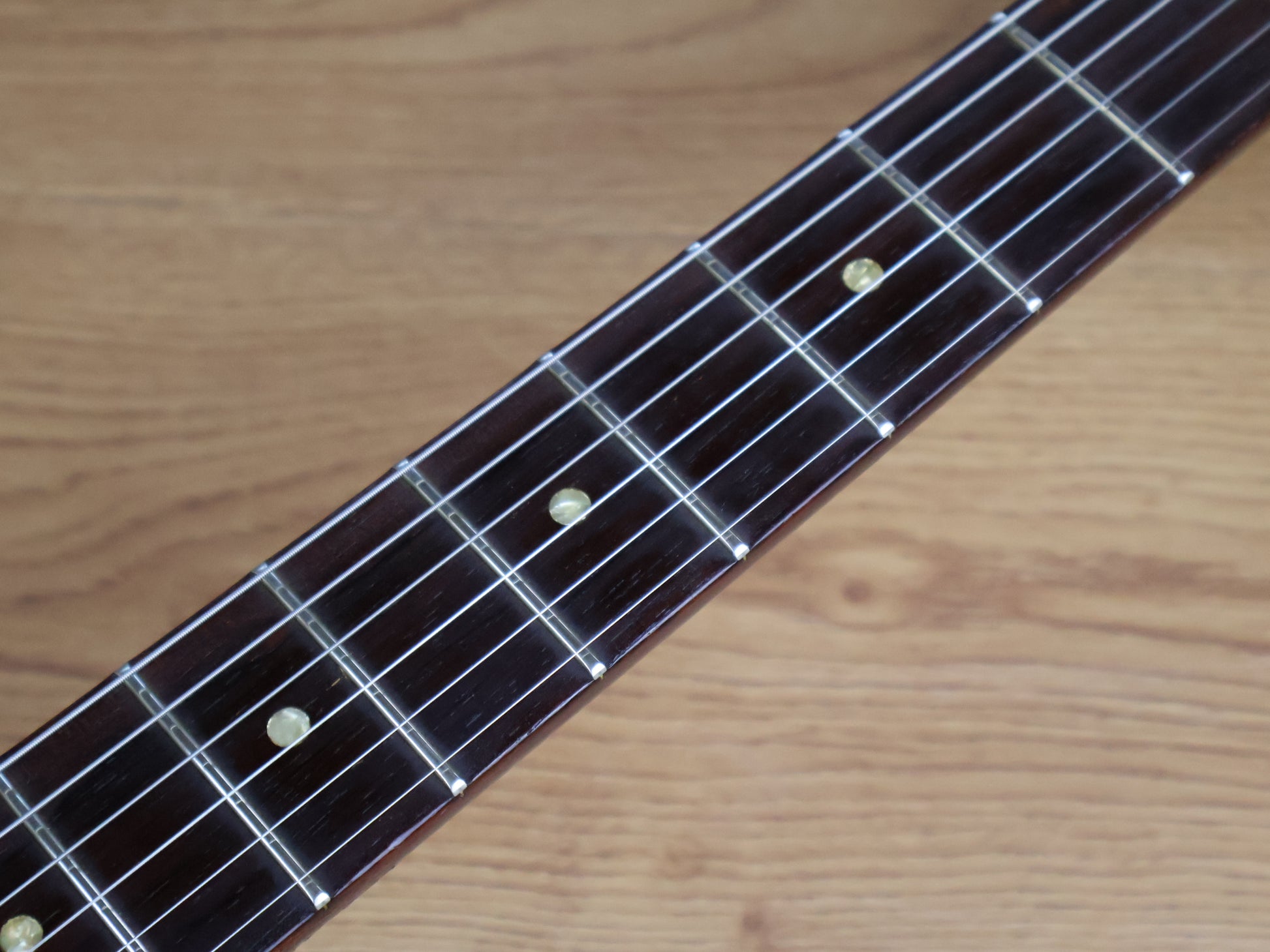 Received a full setup and service prior to listing including a fret polish, fretboard oil and buff/polish. Frets are shiny and smooth and the neck is straight with a fully functional truss. The hardware is heavily nicotine stained from the previous owner and the top coat of lacquer is peeling and checking in spots (notable on the back of the neck) but there's no structural breaks or repairs.