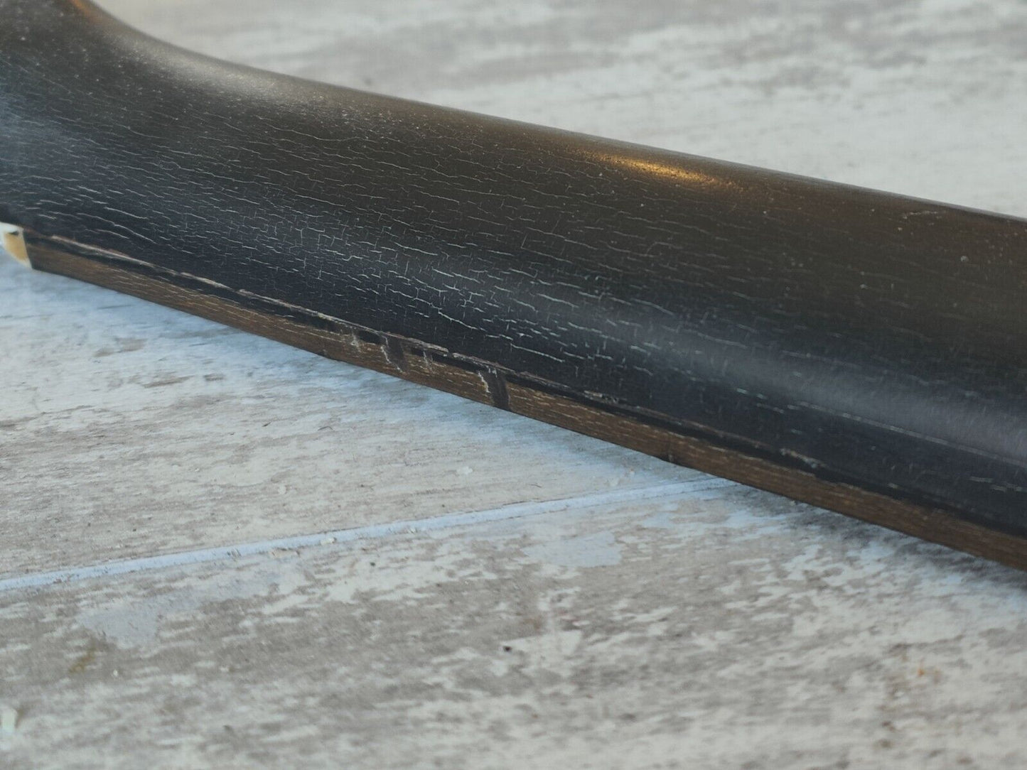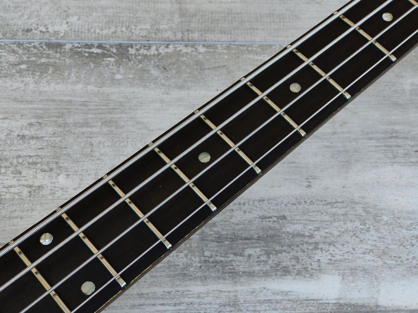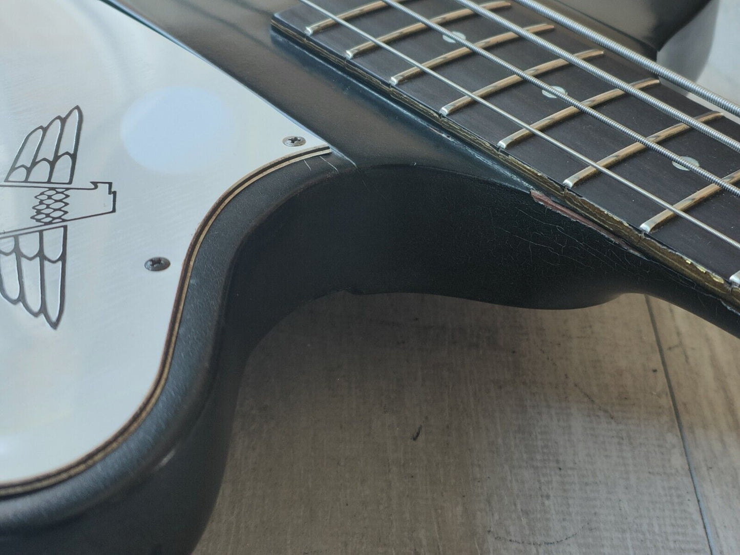 This one came to us with a pretty hefty amount of grime on the finish. We had it buffed and polished back so it's now nice and smooth with plenty of checking and cracking to the finish. There's also some even separation along the fingerboard as pictured, it's been buffed back so it's smooth to play and is purely cosmetic. The neck is straight, the frets are shiny and the truss works as it should.