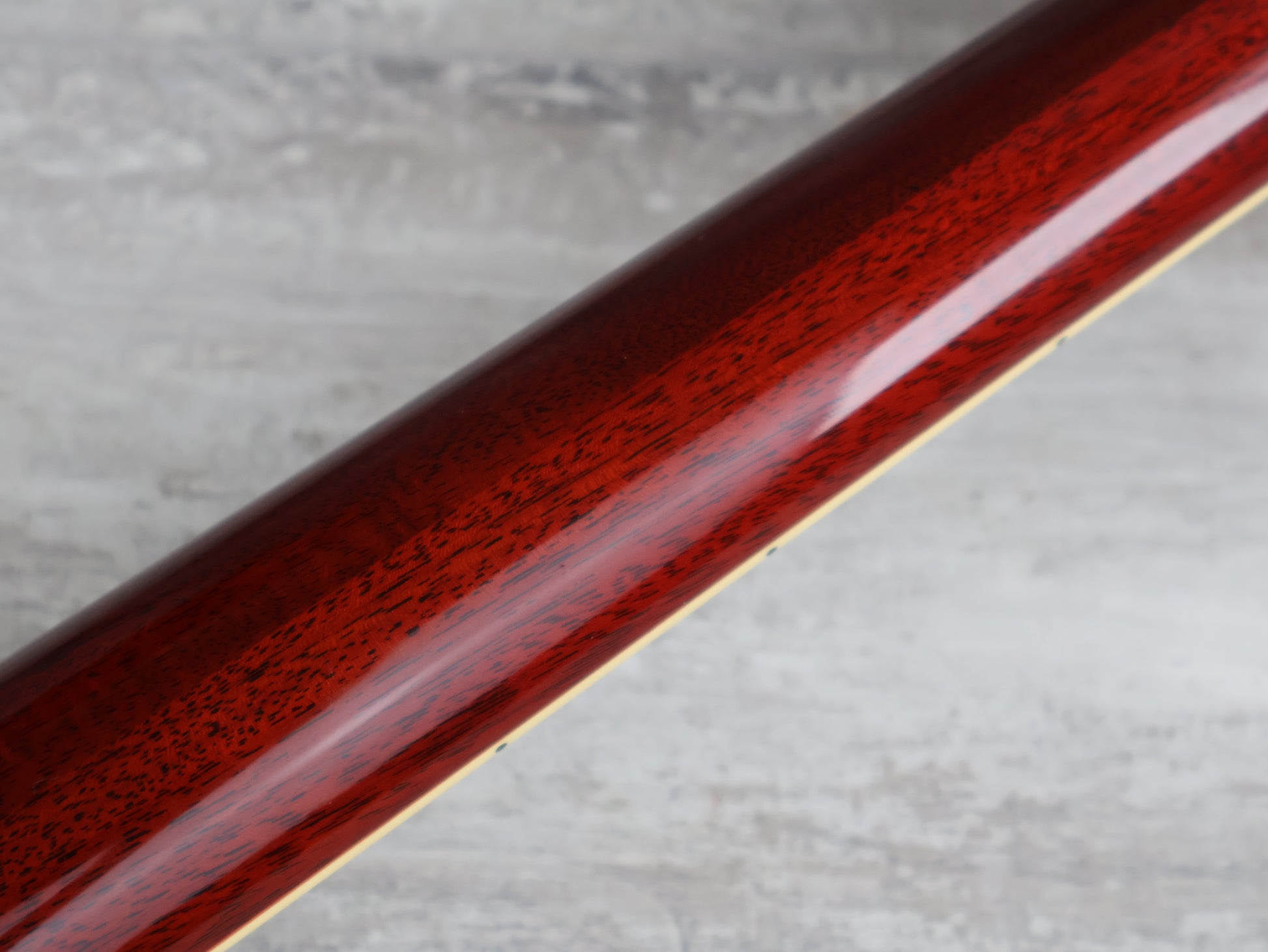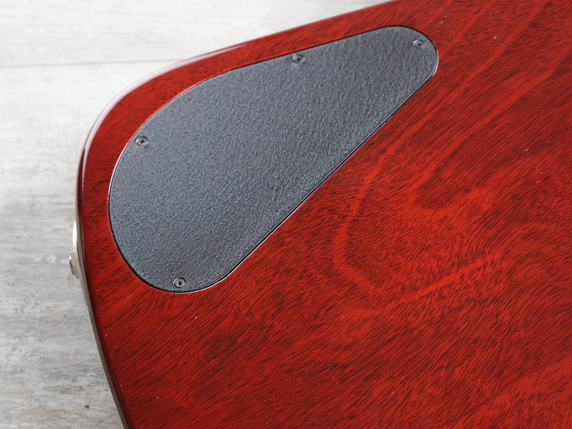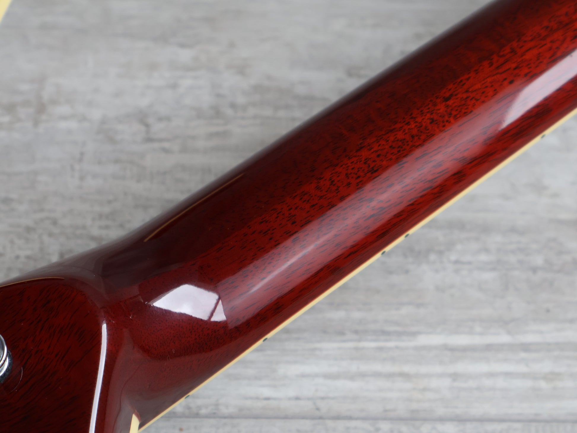 AAA grade solid flame maple top, solid mahogany body with a contoured set mahogany neck and 22 fret rosewood fingerboard (abalone block inlays, 628mm scale length, 43mm nut width), it weighs just over 4kg's.