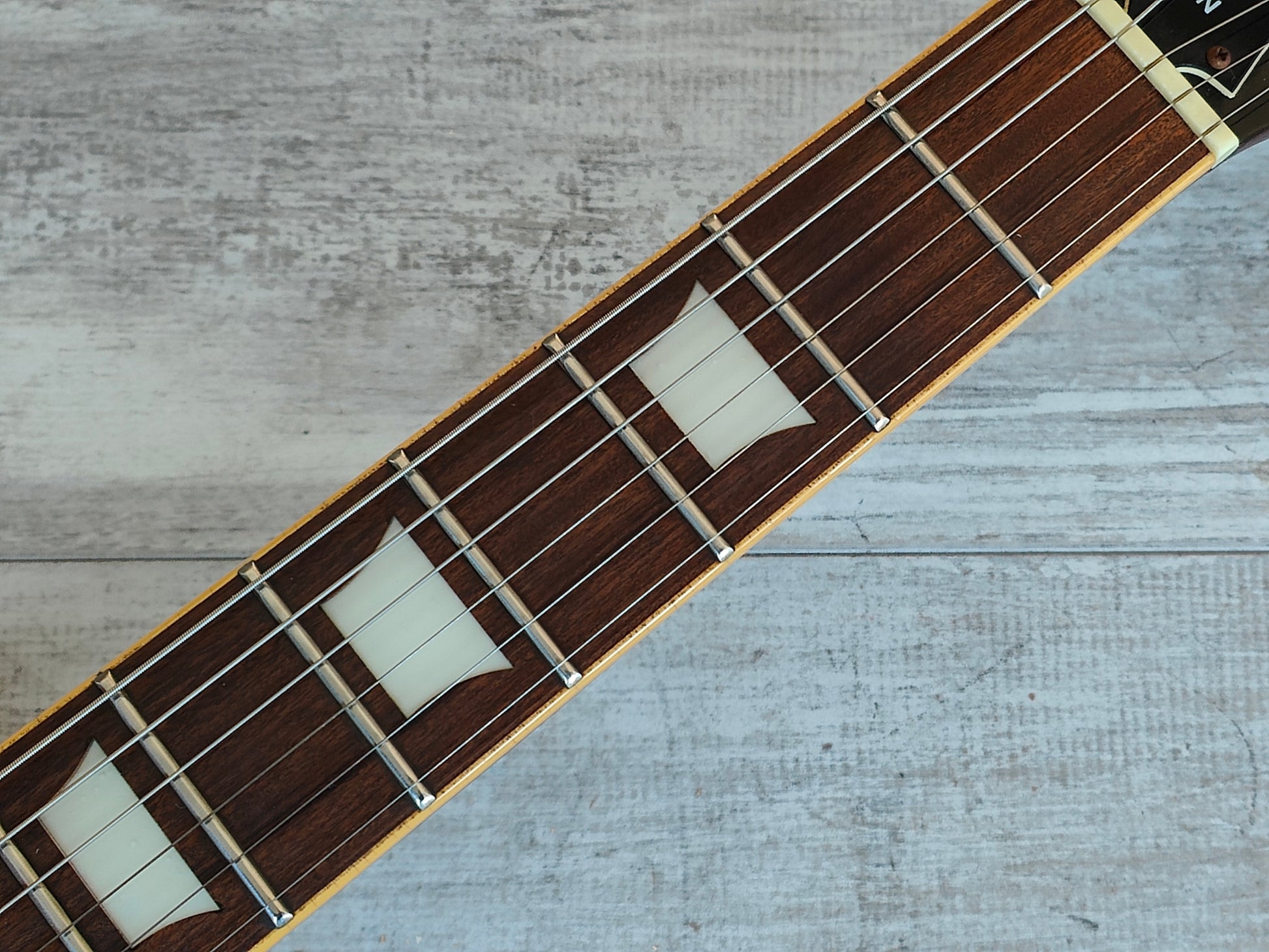 Korean made in 2000 (a very good period for Epiphone quality), this is your classic Les Paul Standard in a classy Goldtop finish. Mahogany body, slim 60's maple neck and a classic rosewood fingerboard with trapezoid inlays, weighs 3.8kg's.