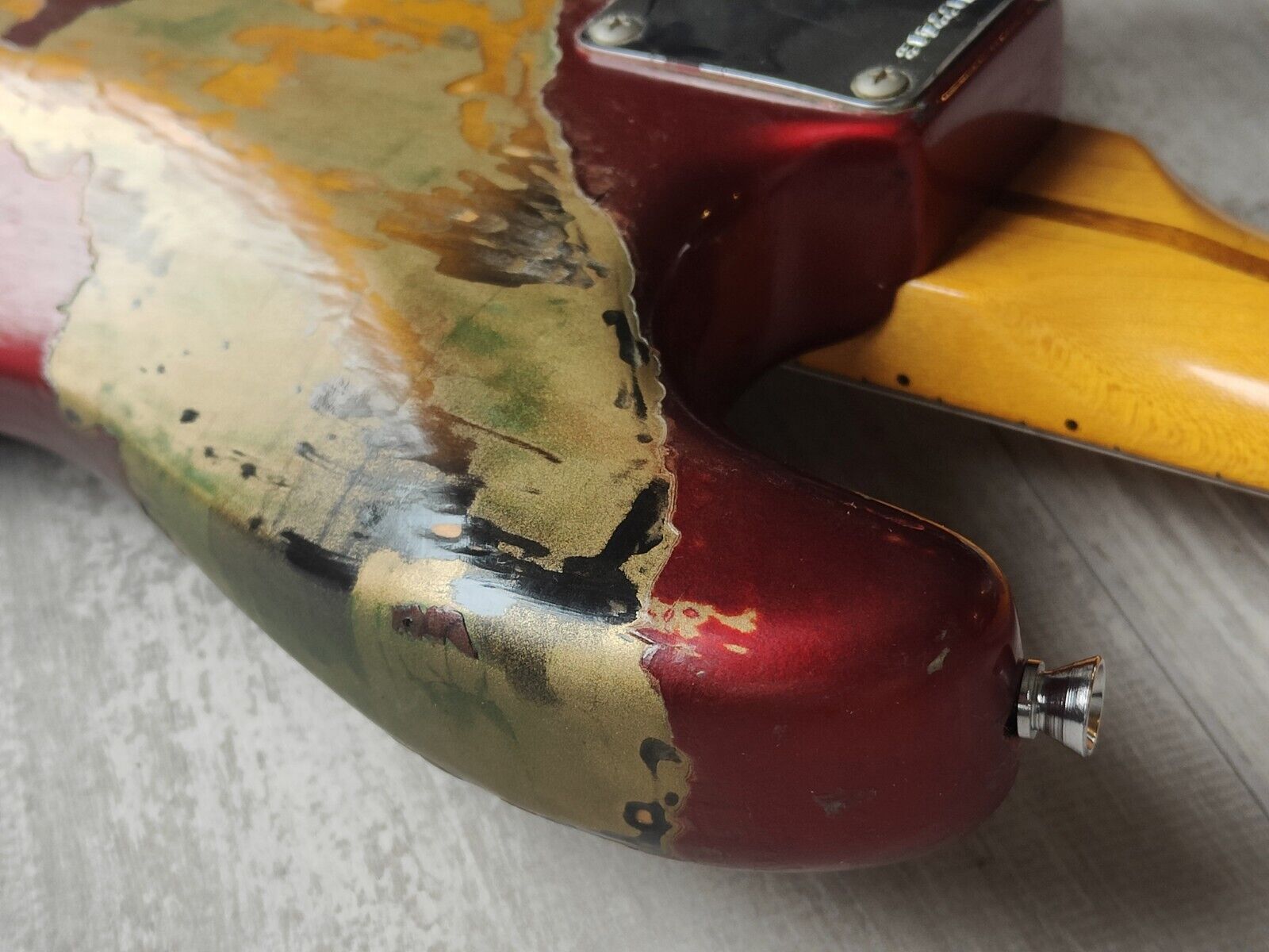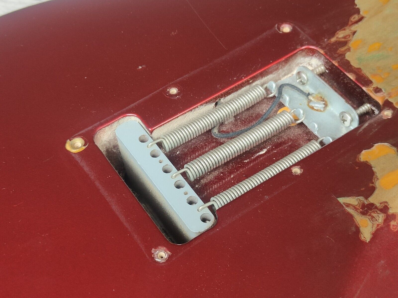 American made in 2000, this '57 Reissue American Vintage Stratocaster lived one hell of a life before arriving here with us. Featuring a heavy relic to the nitro Candy Apple Red finish on an alder body bolted to a maple neck (7.25" radius with lightly rolled fretboard edges), it weighs 3.5kg's. Fender stamped saddles and vintage style tuners, it's loaded with the original cloth wired single coil pickups controlled by a three-way pickup selector. One tone pot has been replaced along with a replacement strap button, otherwise it appears to be all original.
