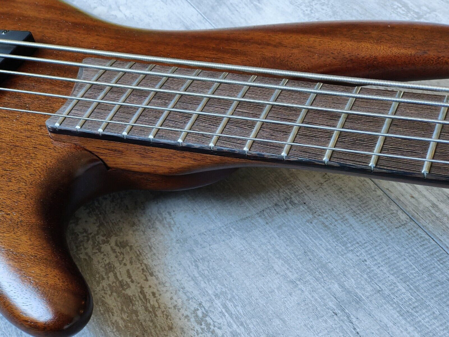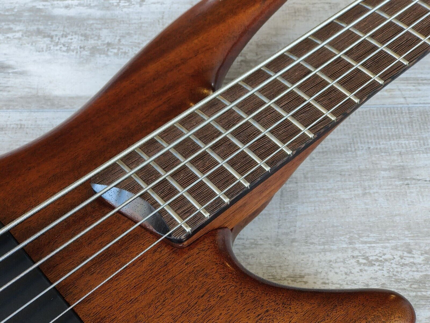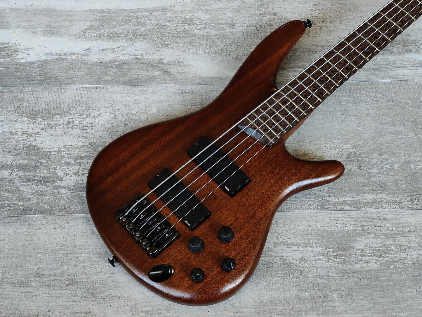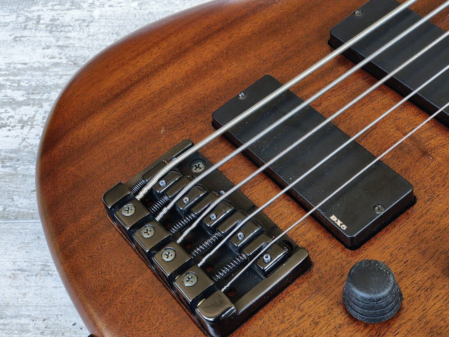 Double-cutaway mahogany body bolted to a SR5 wenge and bubinga neck with a 24-fret wenge fingerboard, it weighs 3.6kg's. Components include an Accu-cast B25 fixed bridge with 16.5mm string spacing, a pair of Ibanez DX-5 humbucking pickups, a Vari-Mid preamp with 3-band EQ and Gotoh tuning machines.