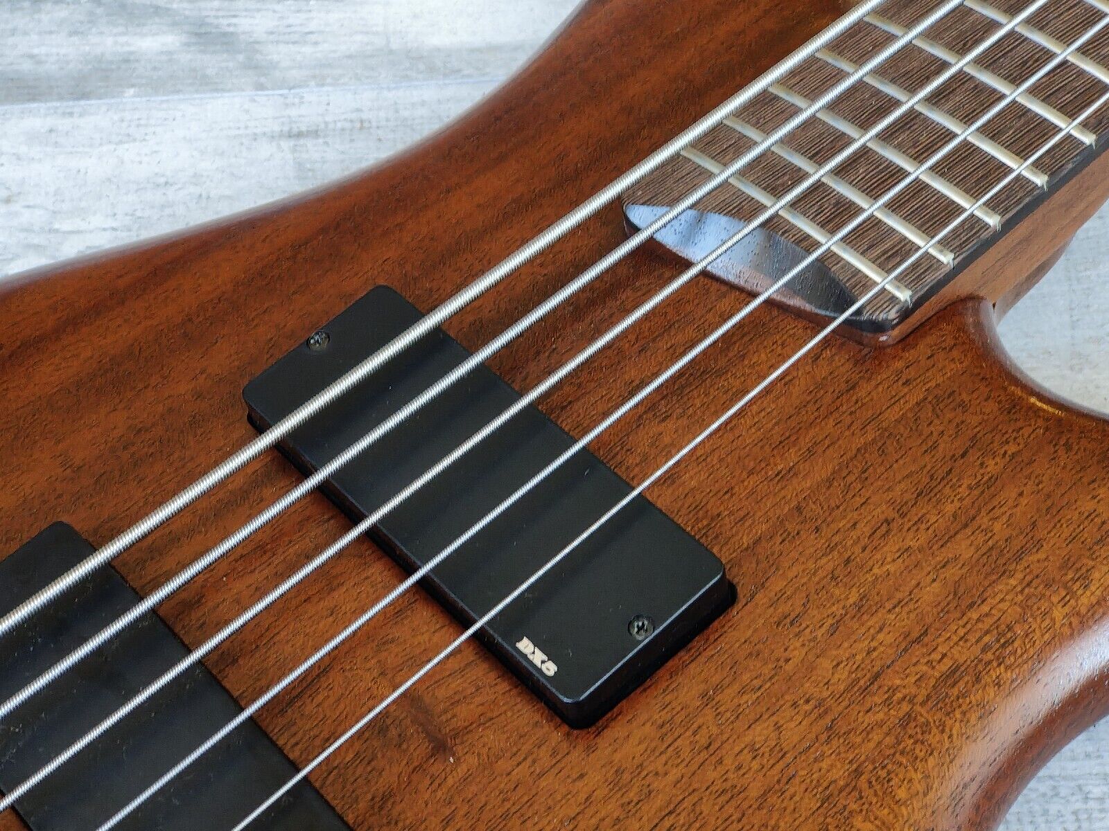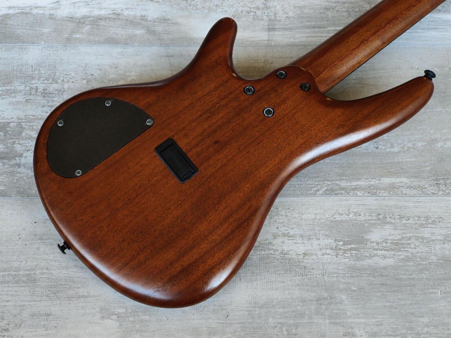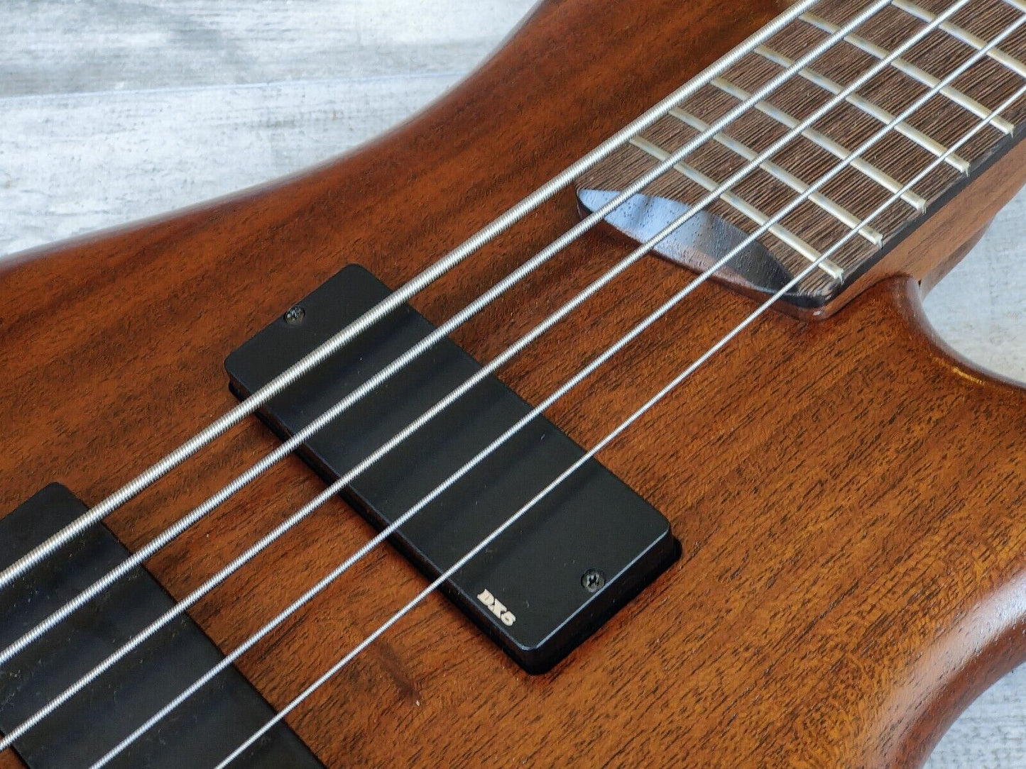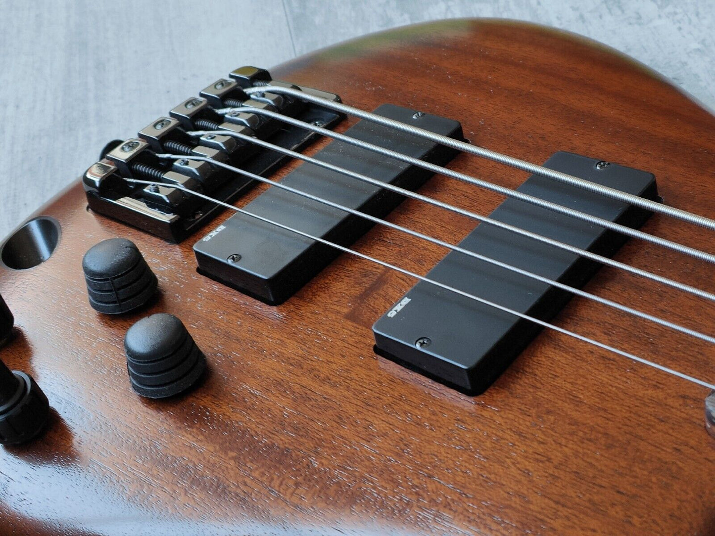 Double-cutaway mahogany body bolted to a SR5 wenge and bubinga neck with a 24-fret wenge fingerboard, it weighs 3.6kg's. Components include an Accu-cast B25 fixed bridge with 16.5mm string spacing, a pair of Ibanez DX-5 humbucking pickups, a Vari-Mid preamp with 3-band EQ and Gotoh tuning machines.