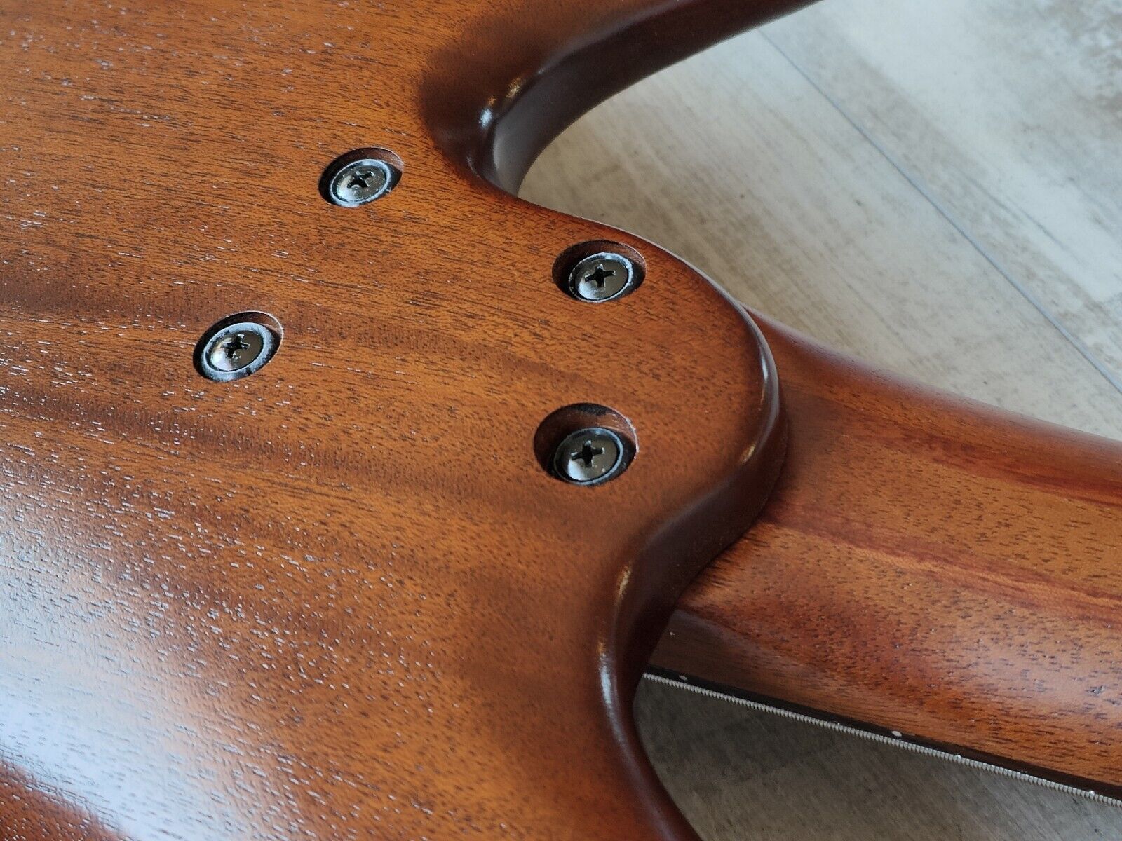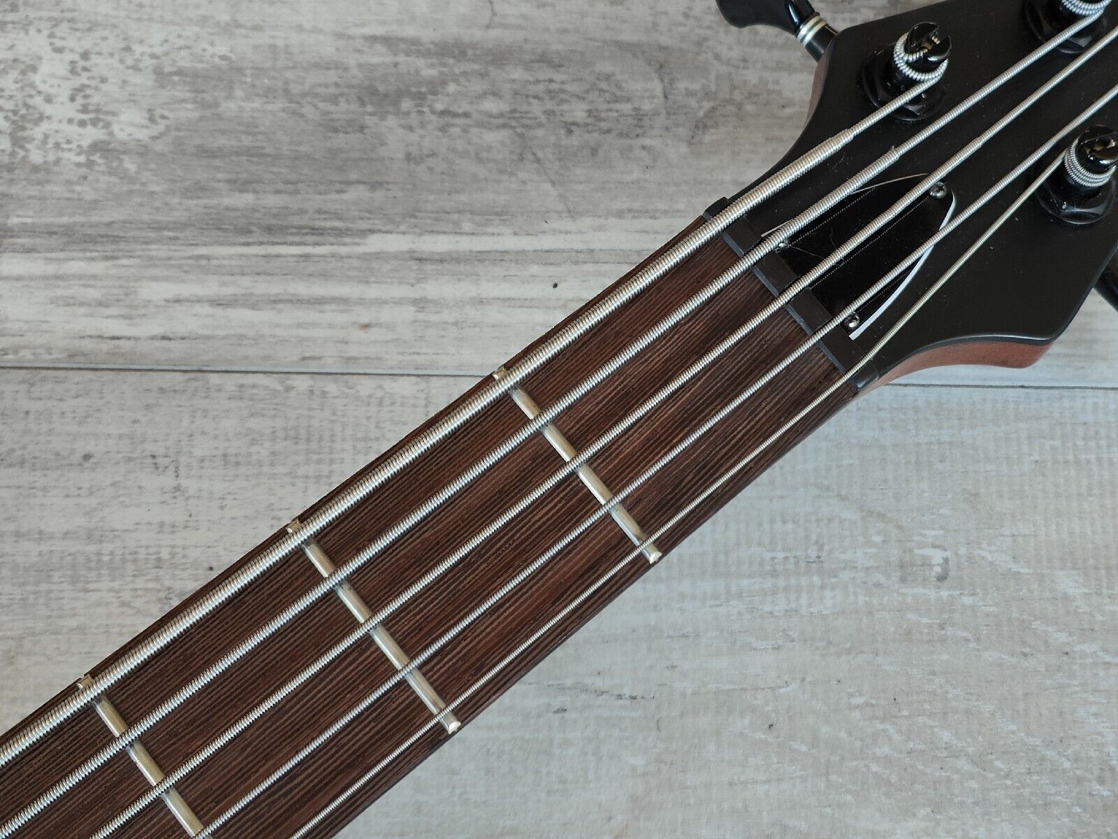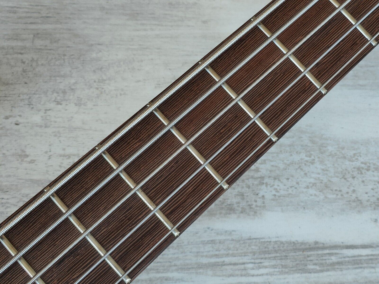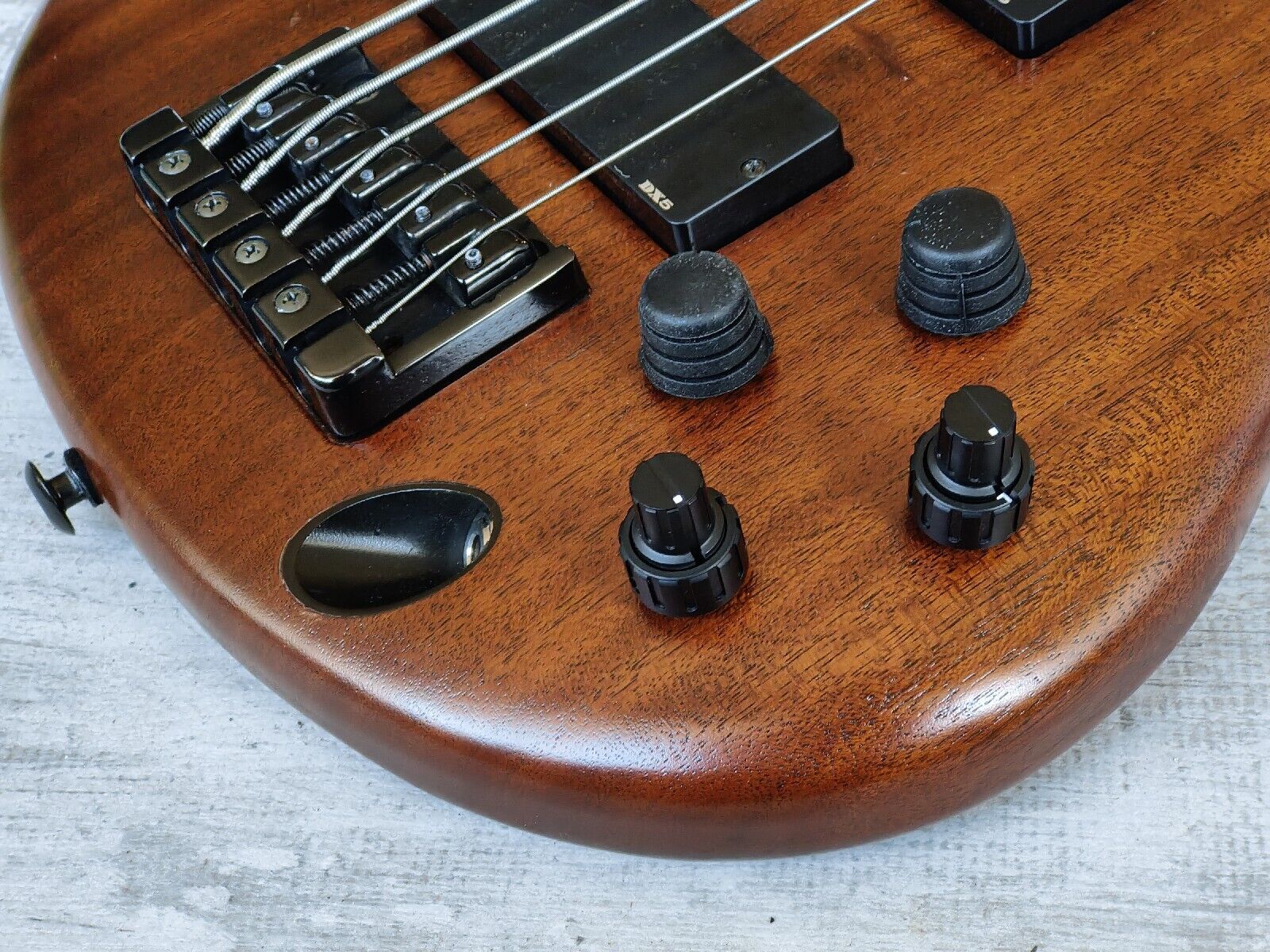Double-cutaway mahogany body bolted to a SR5 wenge and bubinga neck with a 24-fret wenge fingerboard, it weighs 3.6kg's. Components include an Accu-cast B25 fixed bridge with 16.5mm string spacing, a pair of Ibanez DX-5 humbucking pickups, a Vari-Mid preamp with 3-band EQ and Gotoh tuning machines.