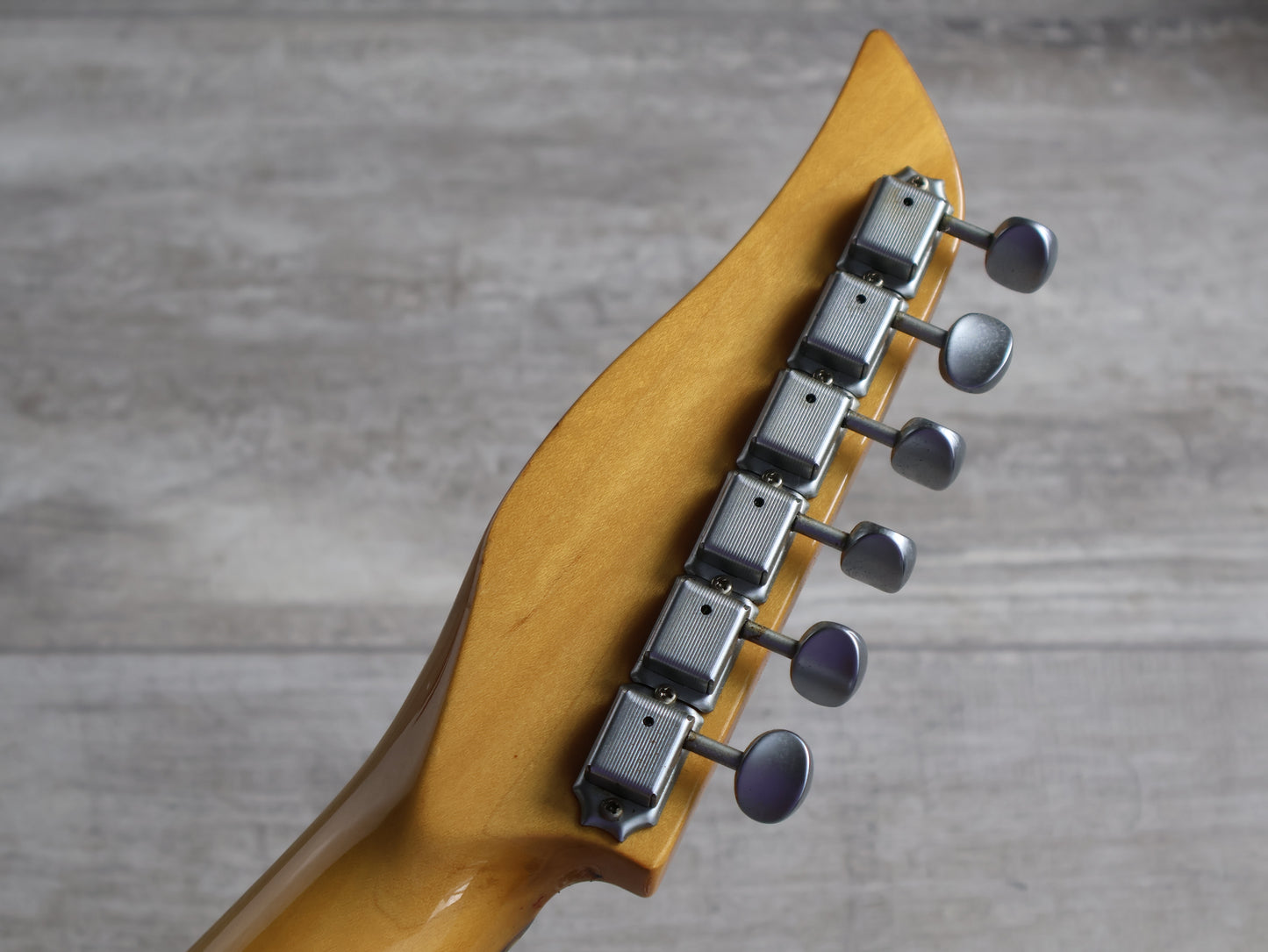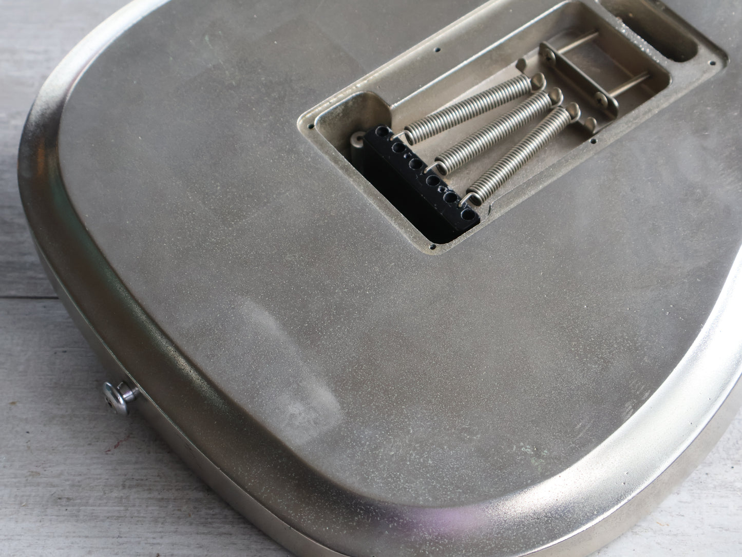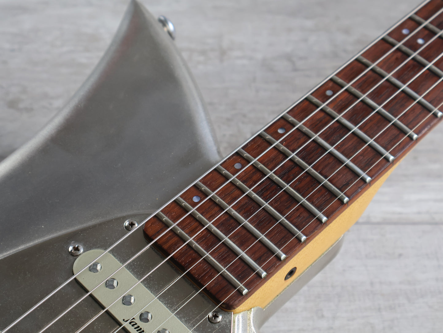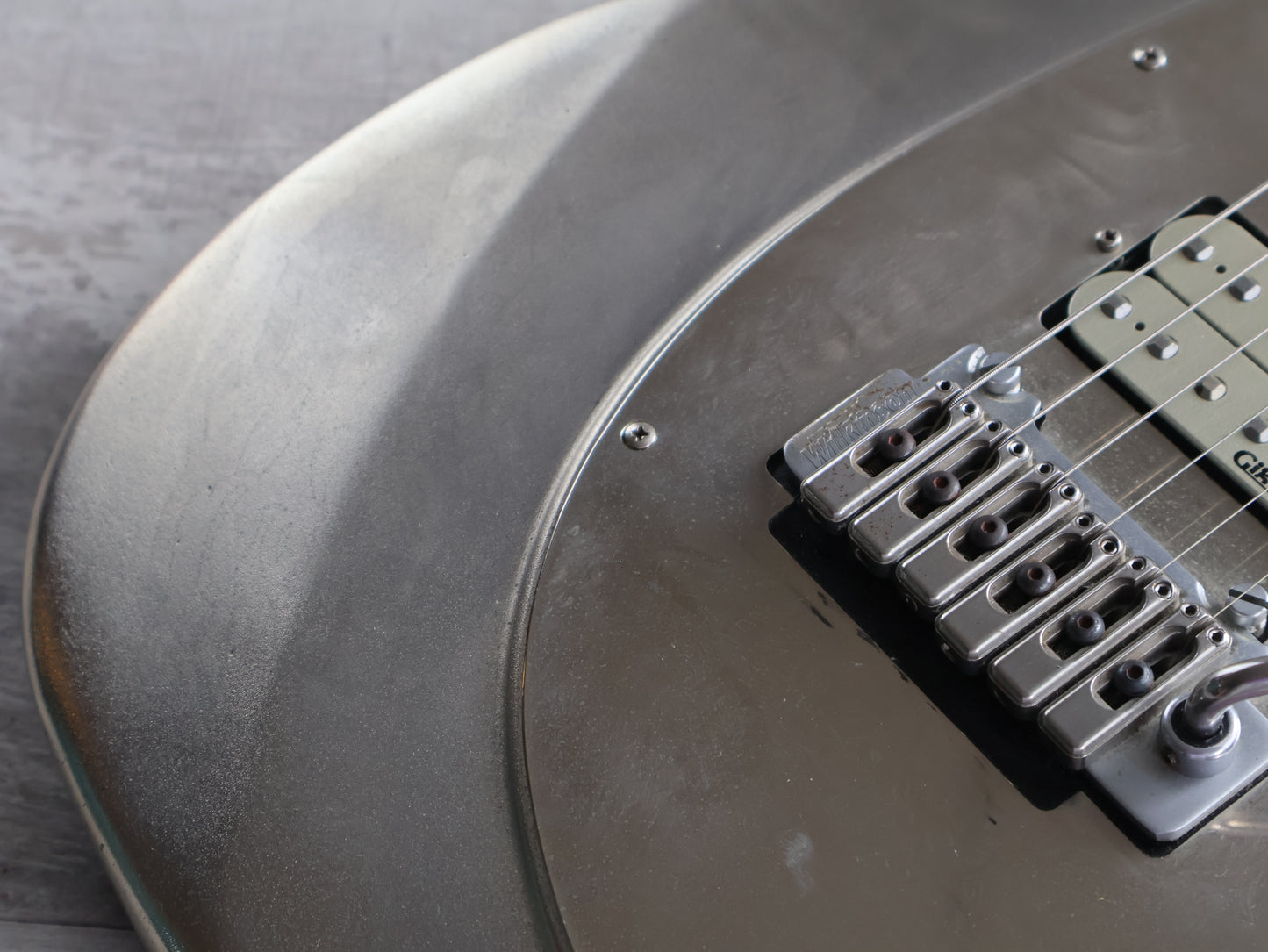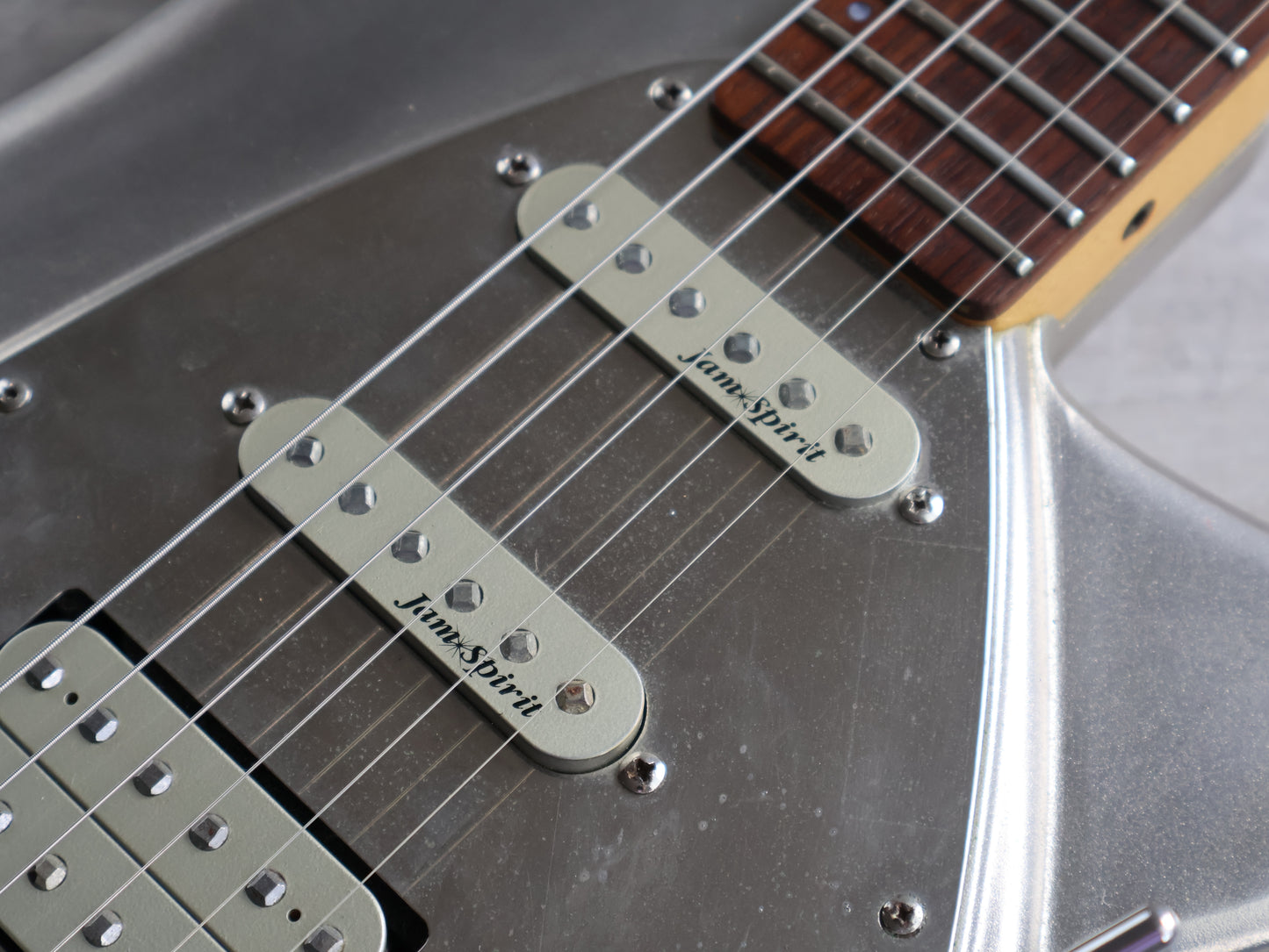 Tokai Talbo (Tokai Aluminium Body) guitars were introduced in 1980 and feature a solid aluminium body with a chamber underneath the pickguard. These were known for having a crystal clear clean tone that resonates beautifully both acoustically and plugged-in. Rosewood board and a maple neck, loaded with a 5-way selector controlling a set of Jam Spirit/Gigmax HSS pickups, weighs 4kg's.