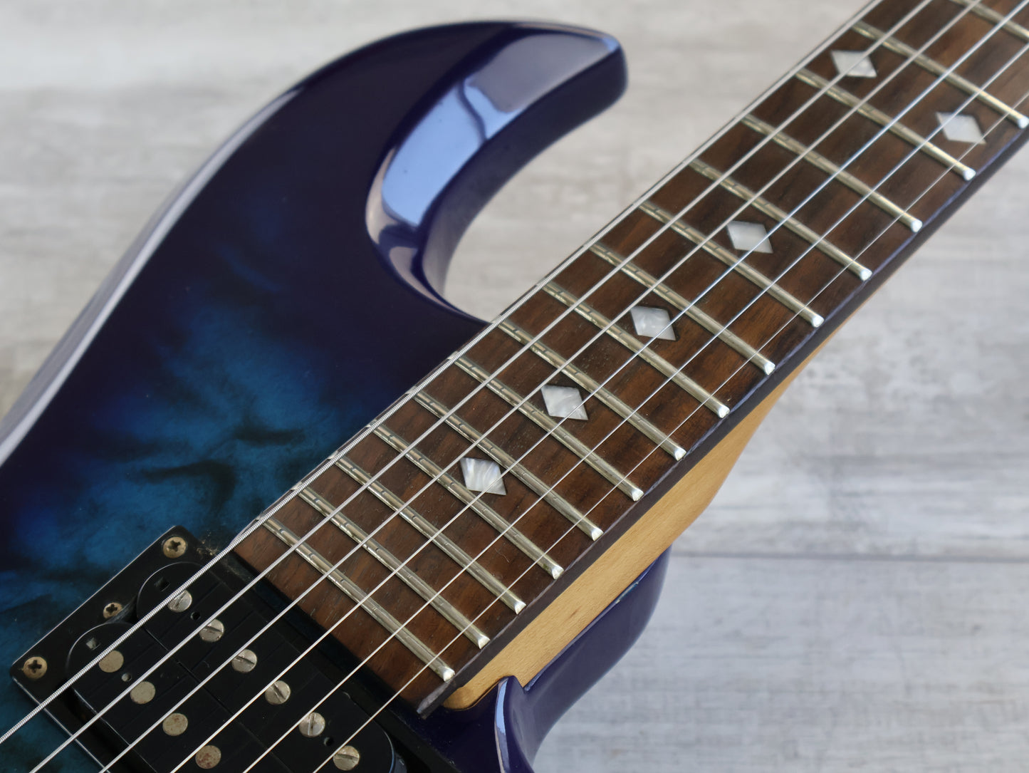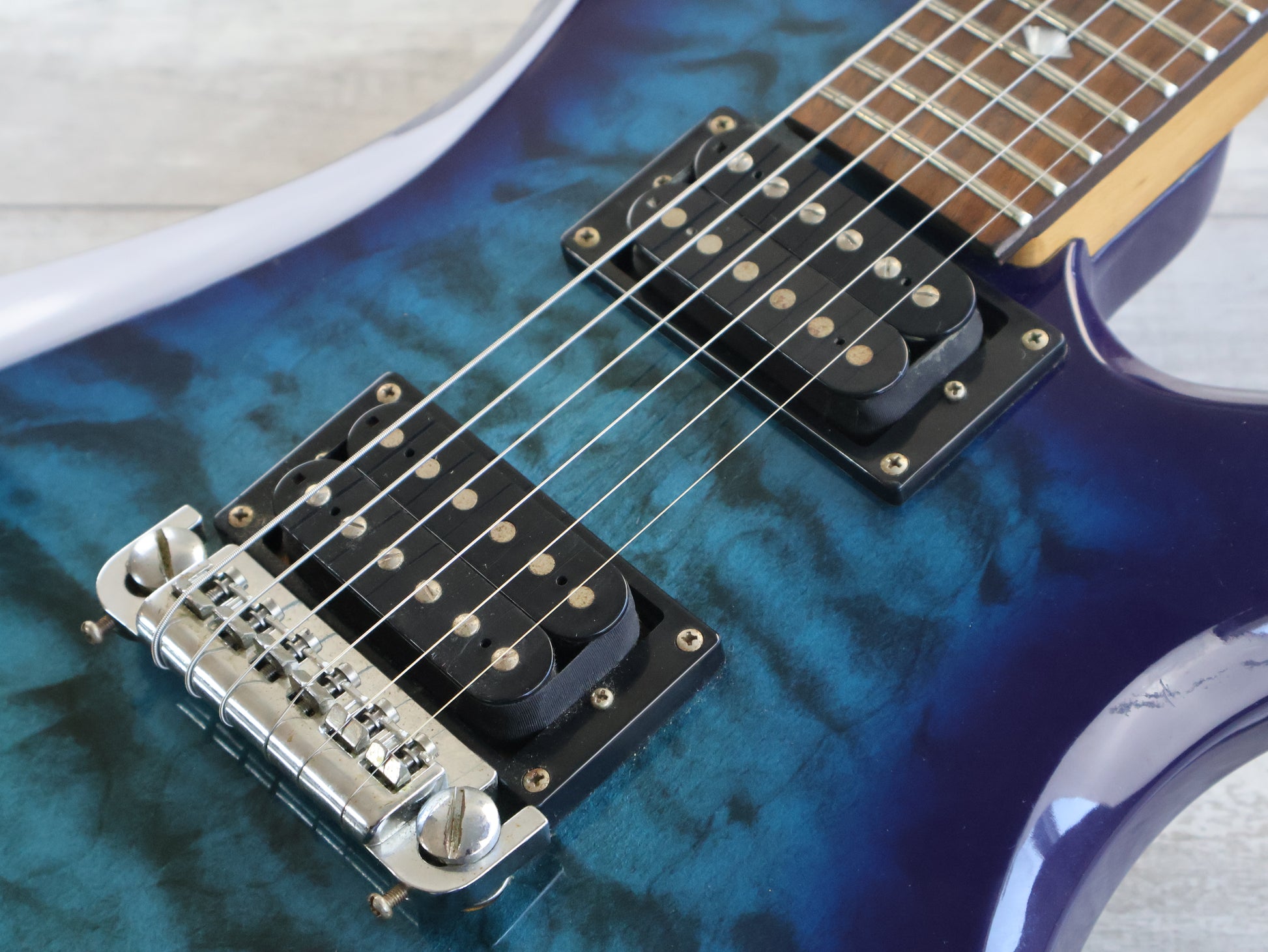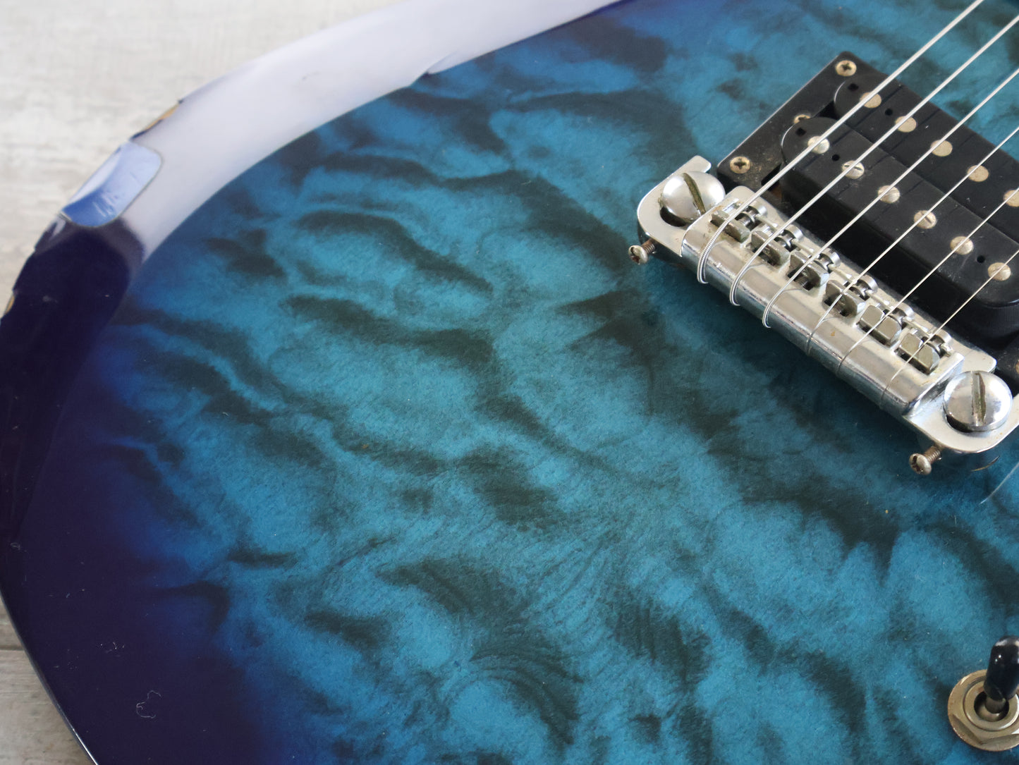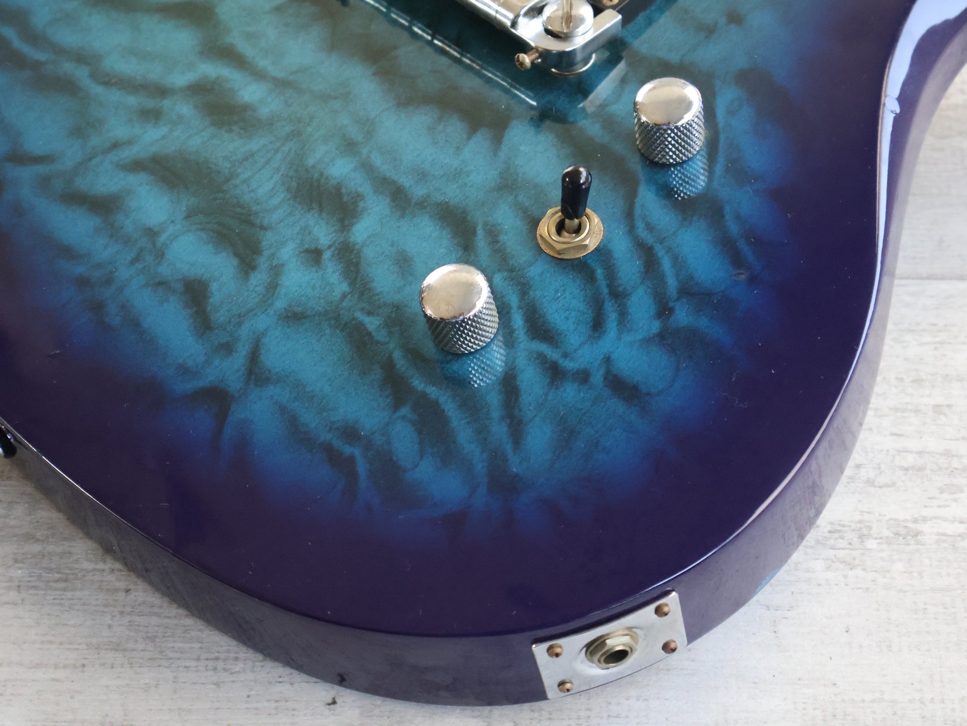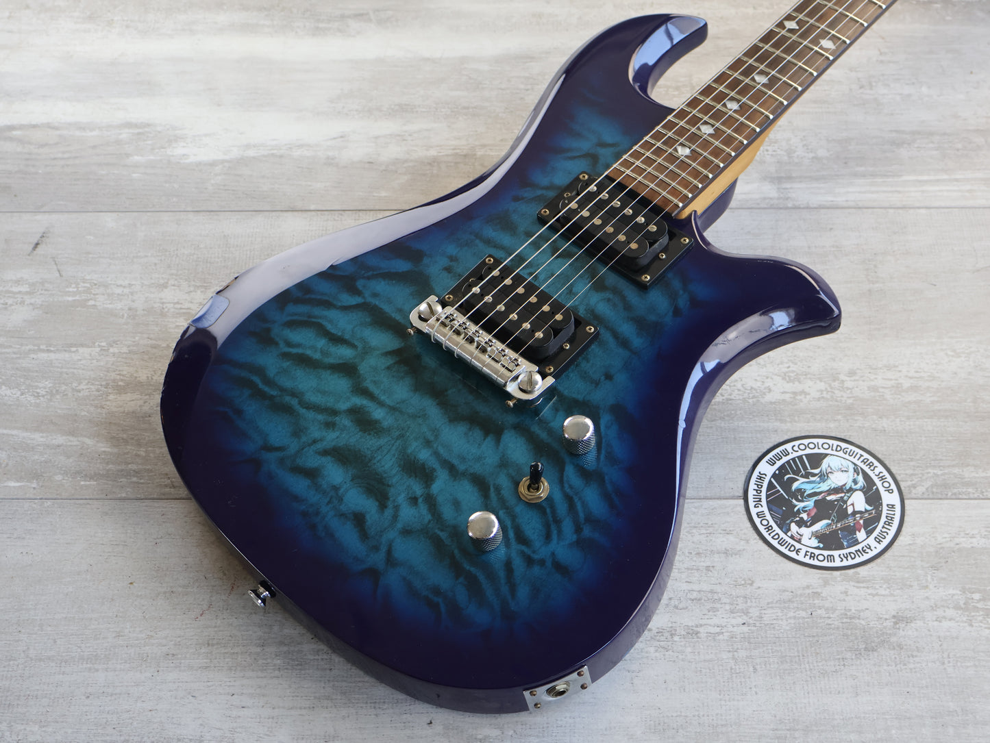 Made in Korea in the 2000's. Gorgeous aquamarine sunburst finish on a solid body with a laminate quilt top, it's got a smooth maple neck and a 24 fret rosewood fingerboard (628mm scale length) and weighs 3.4kg's. Looks to have the original pickups and hardware.