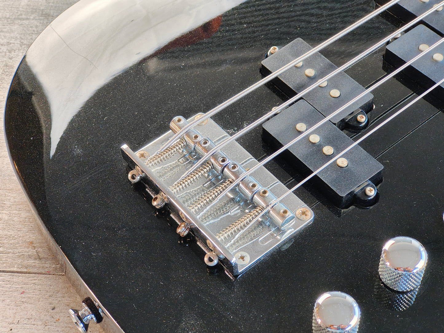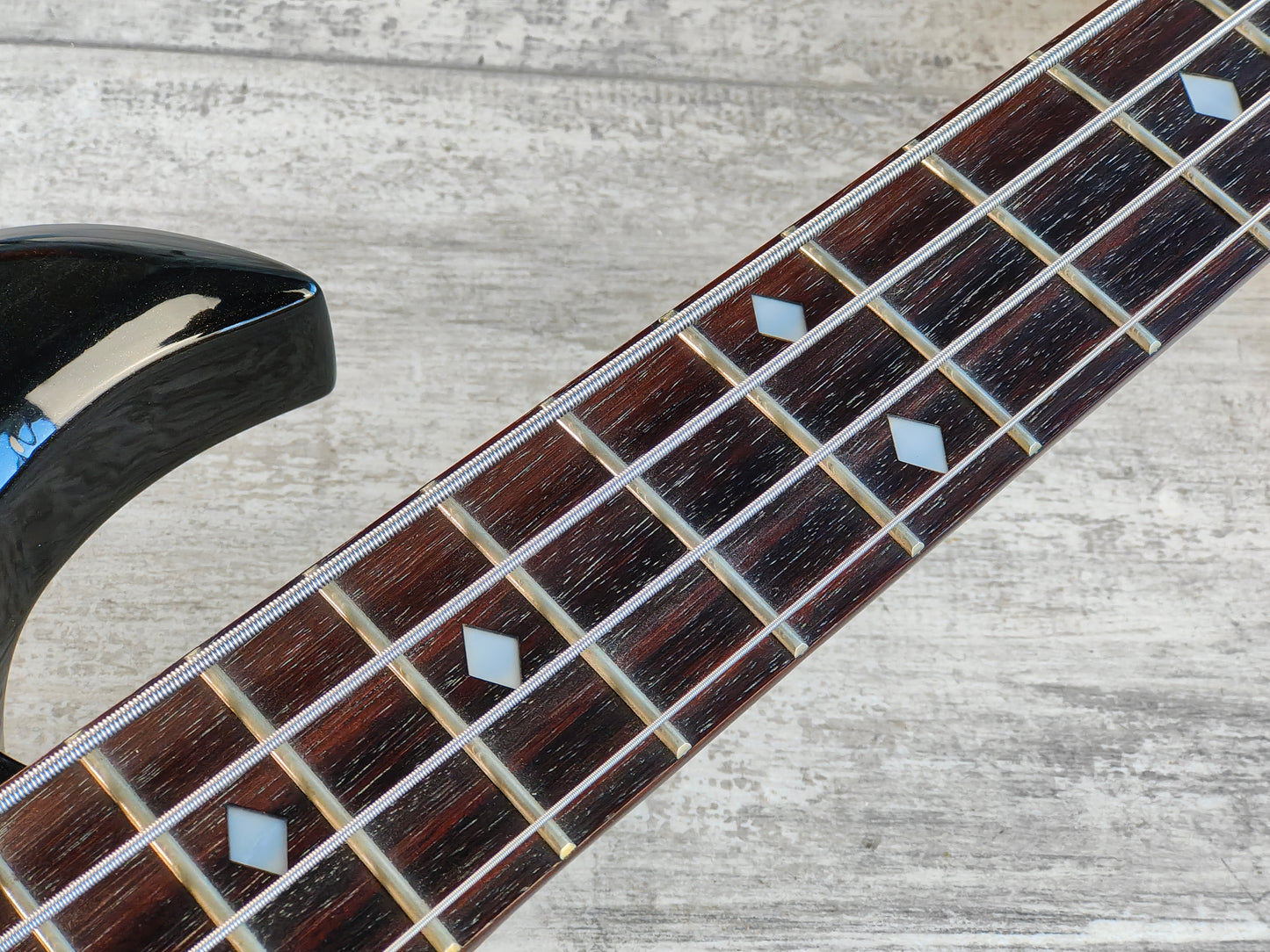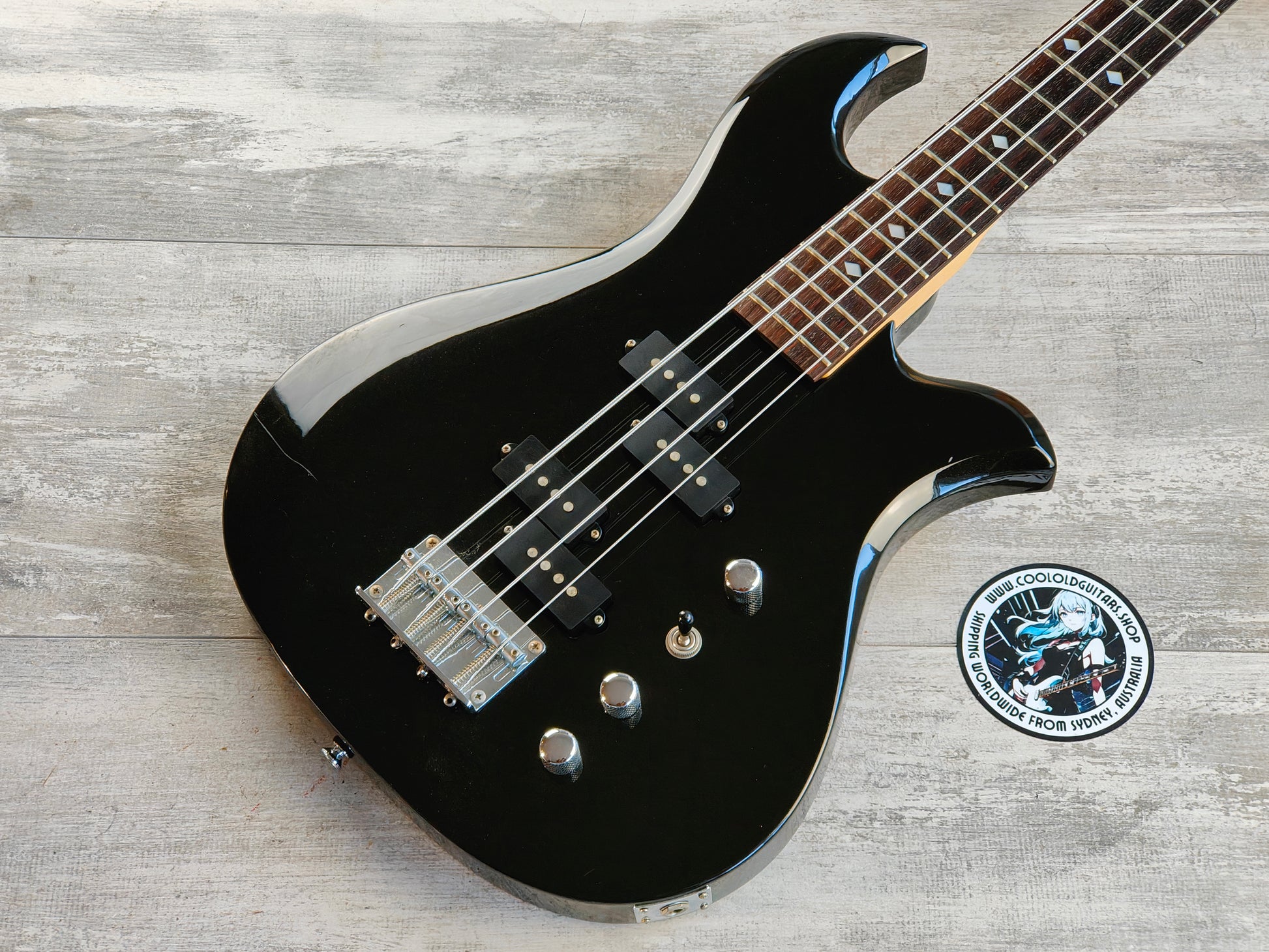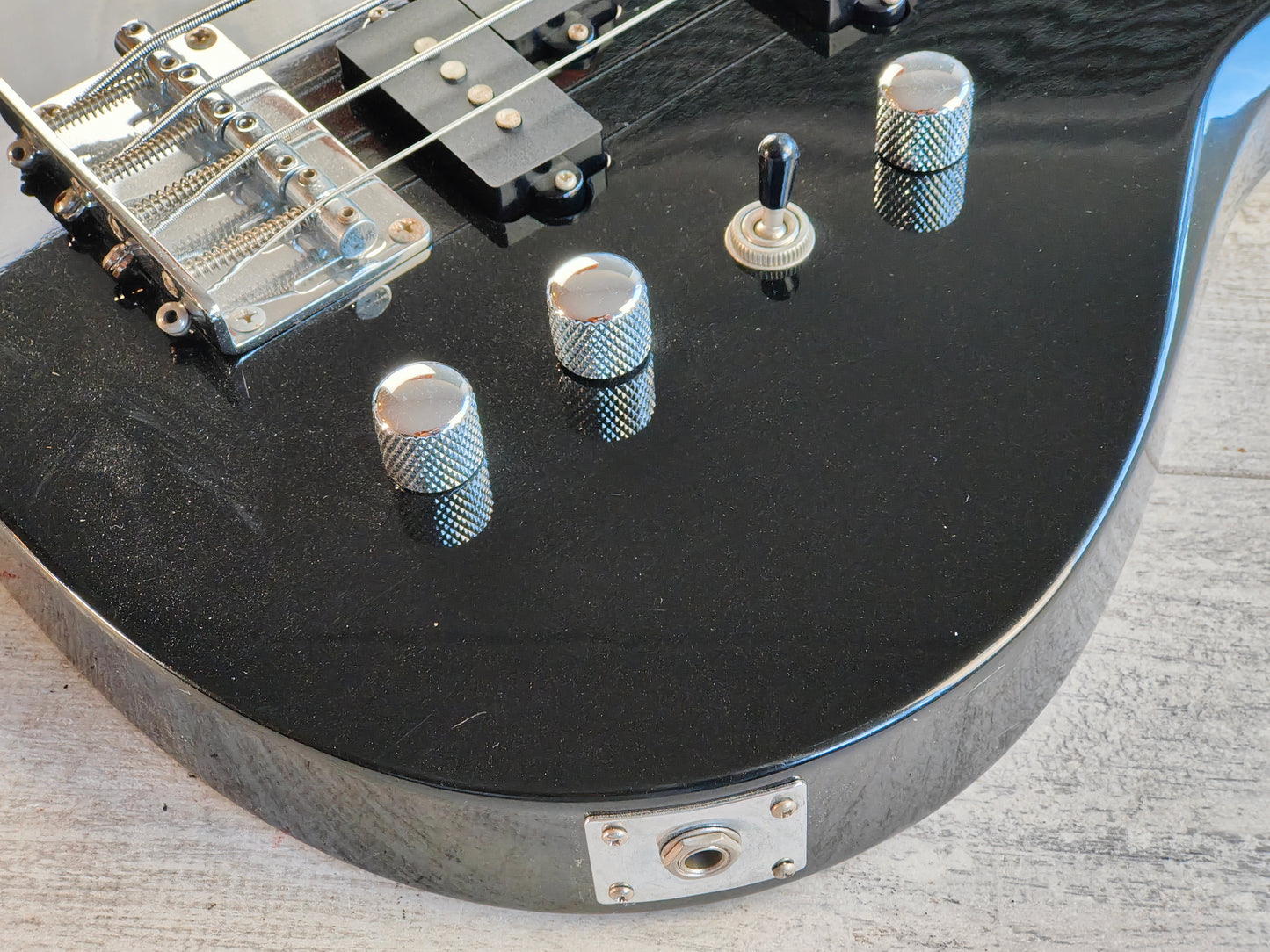 Chinese made in the late 2000's, this BC Rich Eagle Bass features a solid body with a metallic black finish bolted to a maple neck with a 24 fret rosewood fingerboard (34" scale length) and weighs 3.7kg's. Loaded with a pair of P style passive pickups controlled by independent volume controls, a master tone control and a three-way pickup selector.