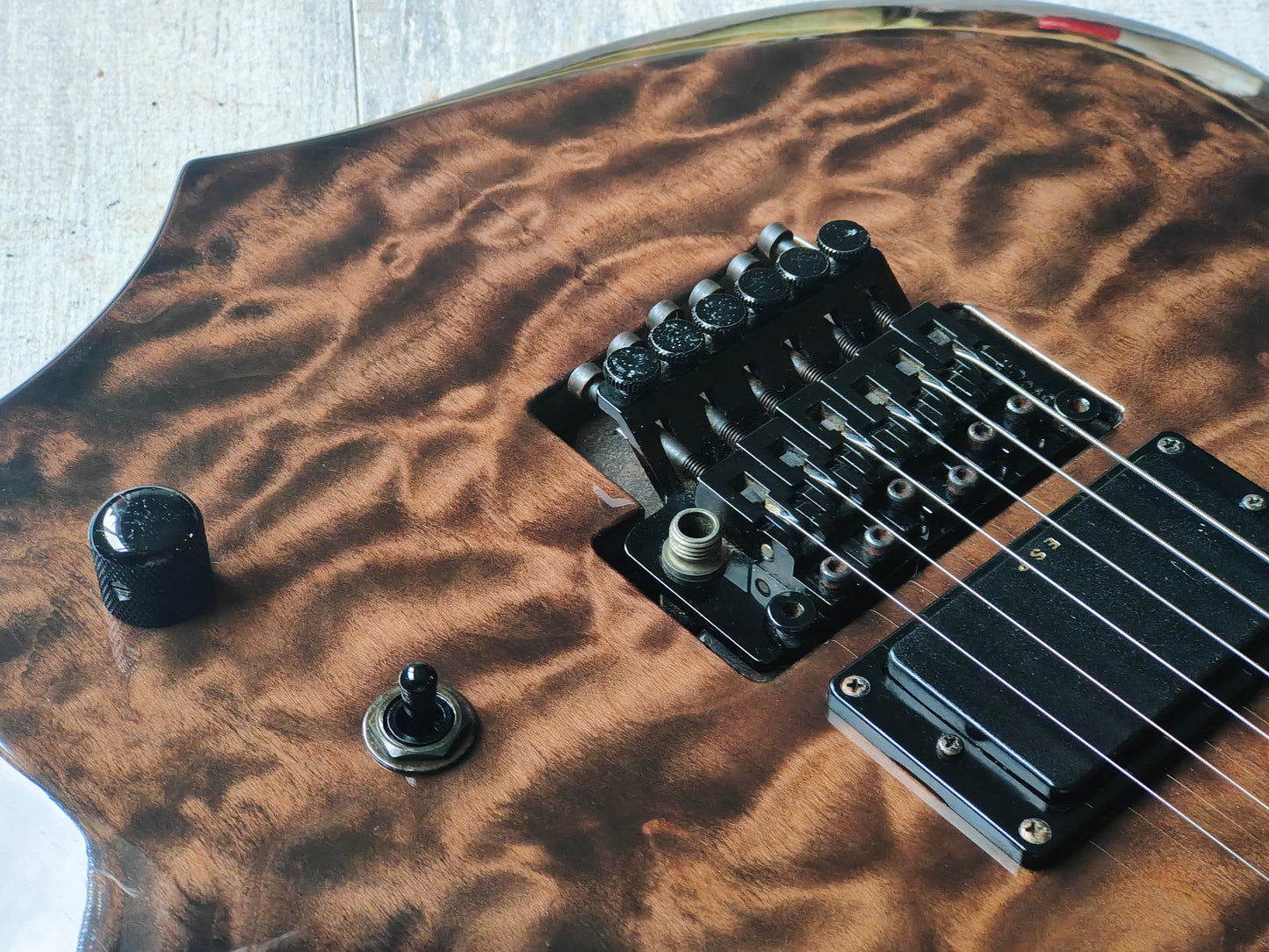 Favoured by musicians in the heavier genres for many years, the ESP F-series are known for their confronting yet comfortable shape and huge sound output. Made in Japan by Edwards, this is an artist model for Aiji of the band Pierrot. Ash body with a laminate maple top, maple neck and rosewood fingerboard with partial binding, it weighs 3.3kg's. 24 frets with a 648mm scale length, it's loaded with ESP branded HS pickups and a 3-way toggle controlled by a single volume knob. Great tuning stability thanks to the genuine Floyd Rose locking tremolo system.