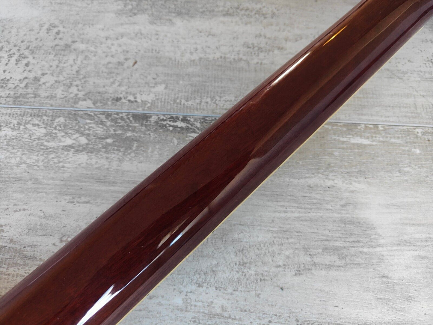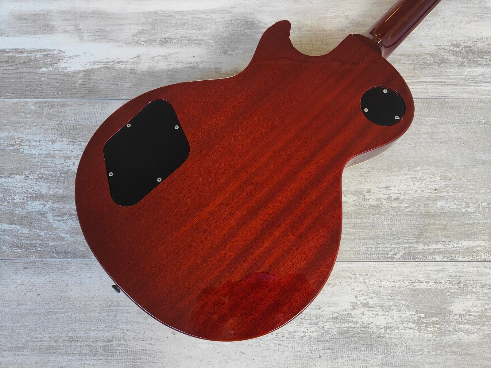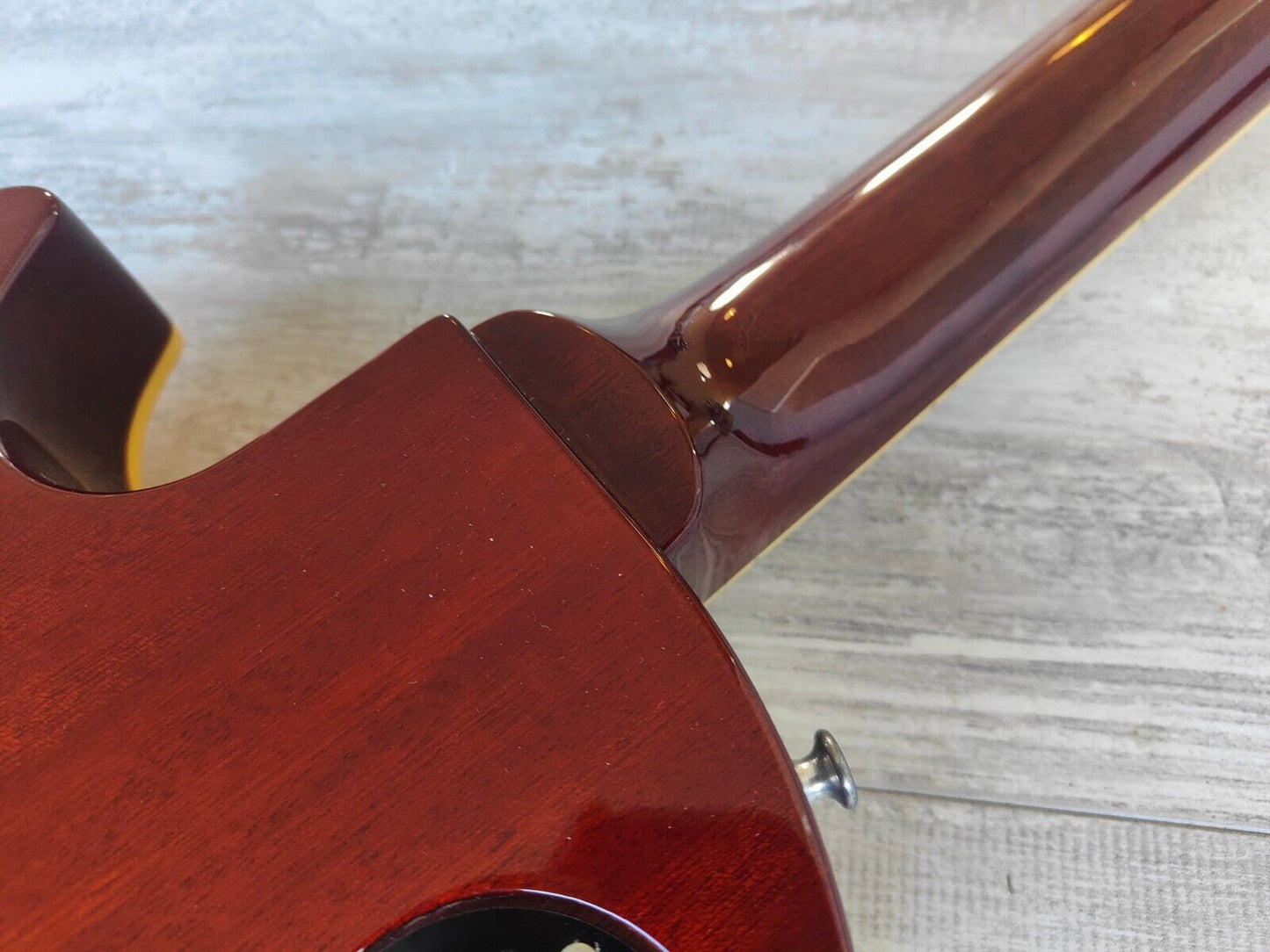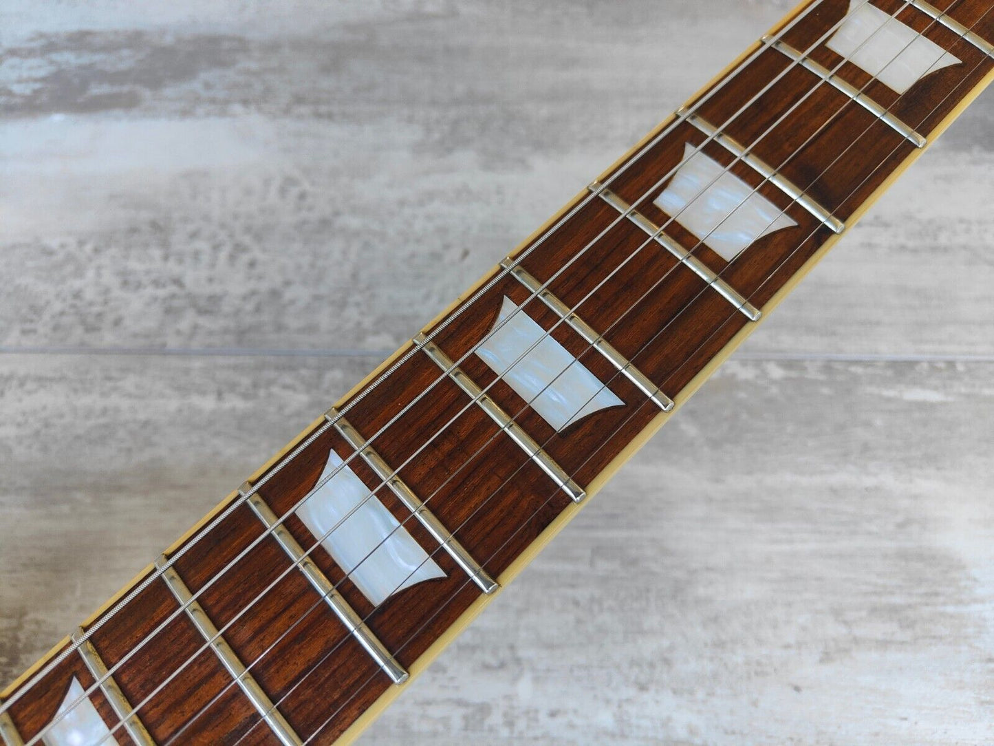 Solid carved maple top with a mahogany back and neck (feels like a '59 profile) with a rosewood fingerboard, it weighs a whole 4.7kg's and you can hear every single gram when you plug it in. 12" radius with a 43mm nut width.