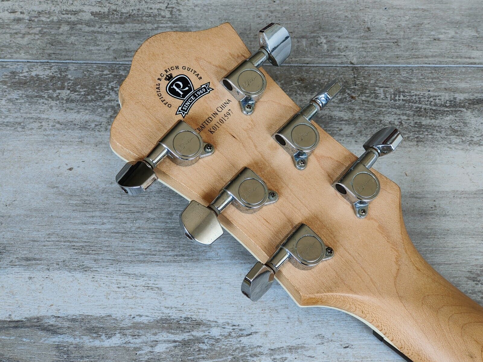 With its sleek and curvy BC Rich body design, the Masterpiece Mockingbird offers incredible detail with endless tone at a price that will shock you. The Masterpiece Mocking bird features an elegant arched top with a AAA quilted maple veneer. The bolt-on neck gives this masterwork of a guitar its 24-5/8 inch scale. The 24 jumbo fret, rosewood fingerboard provides octaves of playability while the string-through body design with a tune-o-matic bridge keeps incredible stability throughout this amazing instrument.