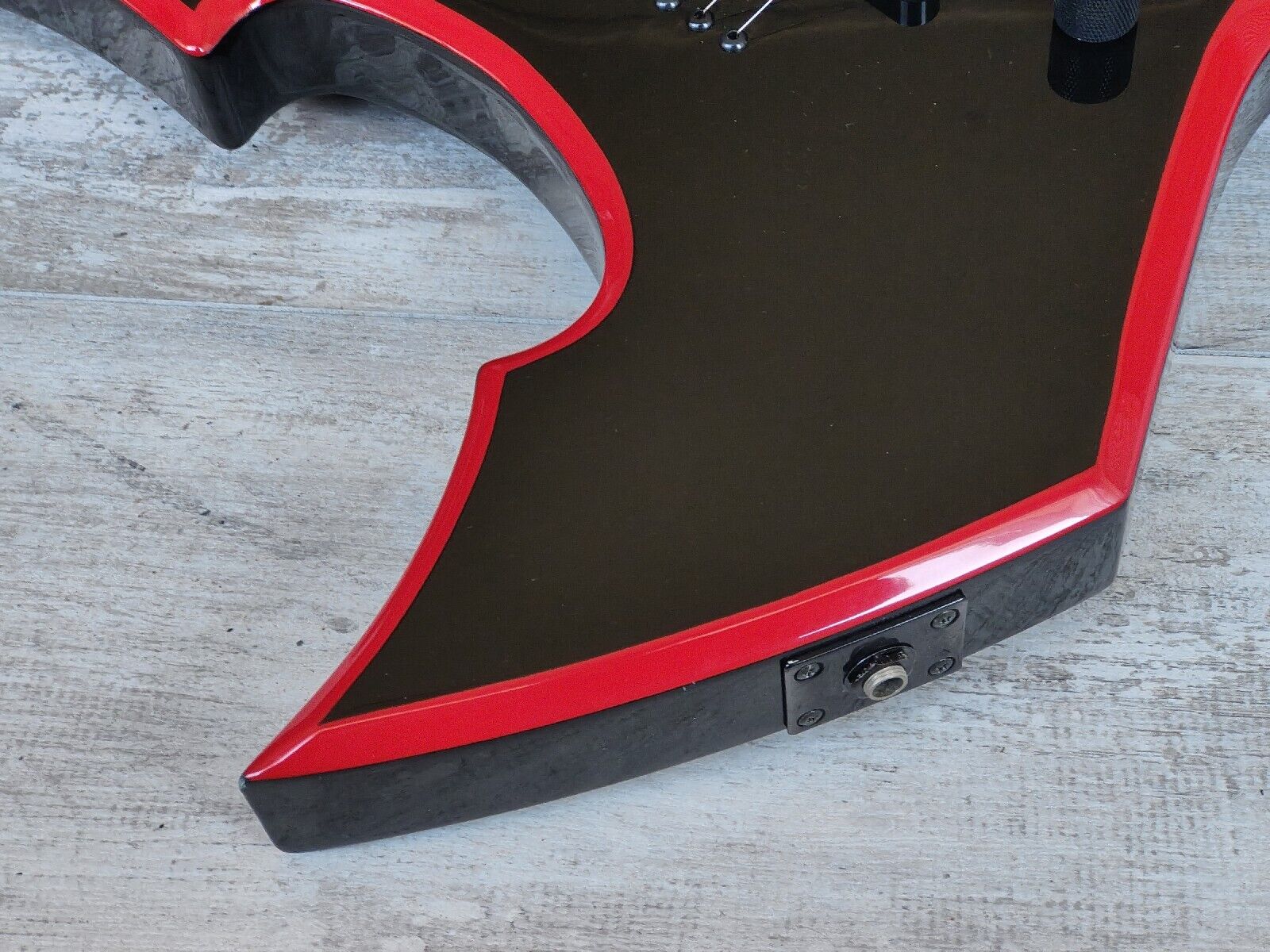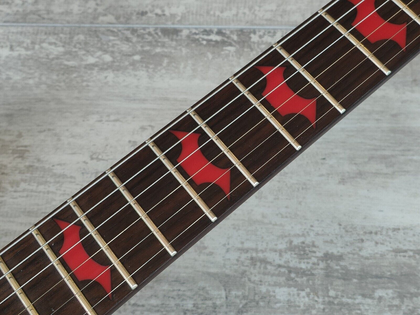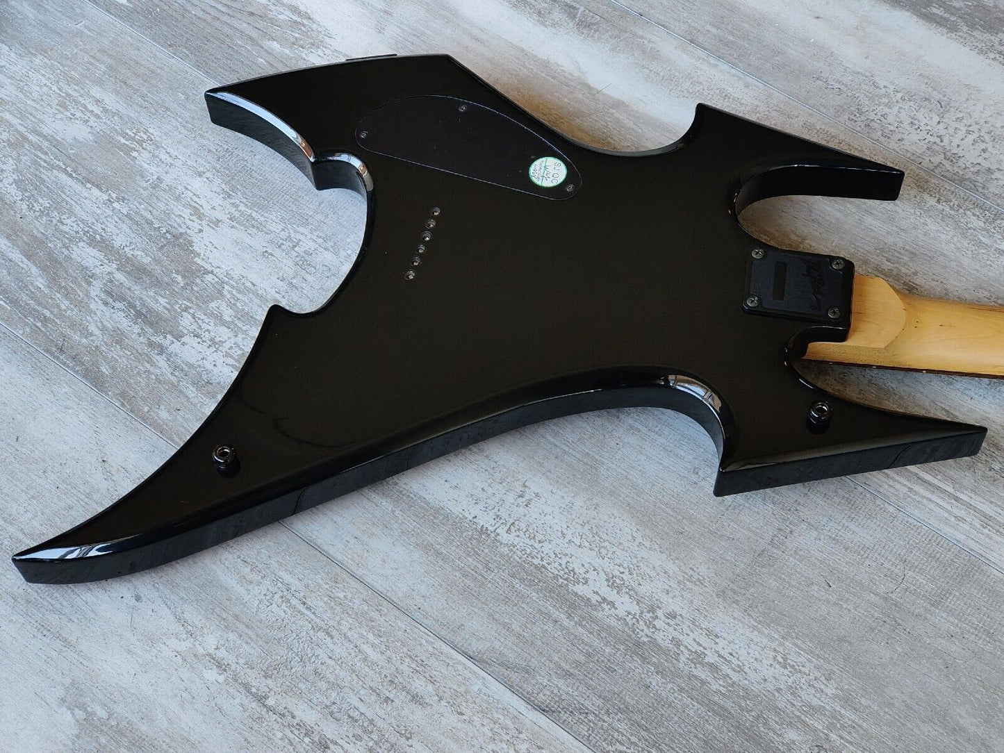 Chinese made in 2001, here's a compact weapon that also doubles as a guitar. 24 frets on a rosewood fingerboard with red inlays (648mm scale length), slim satin feel maple neck, it weighs 3kg's. Loaded with a single BC Rich branded humbucker controlled by a simple volume knob.