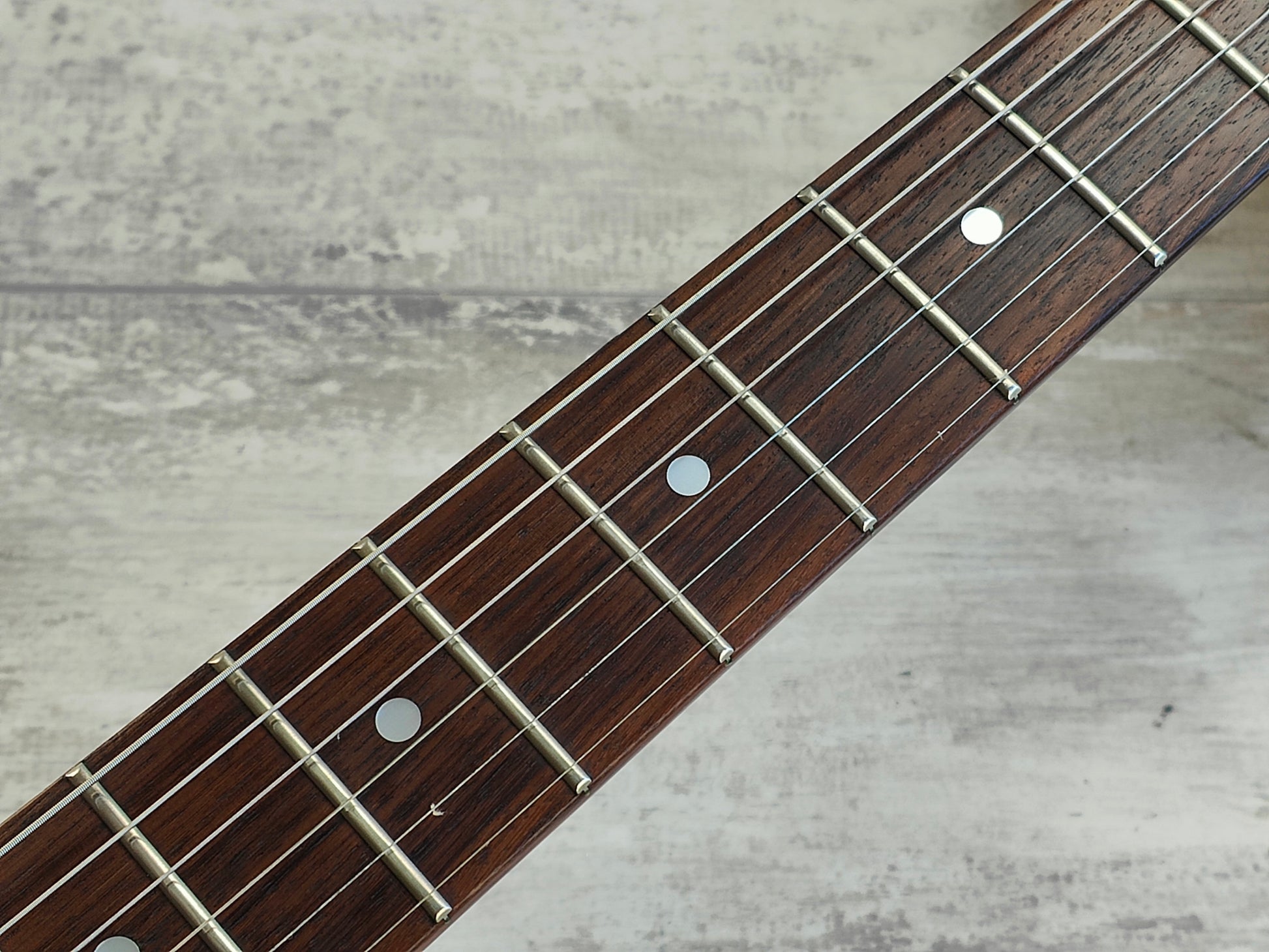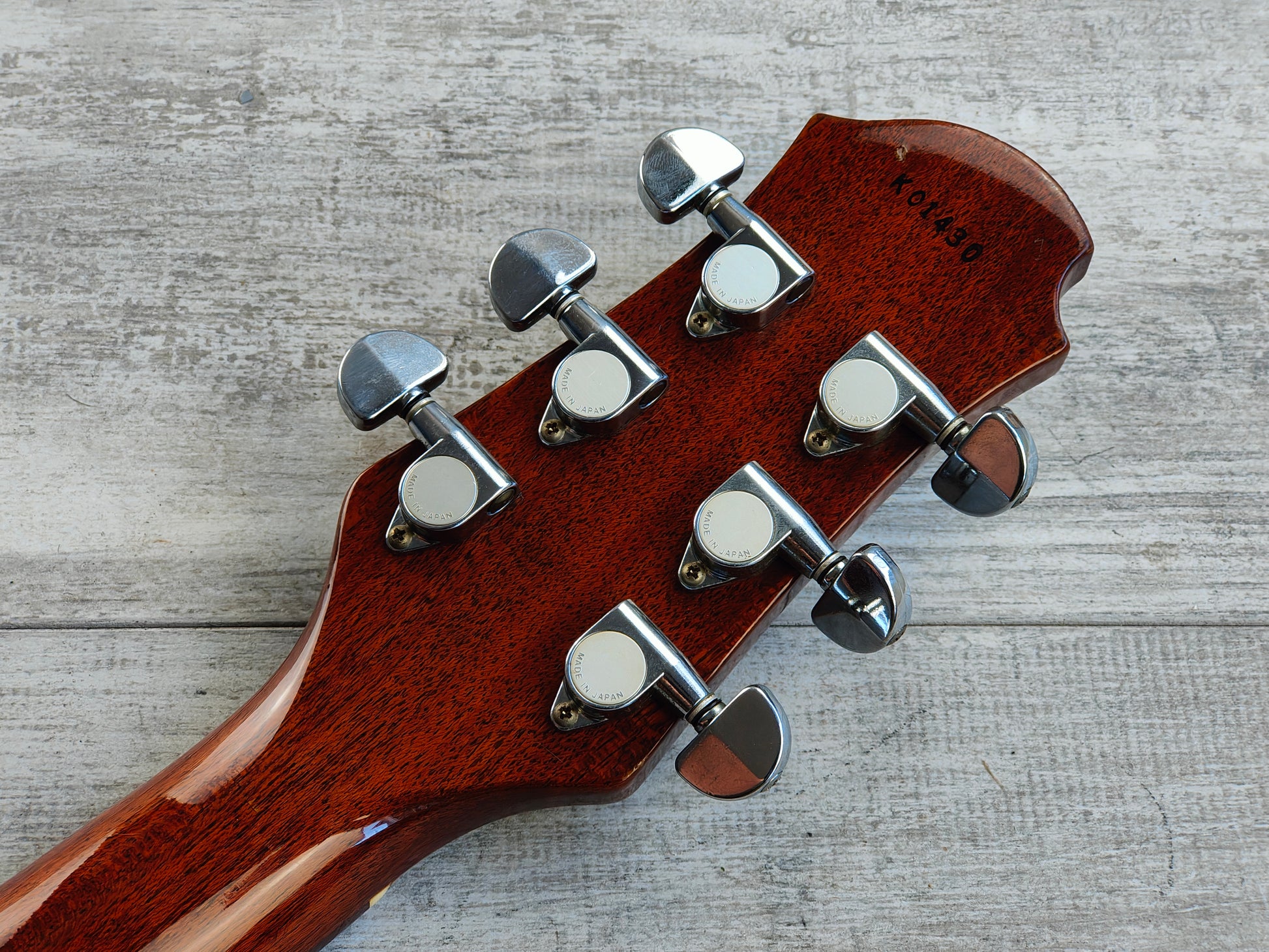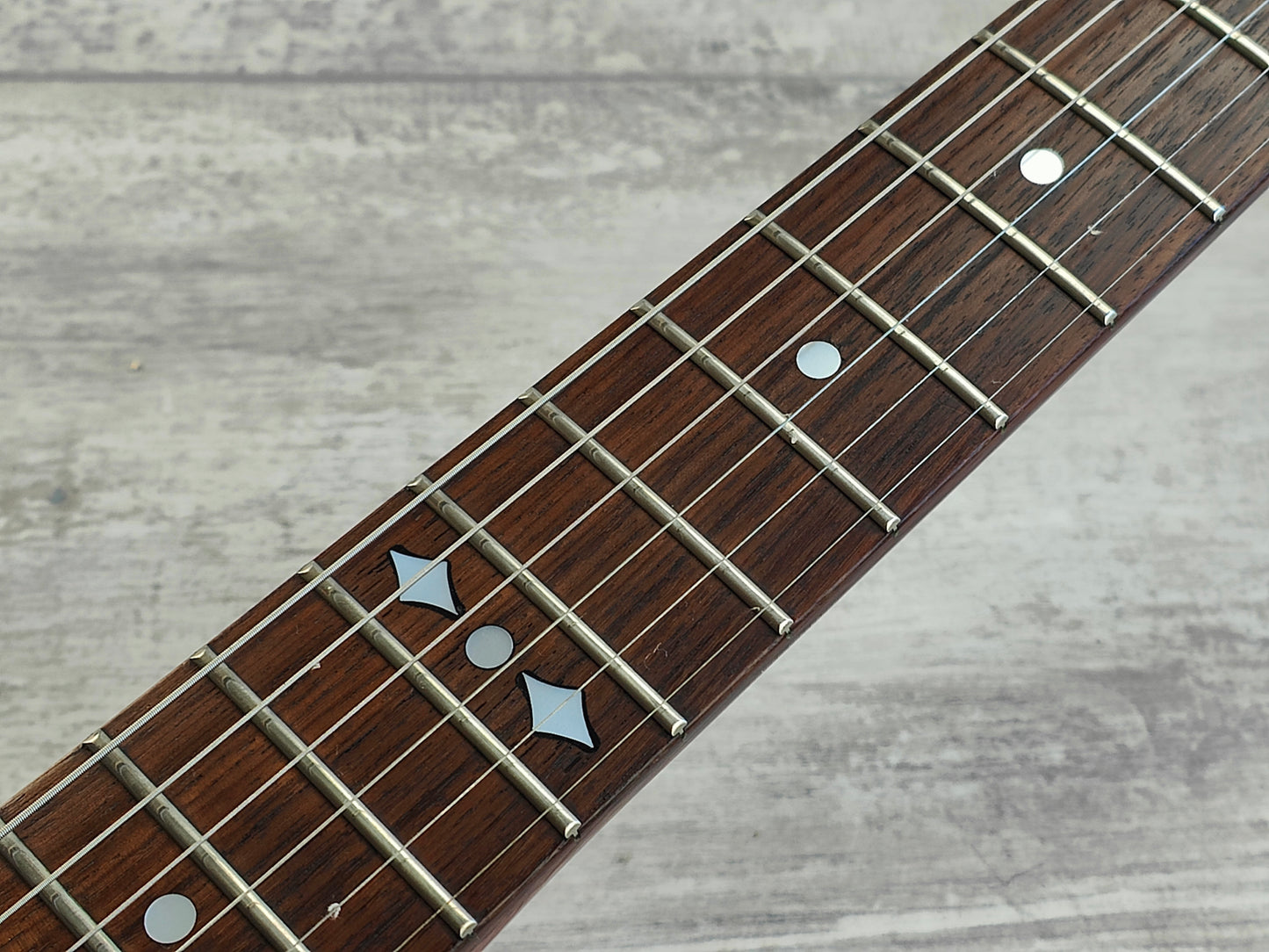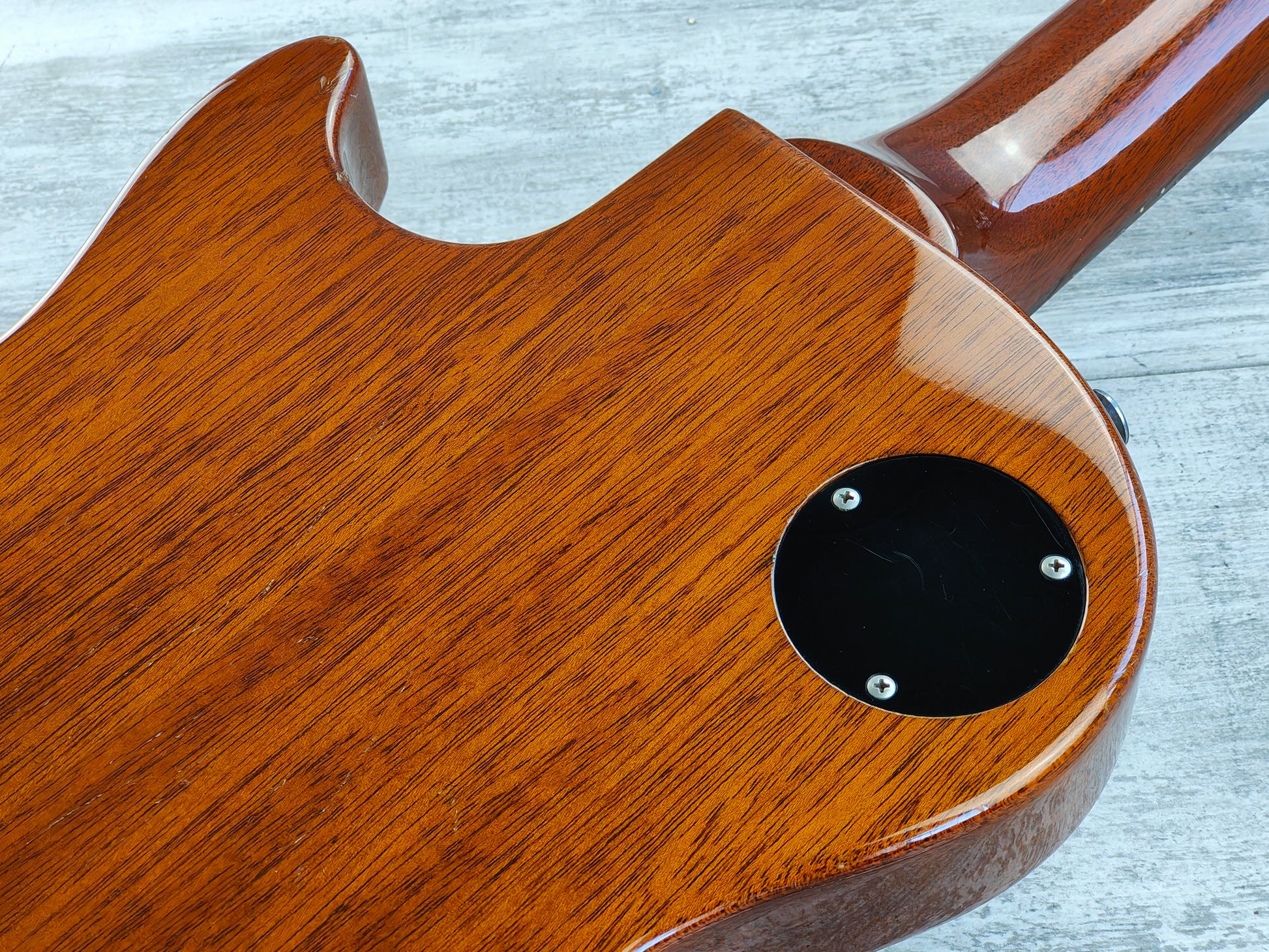 Made in Japan by the Fujigen factory for Musicland (a chain of music stores across Japan). Solid mahogany body with a Zemaitis style top and headstock inlays, set mahogany neck with a medium C profile and a 22 fret rosewood fingerboard, it weighs 3.8kg's.