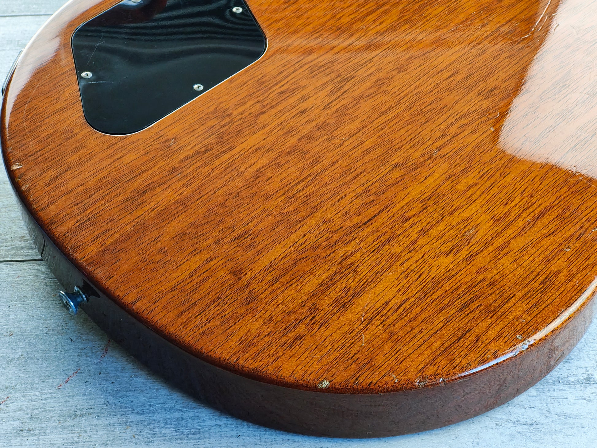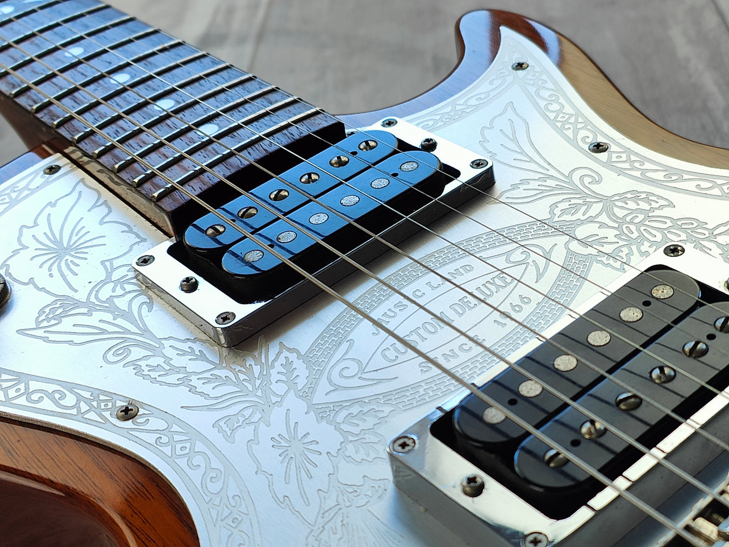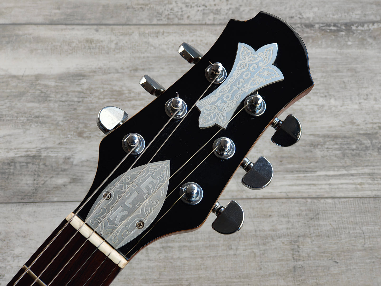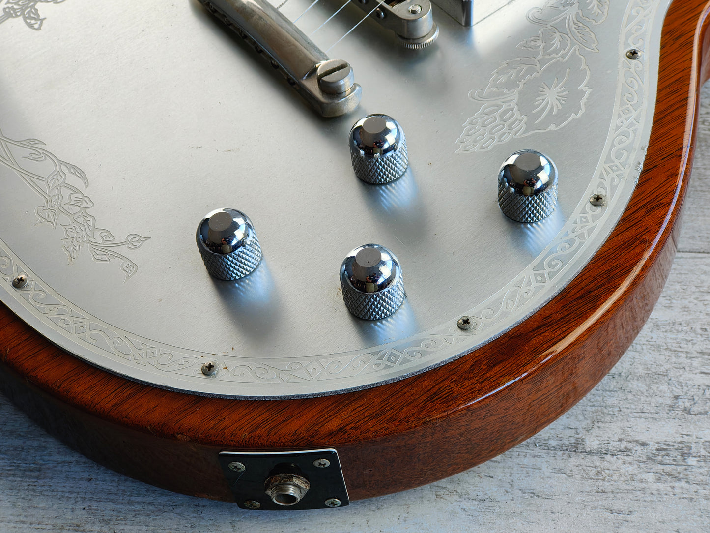 Made in Japan by the Fujigen factory for Musicland (a chain of music stores across Japan). Solid mahogany body with a Zemaitis style top and headstock inlays, set mahogany neck with a medium C profile and a 22 fret rosewood fingerboard, it weighs 3.8kg's.