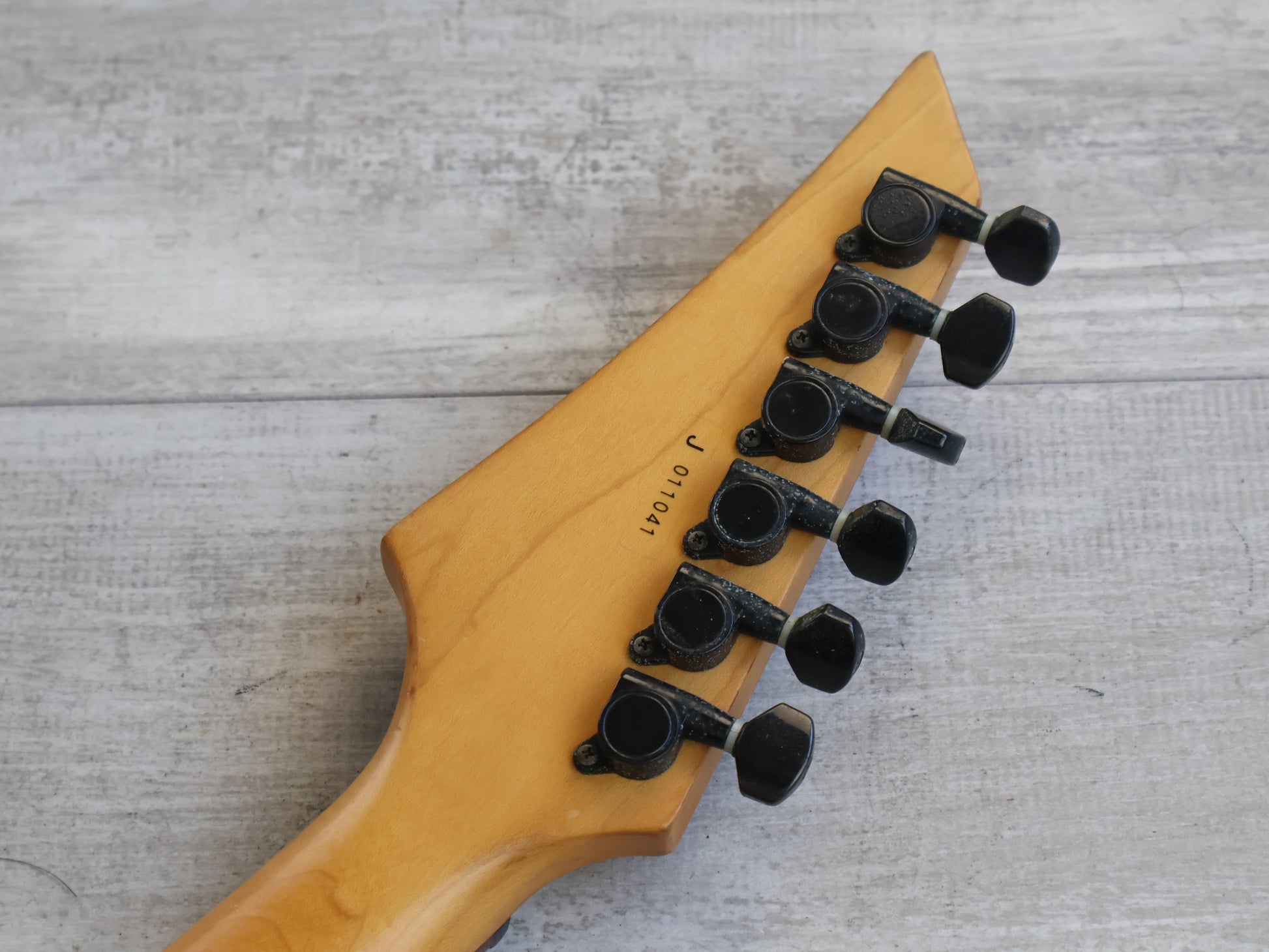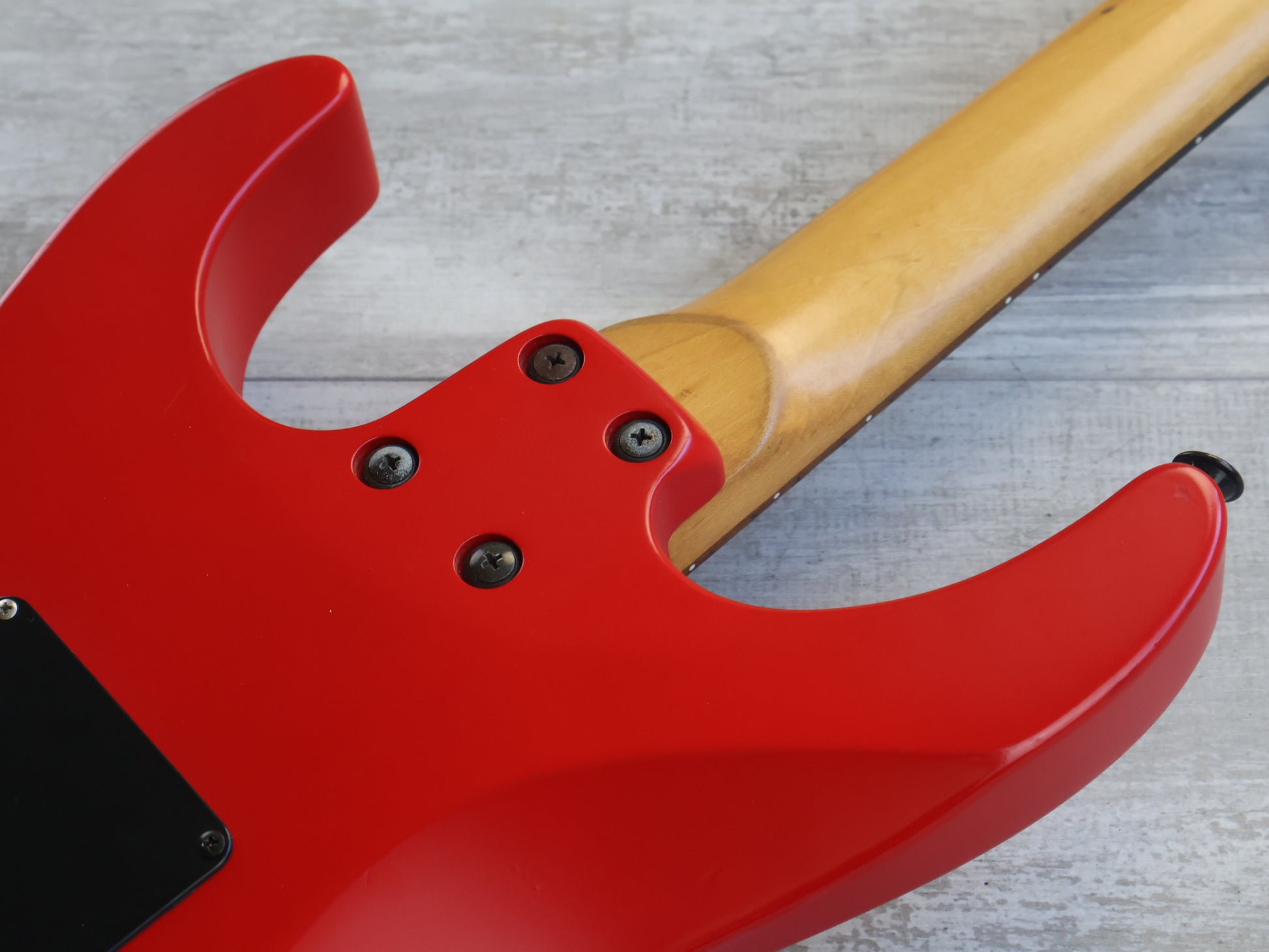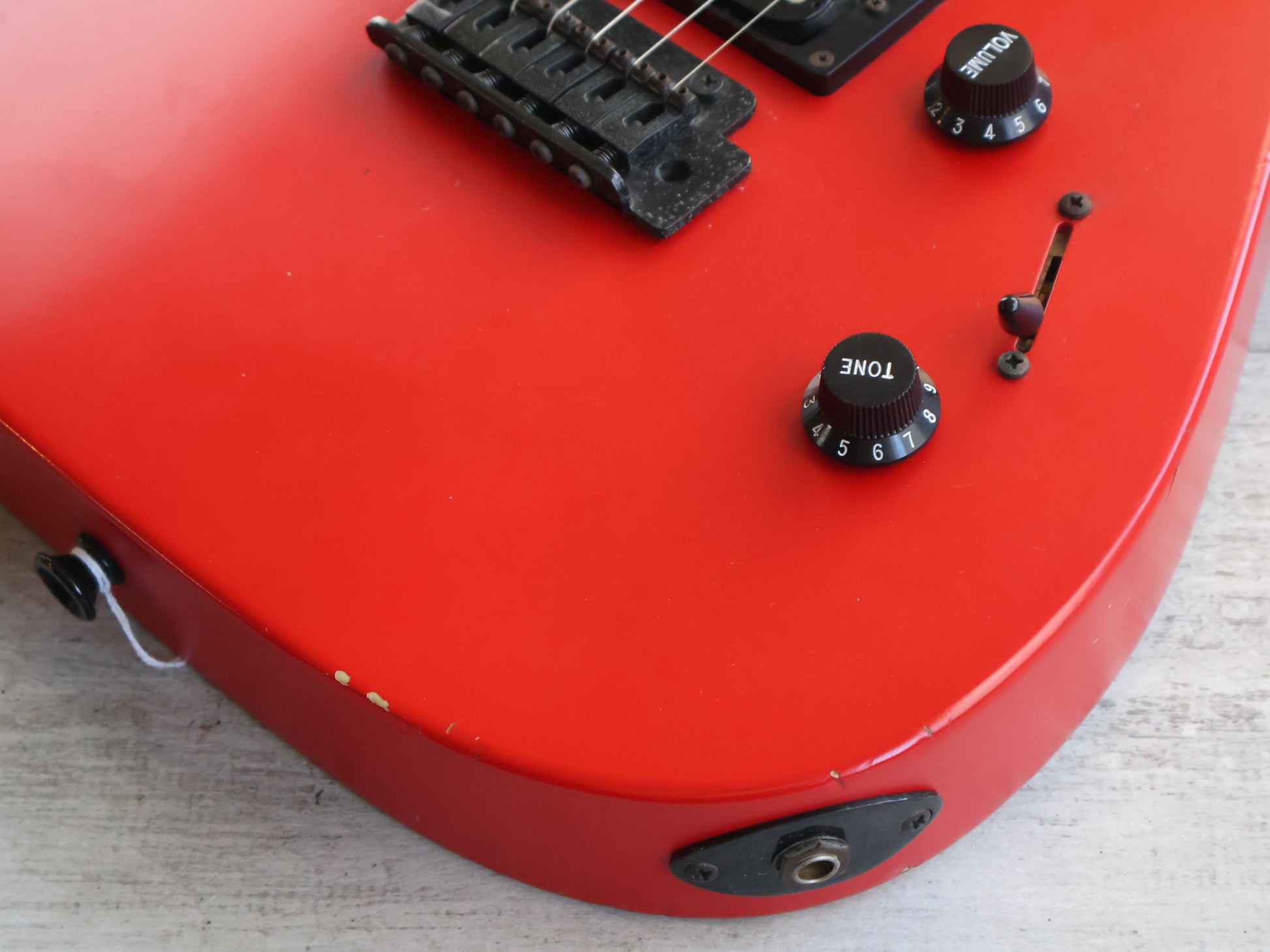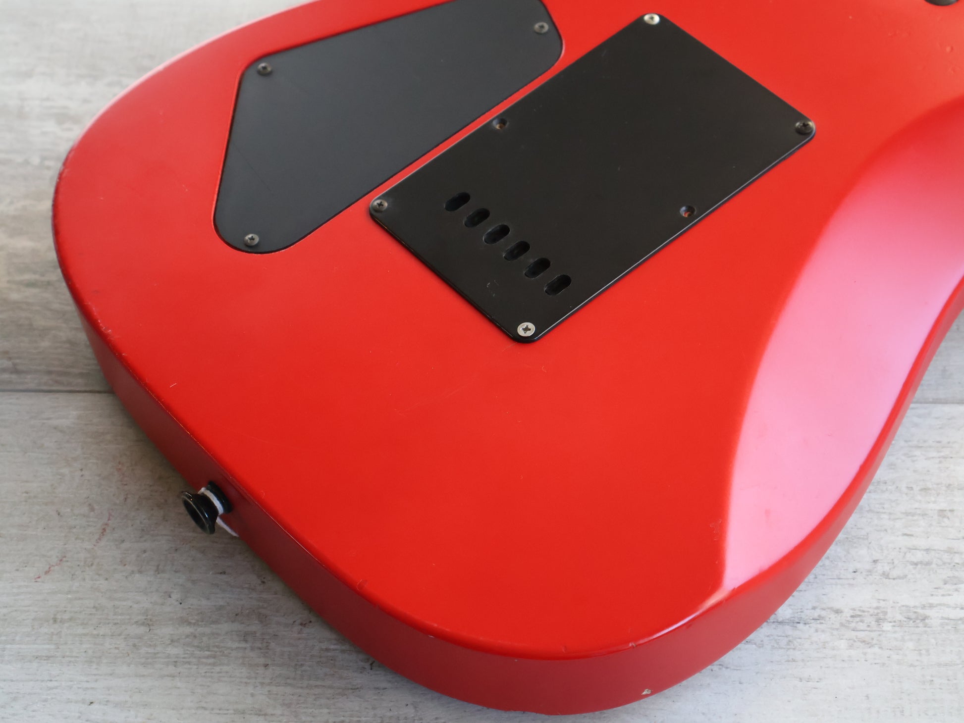 Made by Chushin Gakki in 2001, this is a Grover Jackson branded DK model in a very uncommon Fiesta Red finish with a matching headstock. Looks to be a poplar body with a slim maple neck and a rosewood fingerboard (24 frets, 648mm scale length), it weighs 3.5kg's. Grover Jackson branded HSS pickup loadout with a 2-point tremolo system.