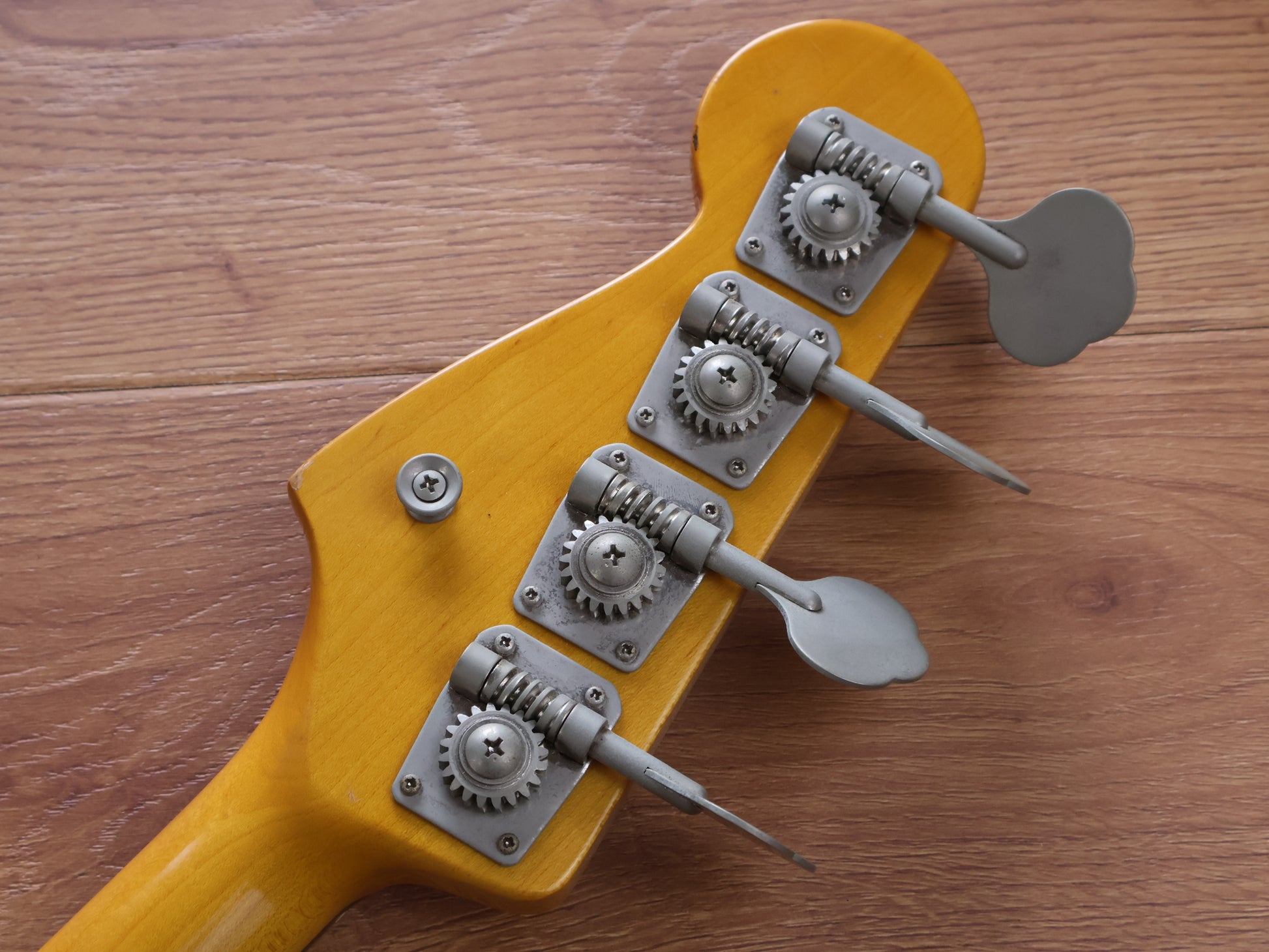 Made in Japan in 2002, this is a Watanabe model ‘62 Reissue Jazz Bass with active circuitry. Ash body with a maple neck and rosewood fingerboard (39mm nut width), weighs 4.3kg’s. Side mounted output jack with 4 knobs on the control plate (Volume, Tone, Treble and Bass), it’s got a 9v battery loaded in the back of the body.