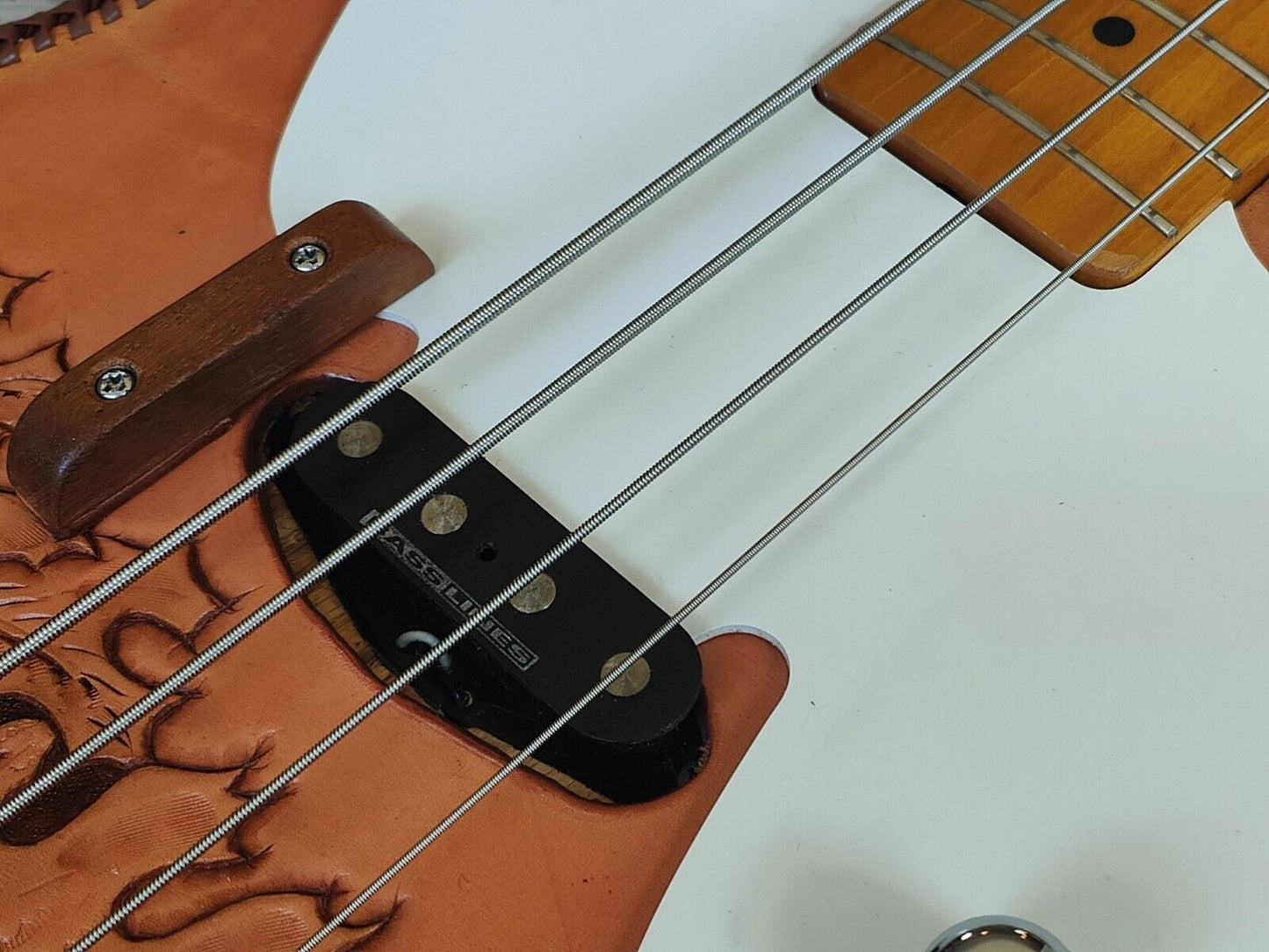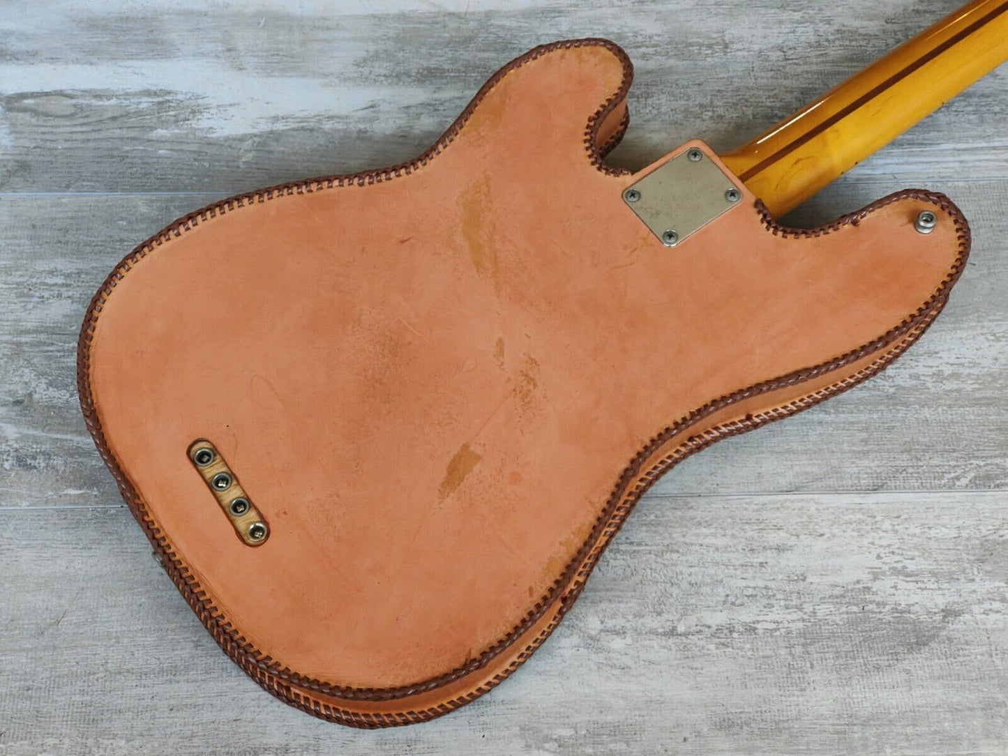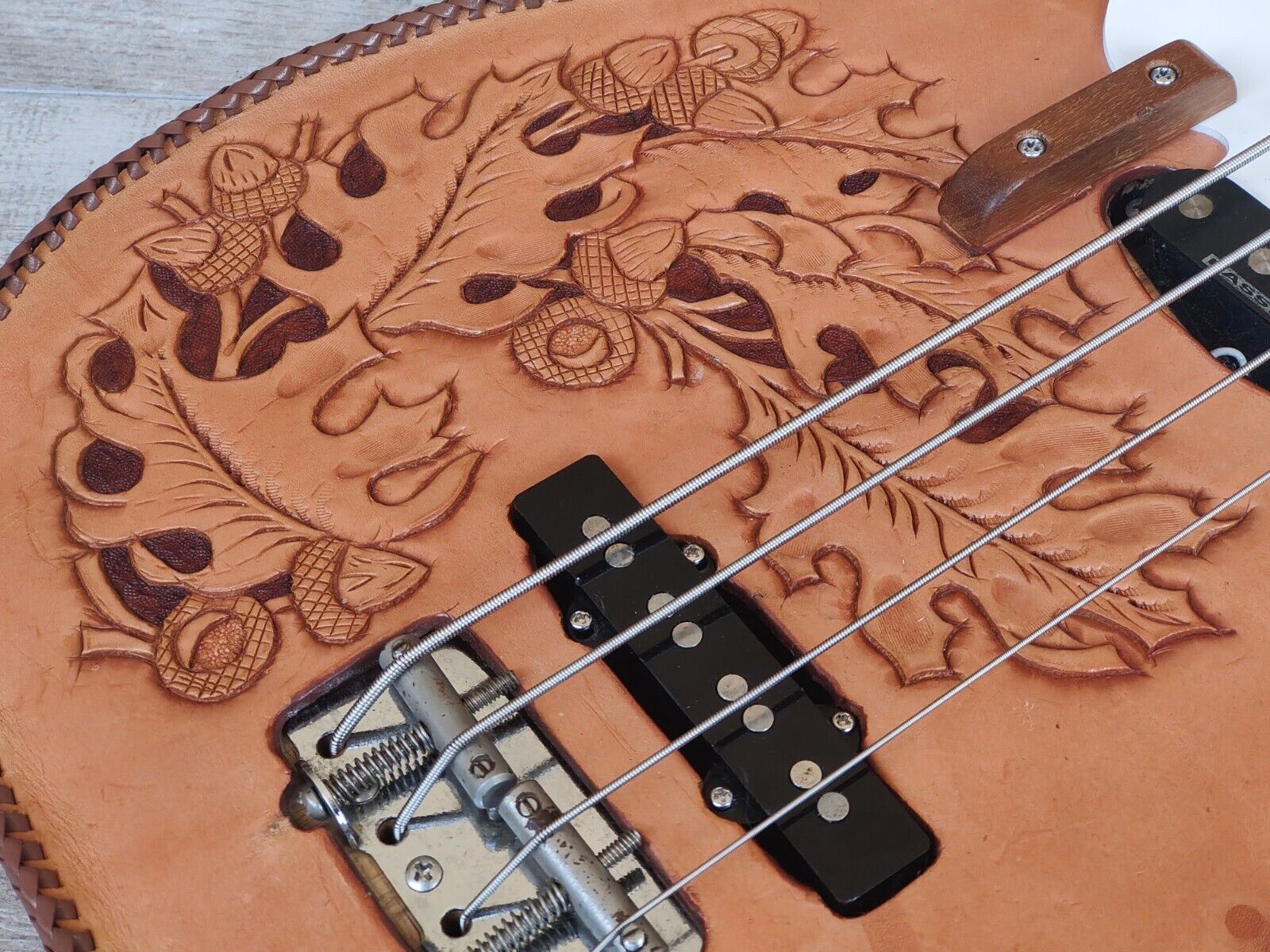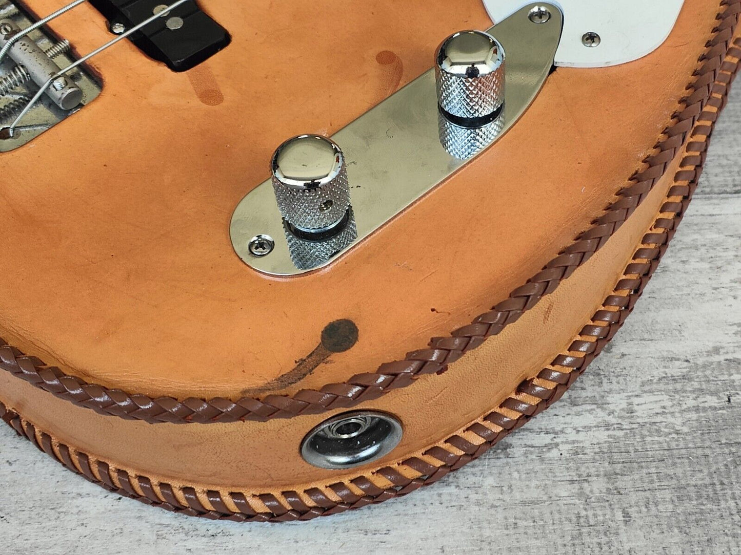 This one came to us highly modified with a custom made leather wrap on the body that's been hand crafted for this guitar and stitched around the body, so removing it isn't an option (but why would you). It's very high quality work and likely would have cost a fortune to have installed. It also had a Jazz Bass pickup professionally routed in the bridge position to compliment the original Basslines SCPB-1 and an extra pot installed so now you have volume, blend and tone knobs.