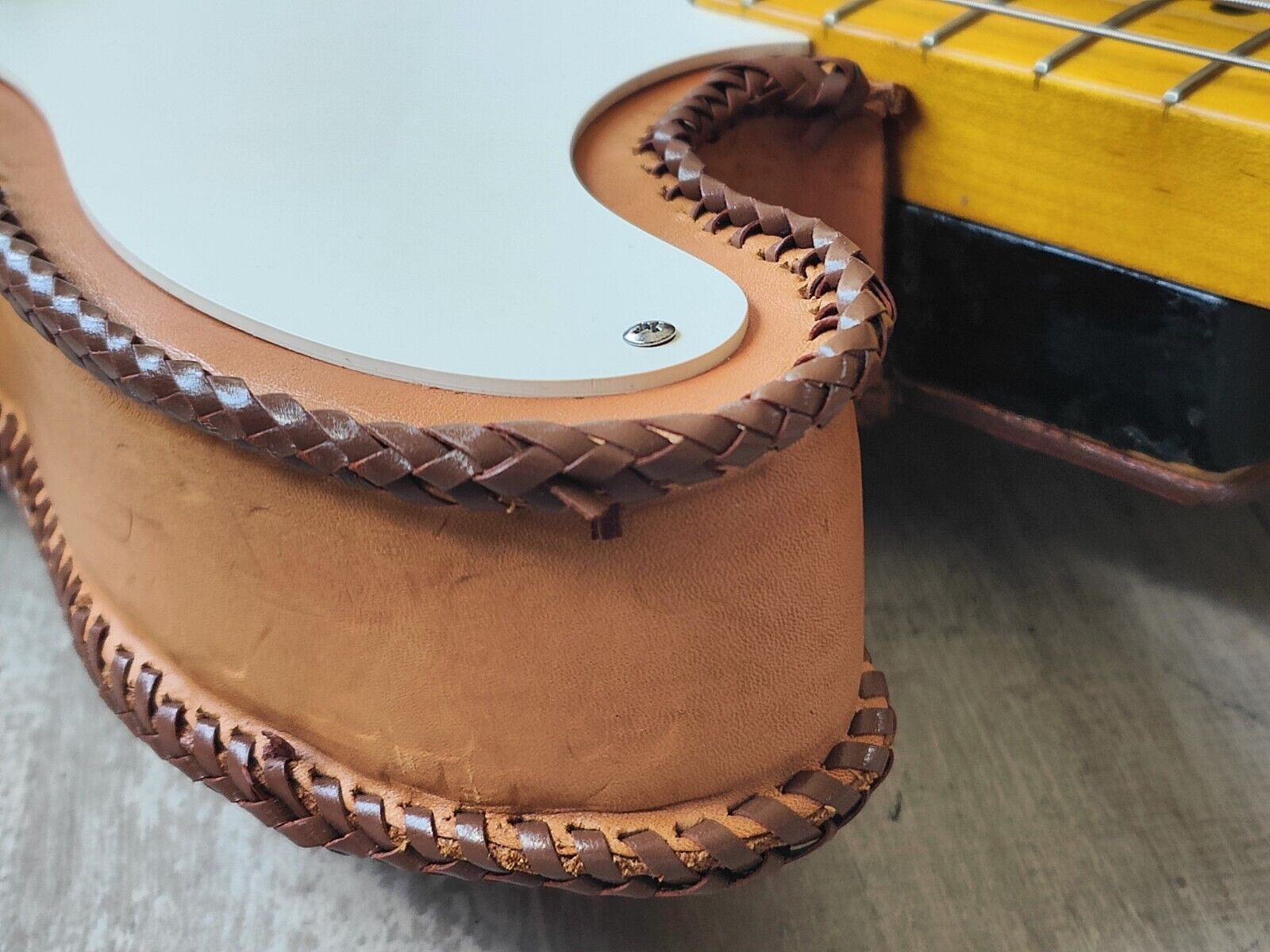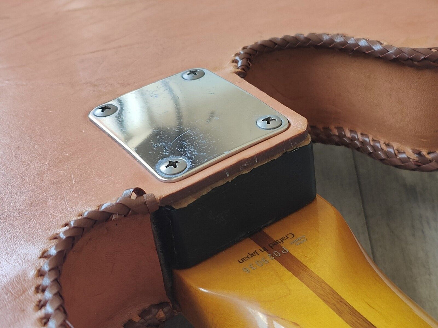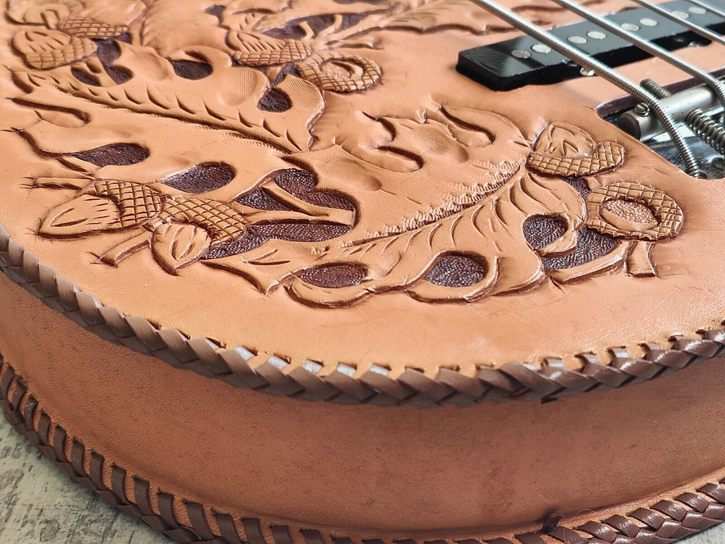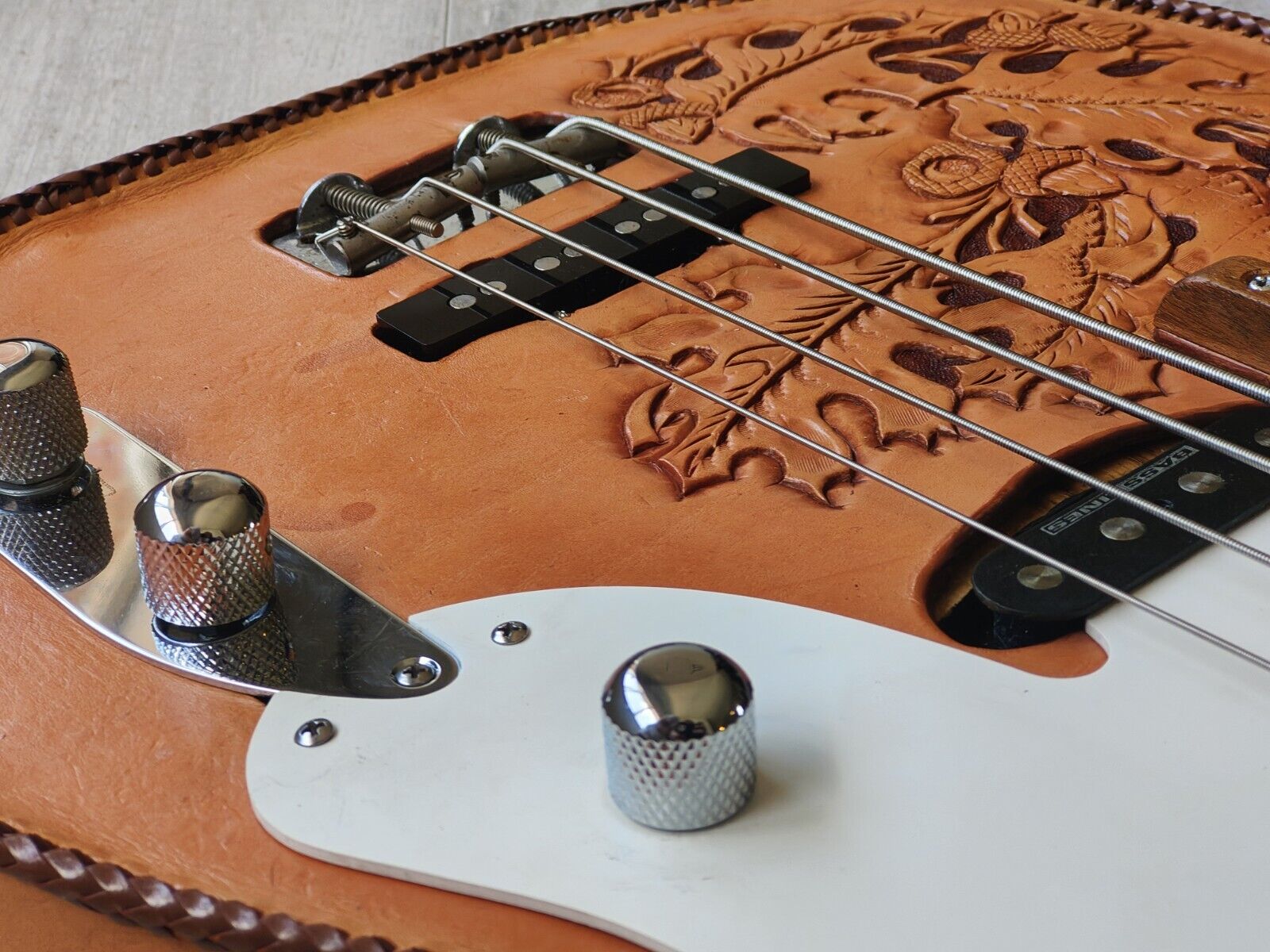 This one came to us highly modified with a custom made leather wrap on the body that's been hand crafted for this guitar and stitched around the body, so removing it isn't an option (but why would you). It's very high quality work and likely would have cost a fortune to have installed. It also had a Jazz Bass pickup professionally routed in the bridge position to compliment the original Basslines SCPB-1 and an extra pot installed so now you have volume, blend and tone knobs.
