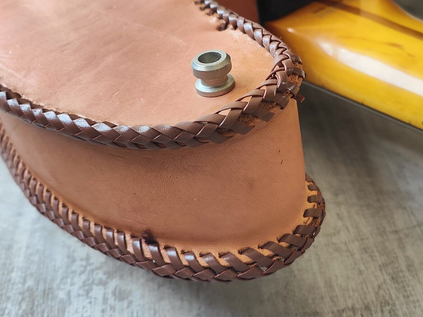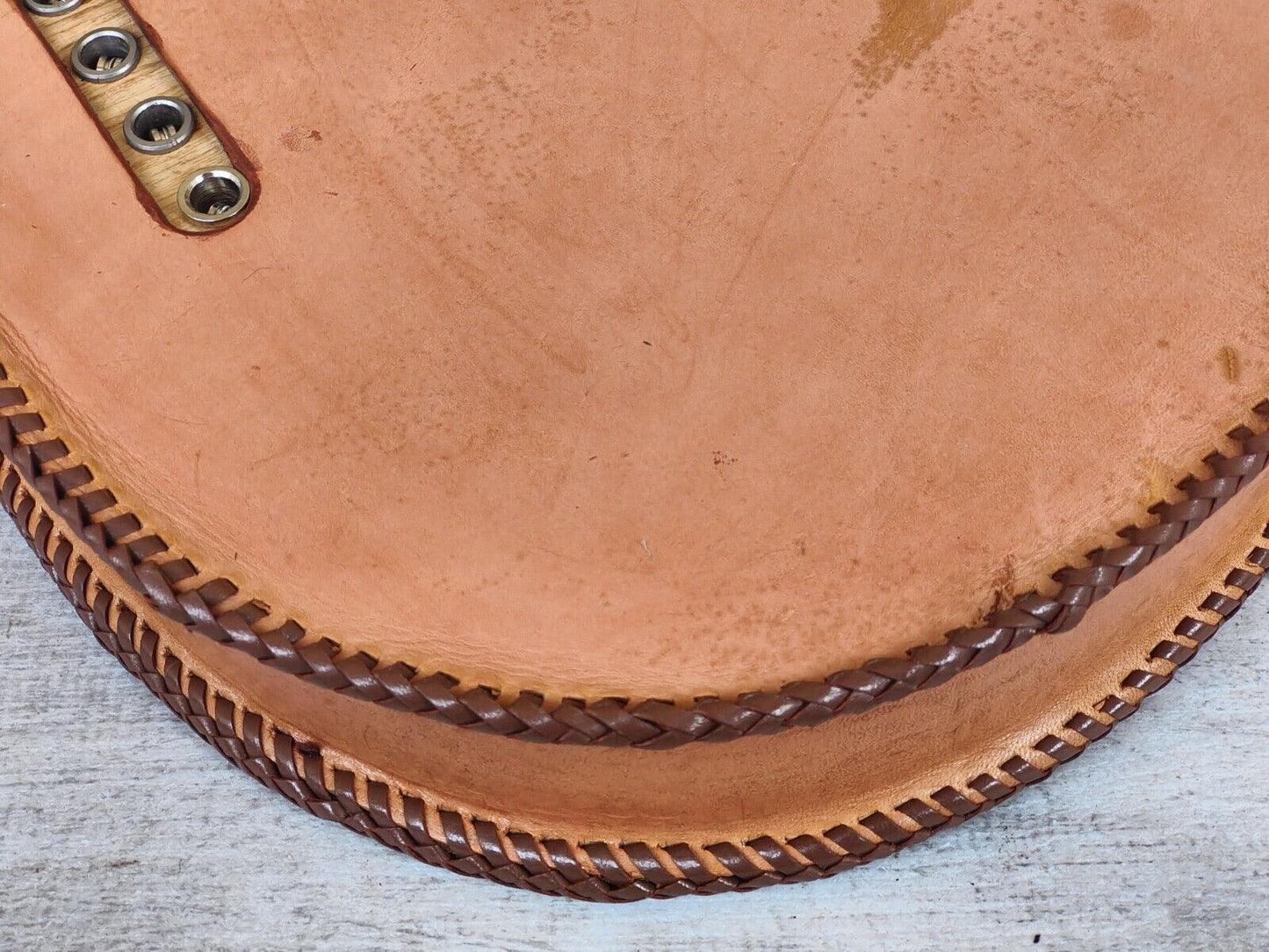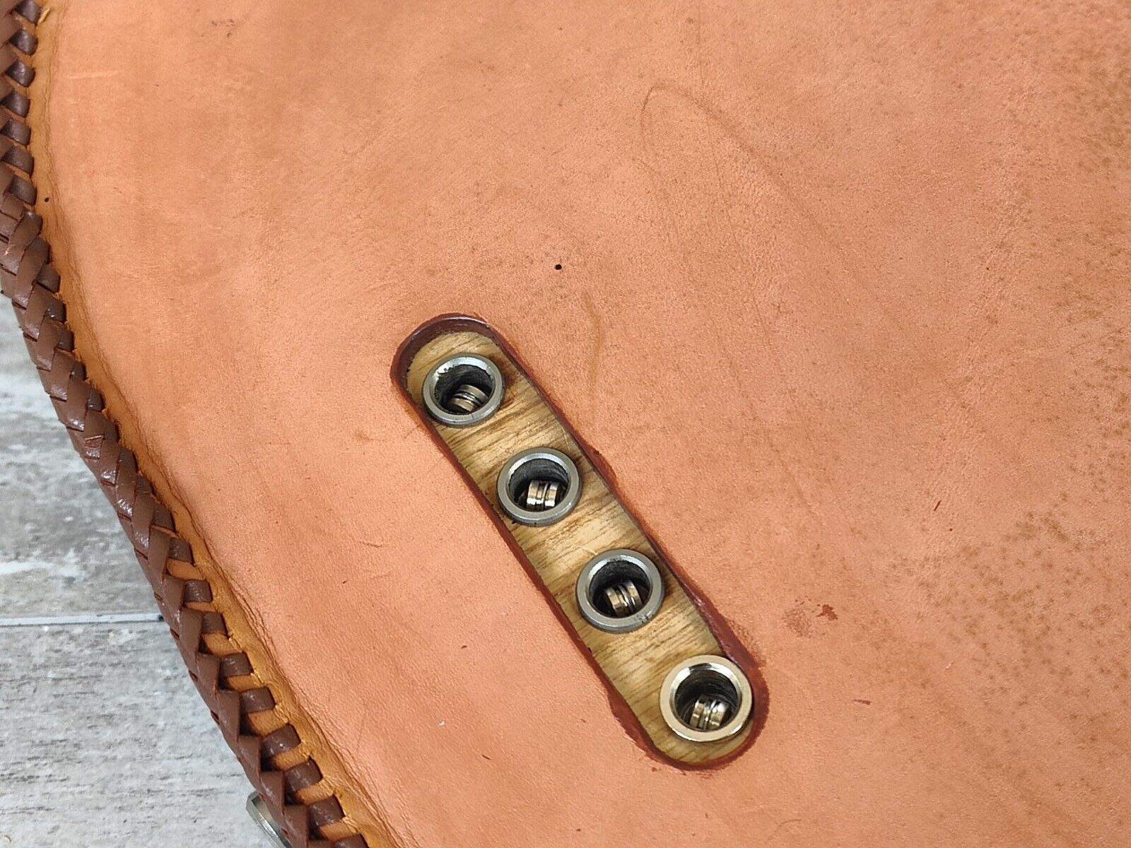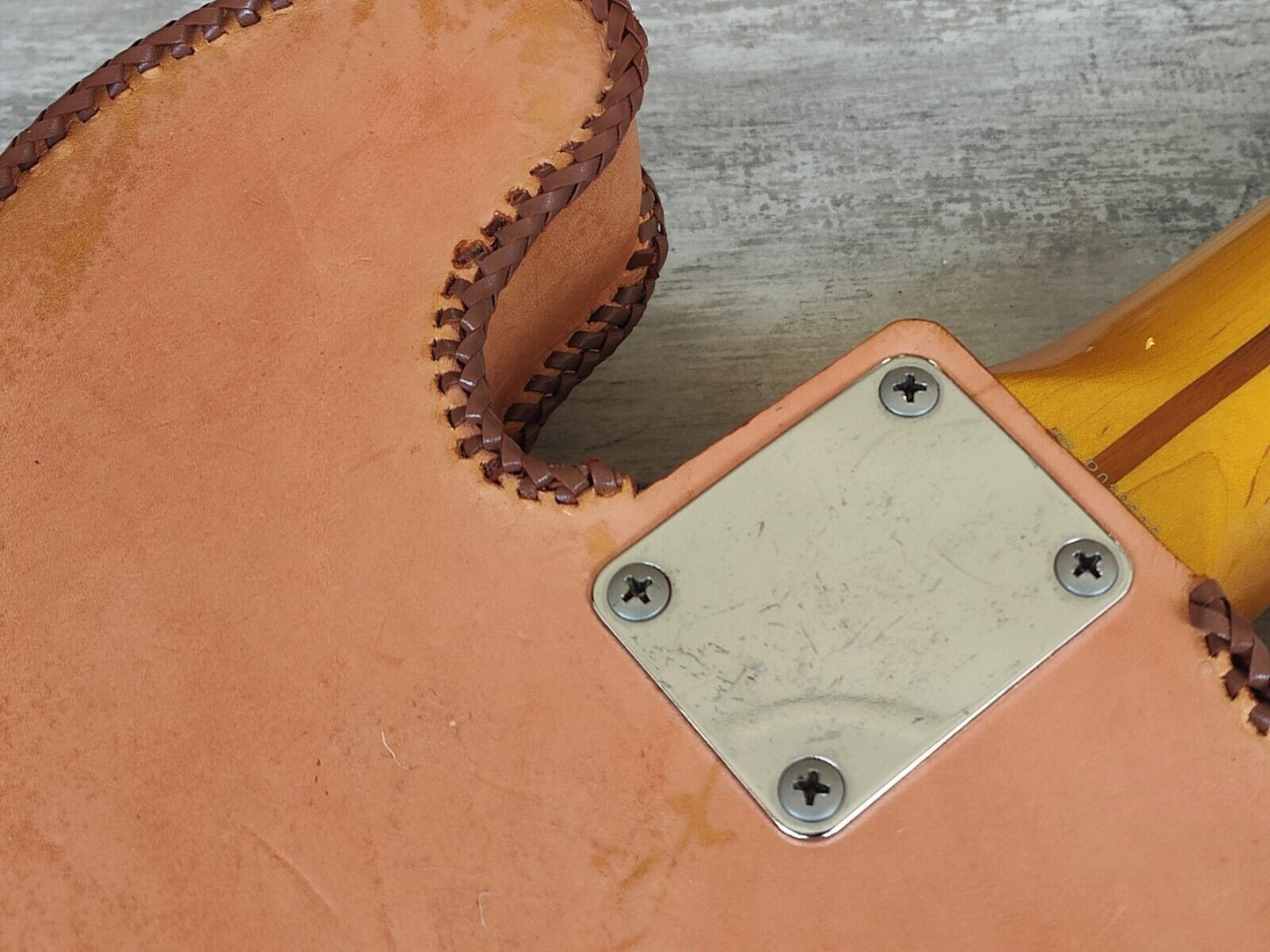 This one came to us highly modified with a custom made leather wrap on the body that's been hand crafted for this guitar and stitched around the body, so removing it isn't an option (but why would you). It's very high quality work and likely would have cost a fortune to have installed. It also had a Jazz Bass pickup professionally routed in the bridge position to compliment the original Basslines SCPB-1 and an extra pot installed so now you have volume, blend and tone knobs.