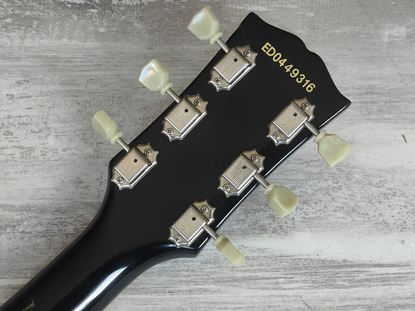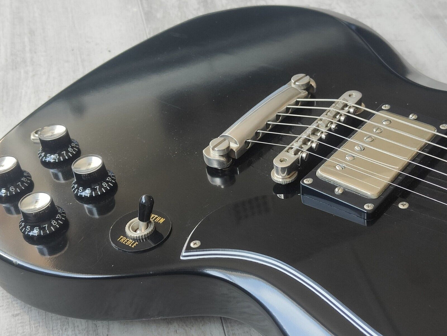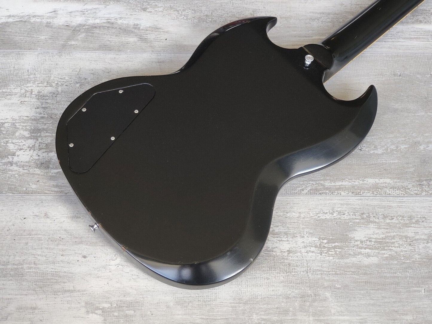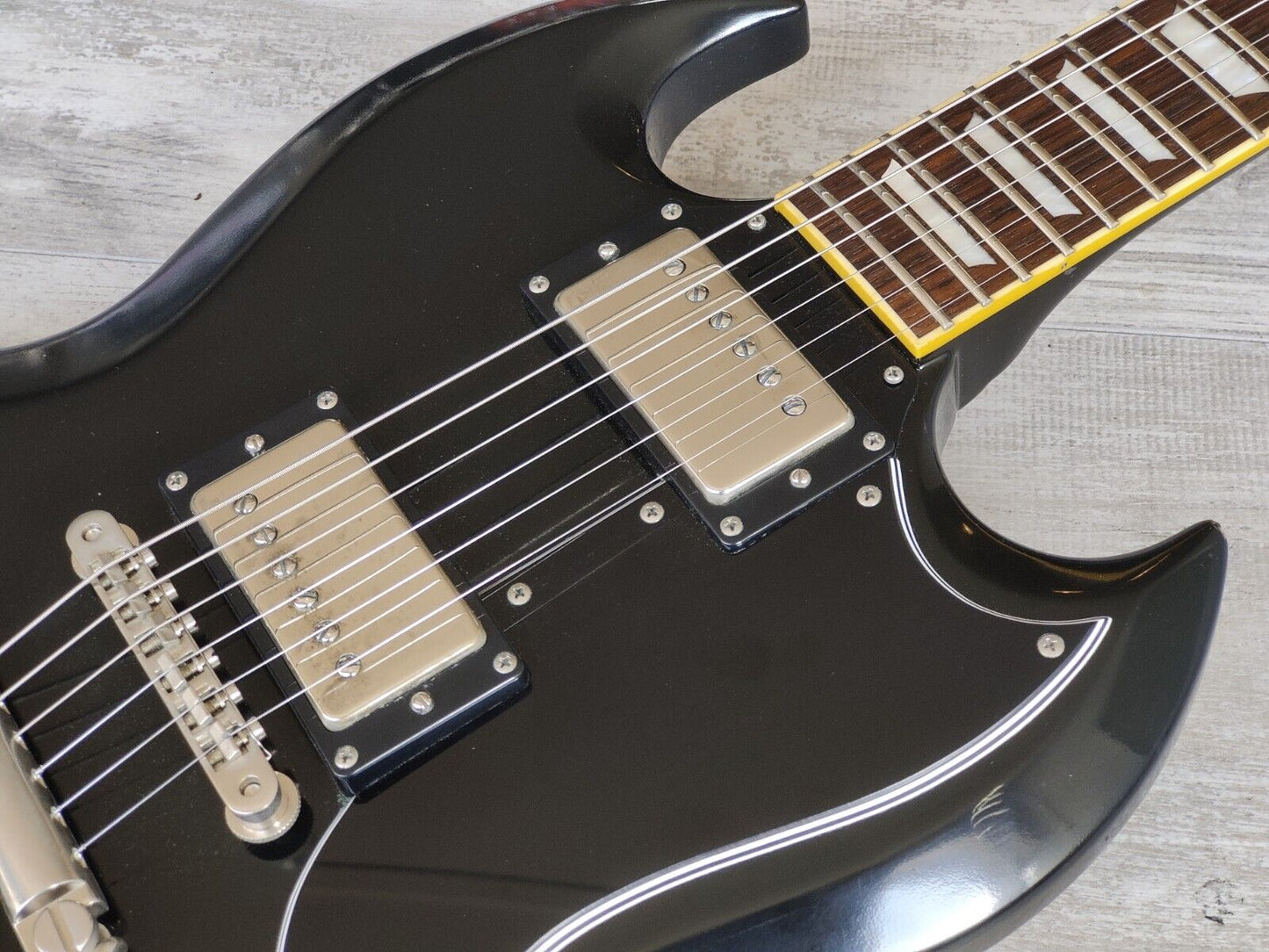 Made in Japan under the eyes of ESP, this was one of the earlier Edwards SG's. Mahogany body with a slim 60's mahogany neck and a 22 fret rosewood fingerboard, it weighs 2.8kg's. Black finish with the famous Edwards "Lacquer Taste" nitro overcoat to give the guitar a satin nitro look and feel. Factory loaded with Seymour Duncan SH-1n and SH-4 humbuckers.