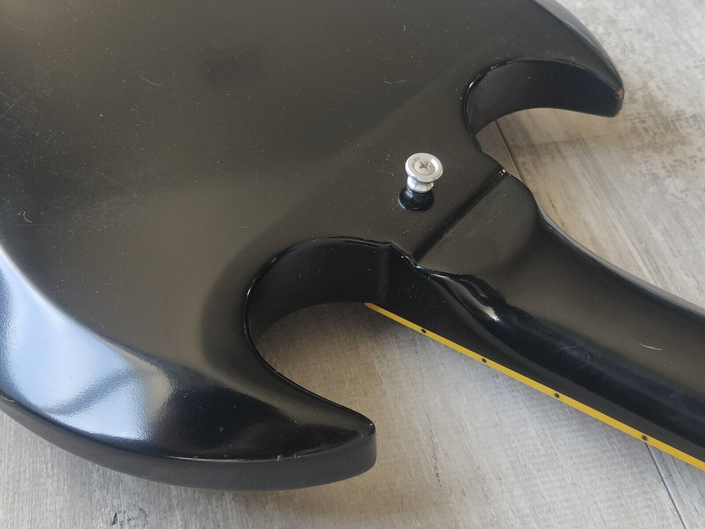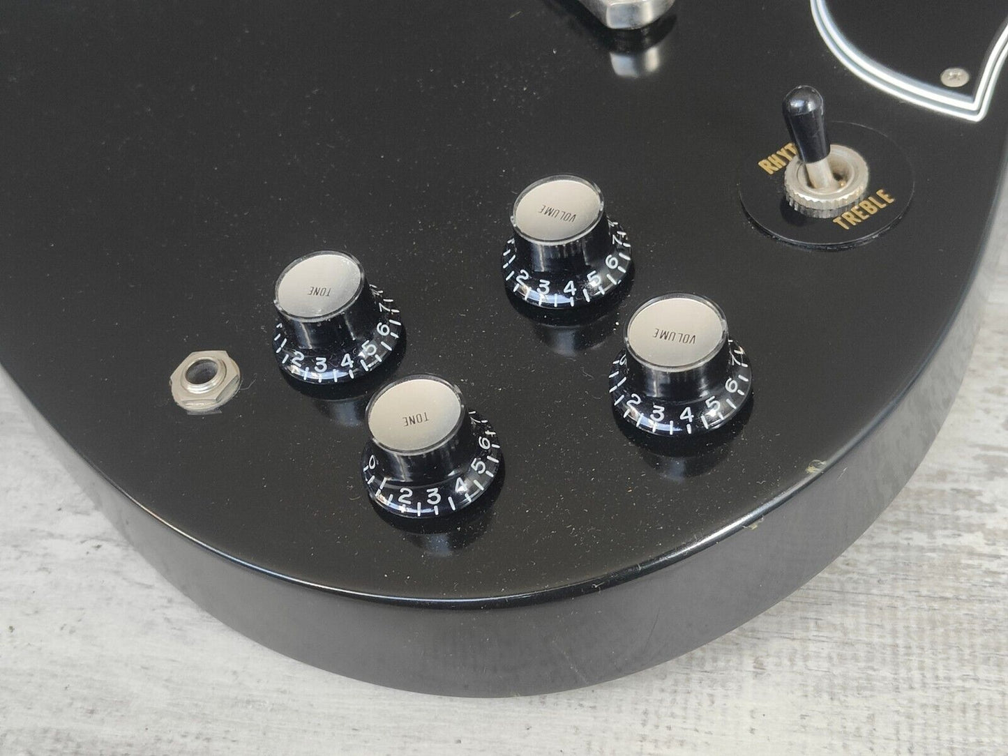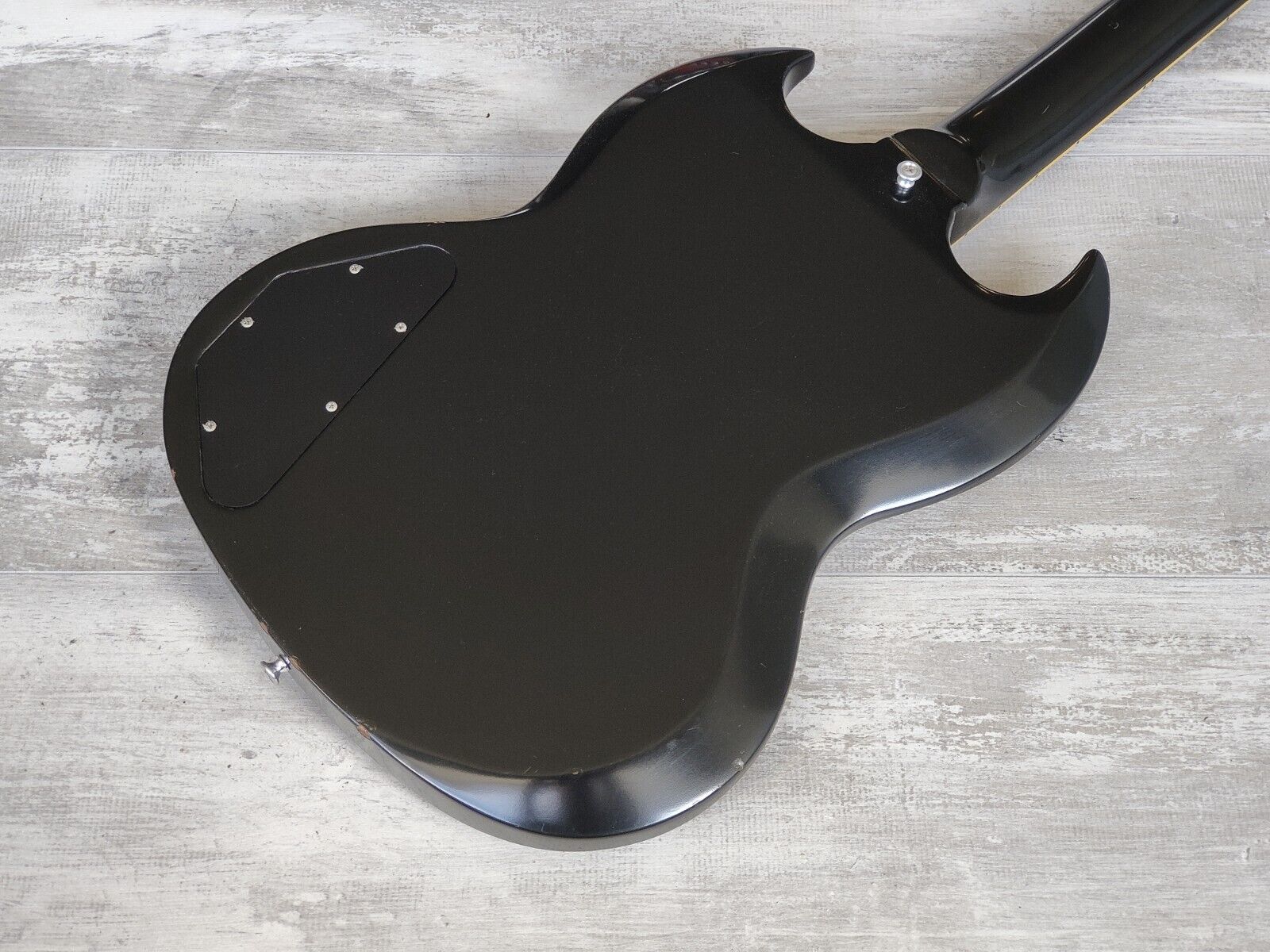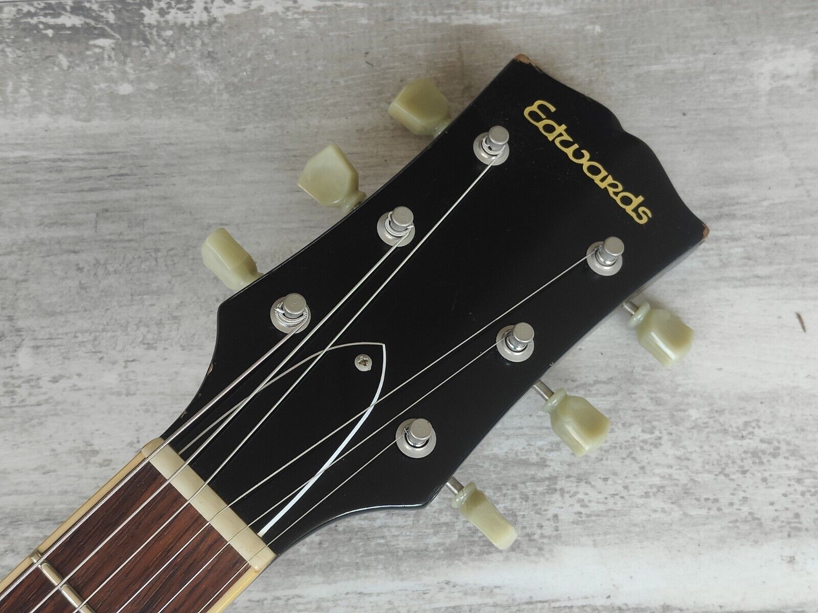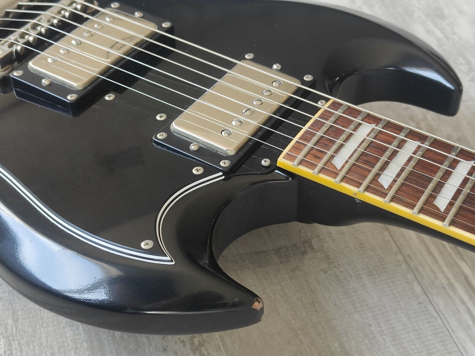 Made in Japan under the eyes of ESP, this was one of the earlier Edwards SG's. Mahogany body with a slim 60's mahogany neck and a 22 fret rosewood fingerboard, it weighs 2.8kg's. Black finish with the famous Edwards "Lacquer Taste" nitro overcoat to give the guitar a satin nitro look and feel. Factory loaded with Seymour Duncan SH-1n and SH-4 humbuckers.