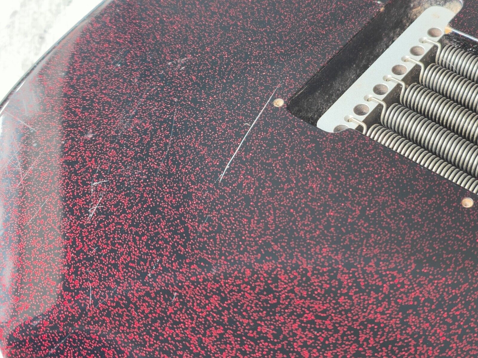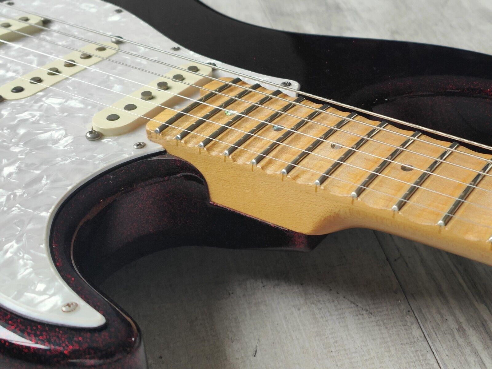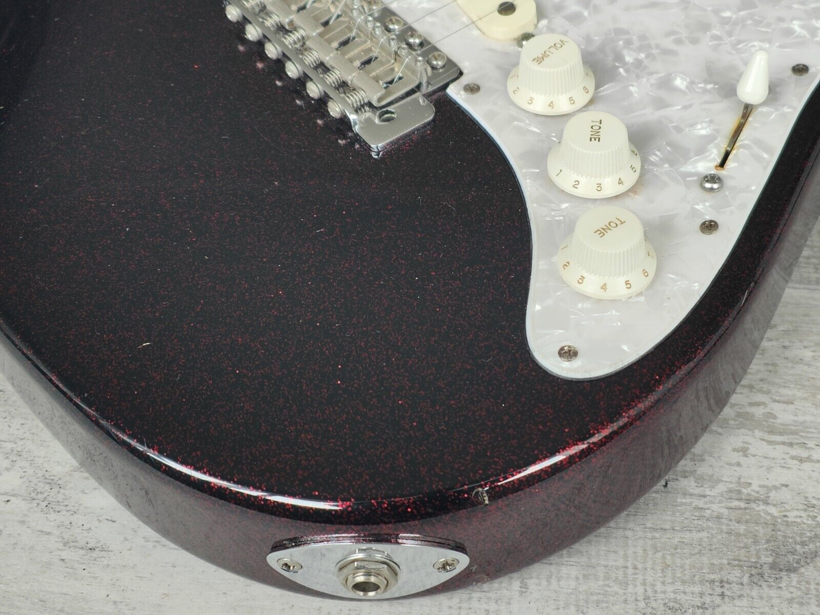 Alder body with a sparkle black/red finish bolted to a maple neck that features a light aftermarket scallop (22 frets, 12" radius, 648mm scale length, 42mm nut width), it weighs 3.5kg's. Loaded with Sperzel USA locking tuners, a Stratocaster style tremolo system, it's loaded with Seymour Duncan STK-10 Yngvie Malmsteen stacked single coils in the neck and bridge position and an unknown alnico pickup in the middle position that are controlled by volume and tone knobs and a three-way pickup selector.