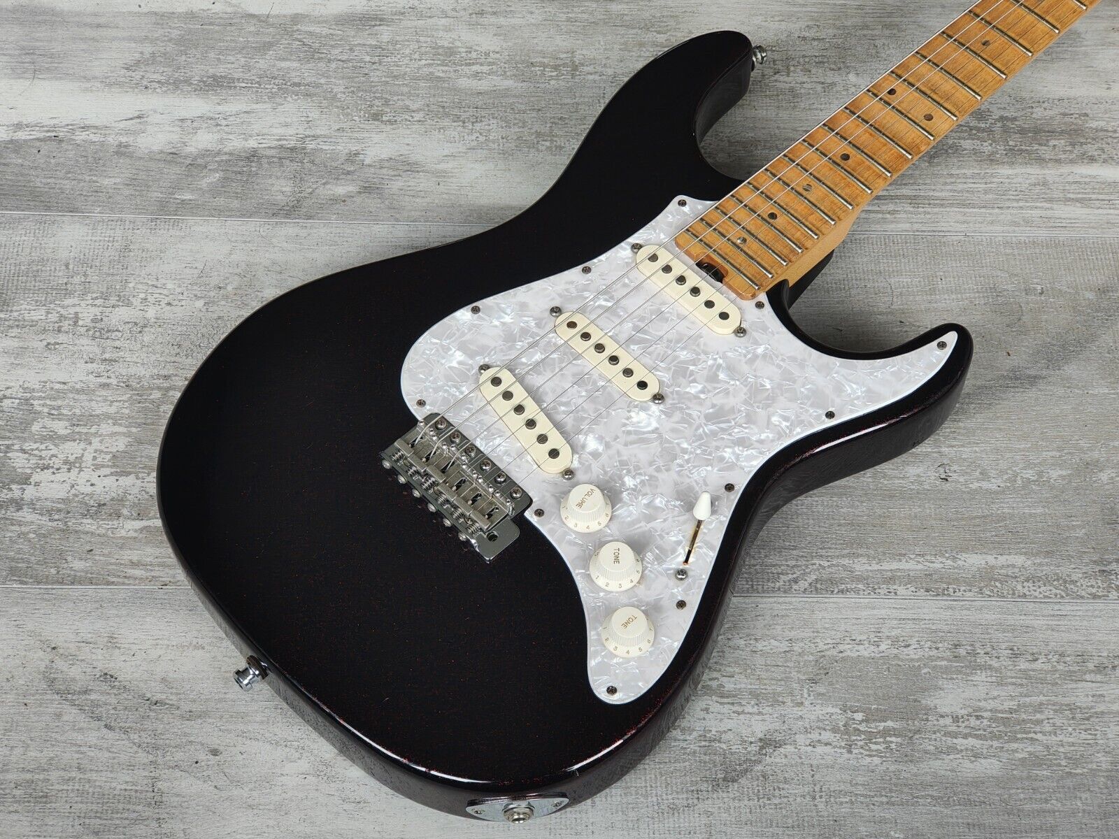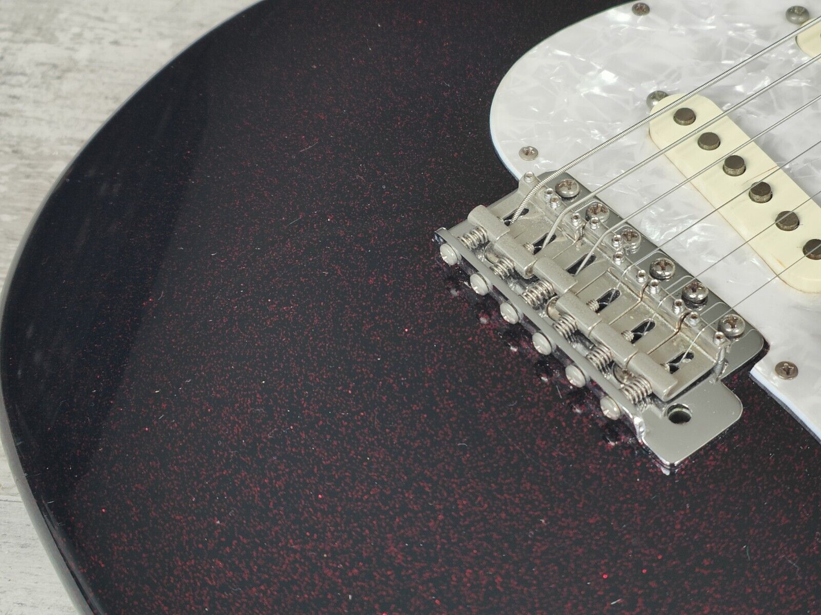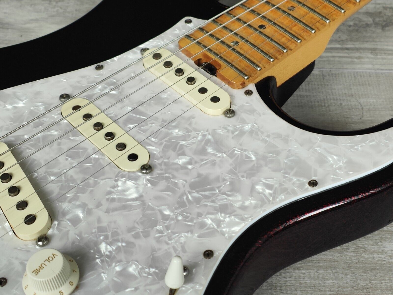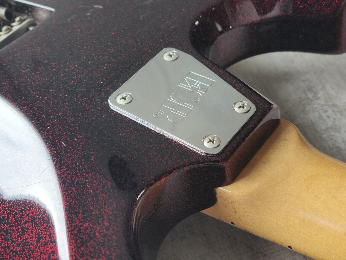 Alder body with a sparkle black/red finish bolted to a maple neck that features a light aftermarket scallop (22 frets, 12" radius, 648mm scale length, 42mm nut width), it weighs 3.5kg's. Loaded with Sperzel USA locking tuners, a Stratocaster style tremolo system, it's loaded with Seymour Duncan STK-10 Yngvie Malmsteen stacked single coils in the neck and bridge position and an unknown alnico pickup in the middle position that are controlled by volume and tone knobs and a three-way pickup selector.