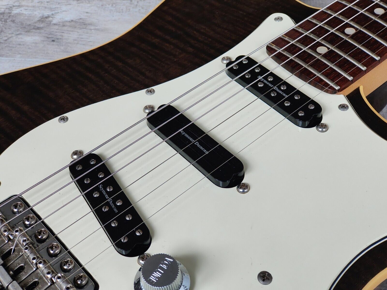Originally these were factory loaded with very unpopular Dimarzio Collection pickups and the previous owner took the borderline psychopathic route by having three Seymour Duncan mini humbuckers installed (SL59-1N Little '59 SCR-1 in the neck, Cool Rails in the middle and a SJBJ JB Jr in the bridge position).