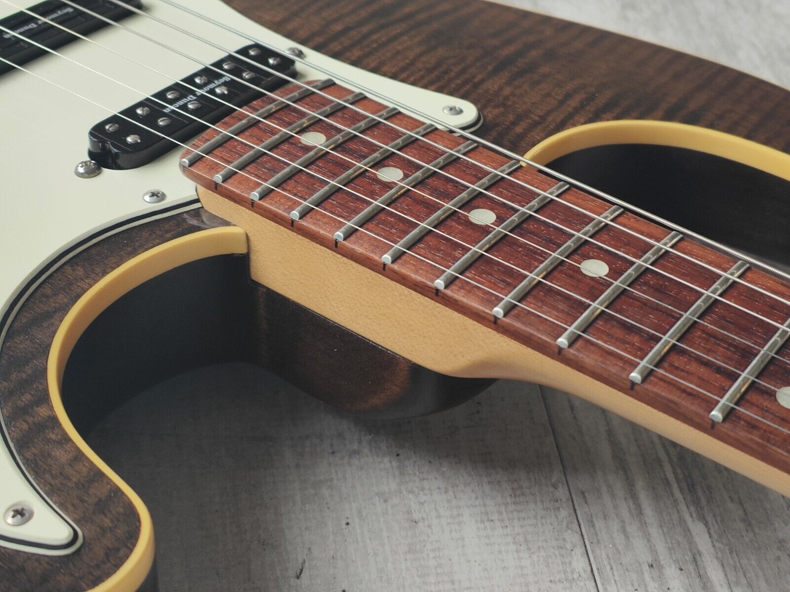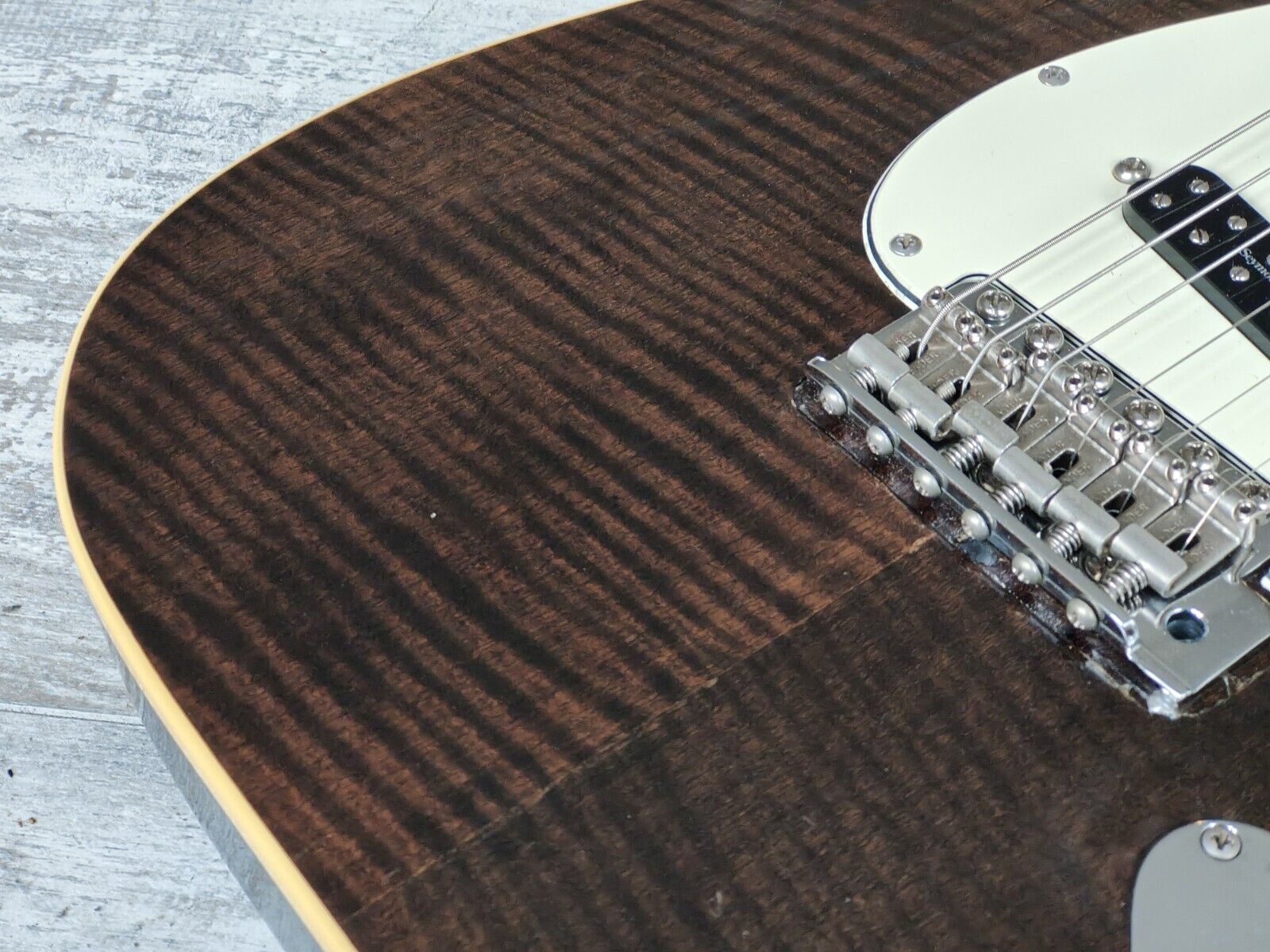 Made in Japan in 2006, the AST-100 was one of the original Aerodyne Special models from Fender with a pretty significant cosmetic upgrade from a standard Aerodyne! Bound alder body with a curly maple cap, oval profile maple neck and 22 fret rosewood fingerboard (9.5" radius, 42mm nut width), it weighs 3.6kg's.