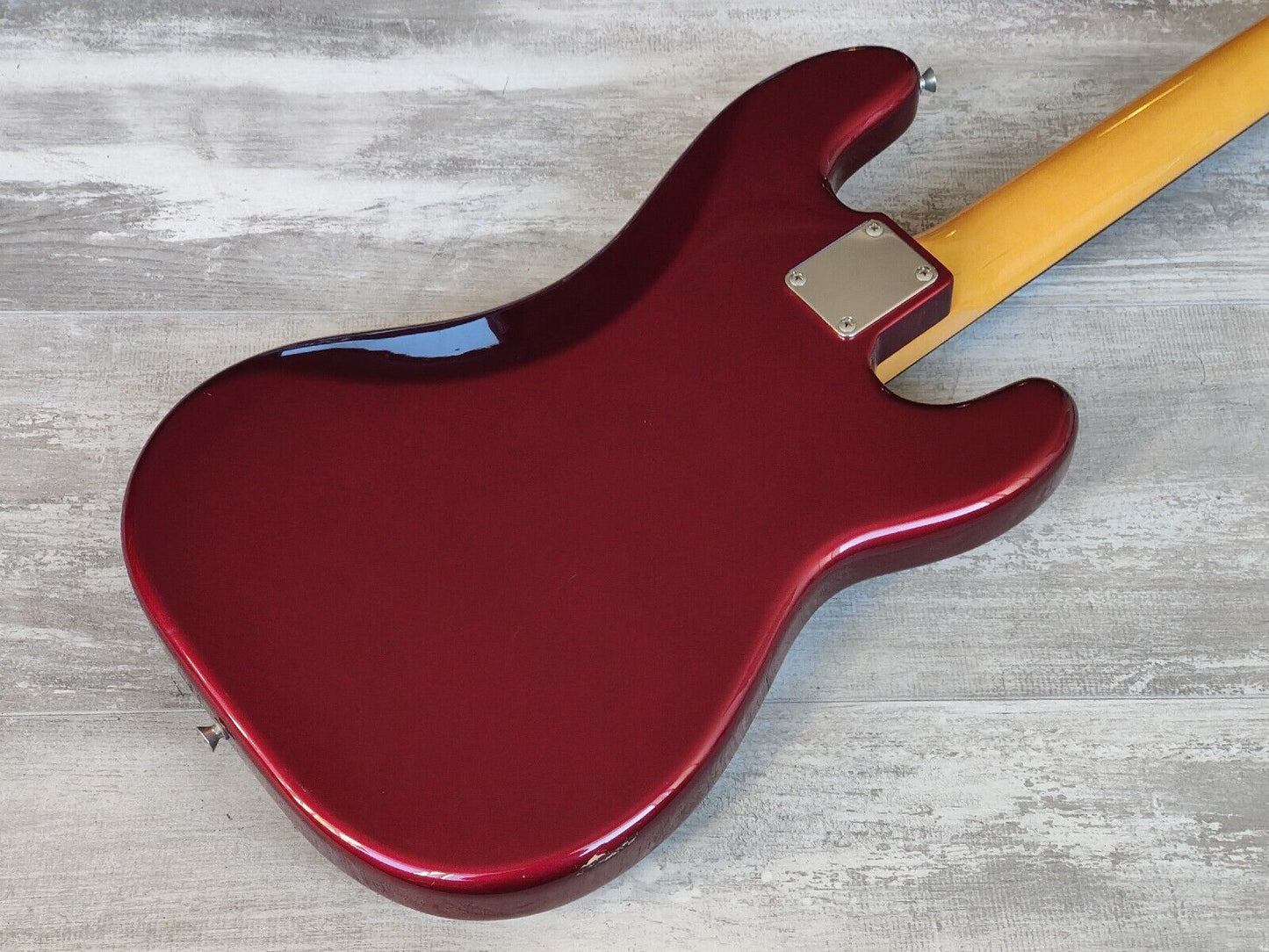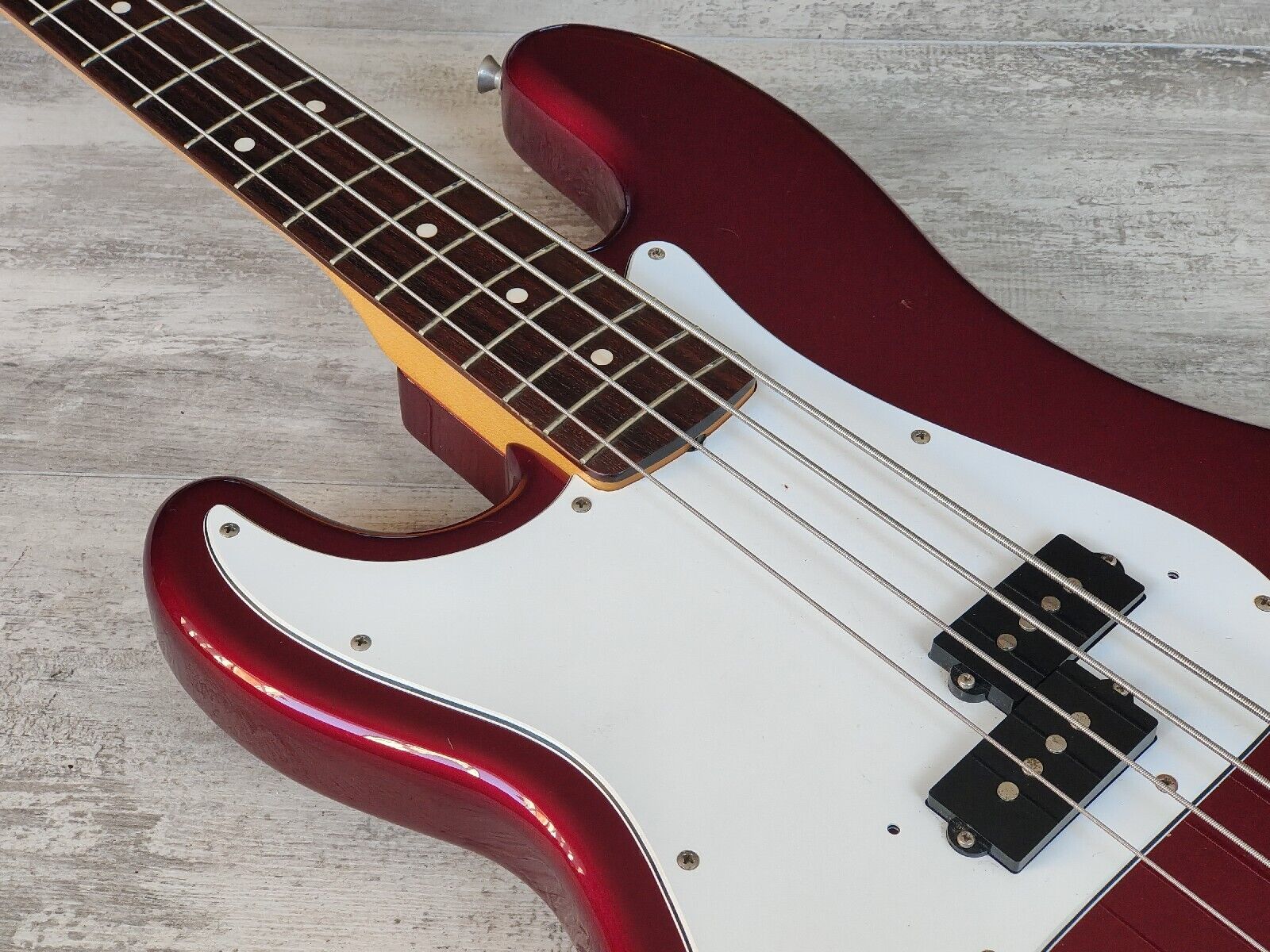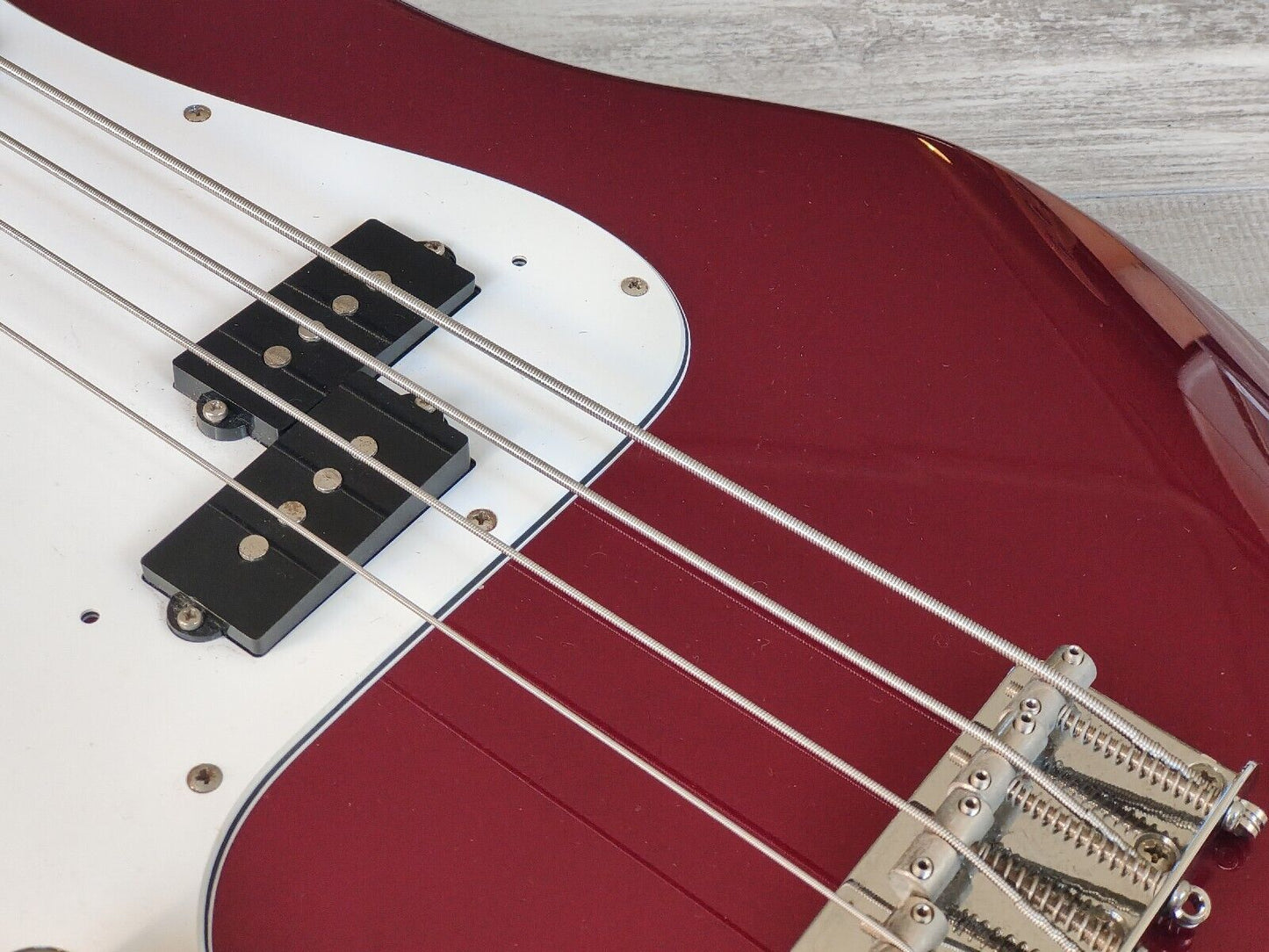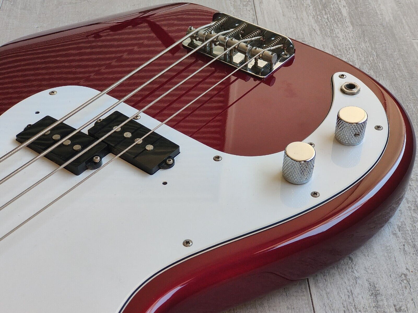 Made by the the Dyna Gakki factory in 2006, the PB62 is Fender Japan's reissue of the '62 model Precision Bass with a basswood body, maple neck and slab rosewood fingerboard (20 frets, 7.25" radius, 42mm nut width), it weighs 4kg's. Finished in a seldom seen "OCR" Old Candy Apple Red finish (even rarer as a Lefty!).