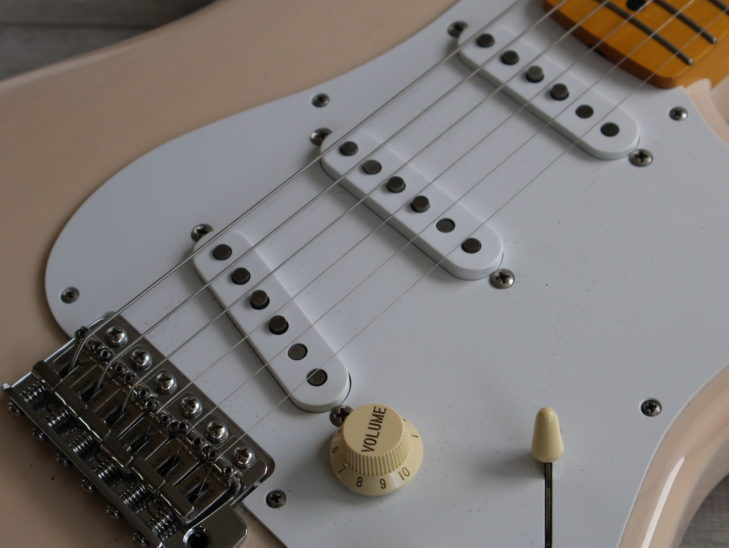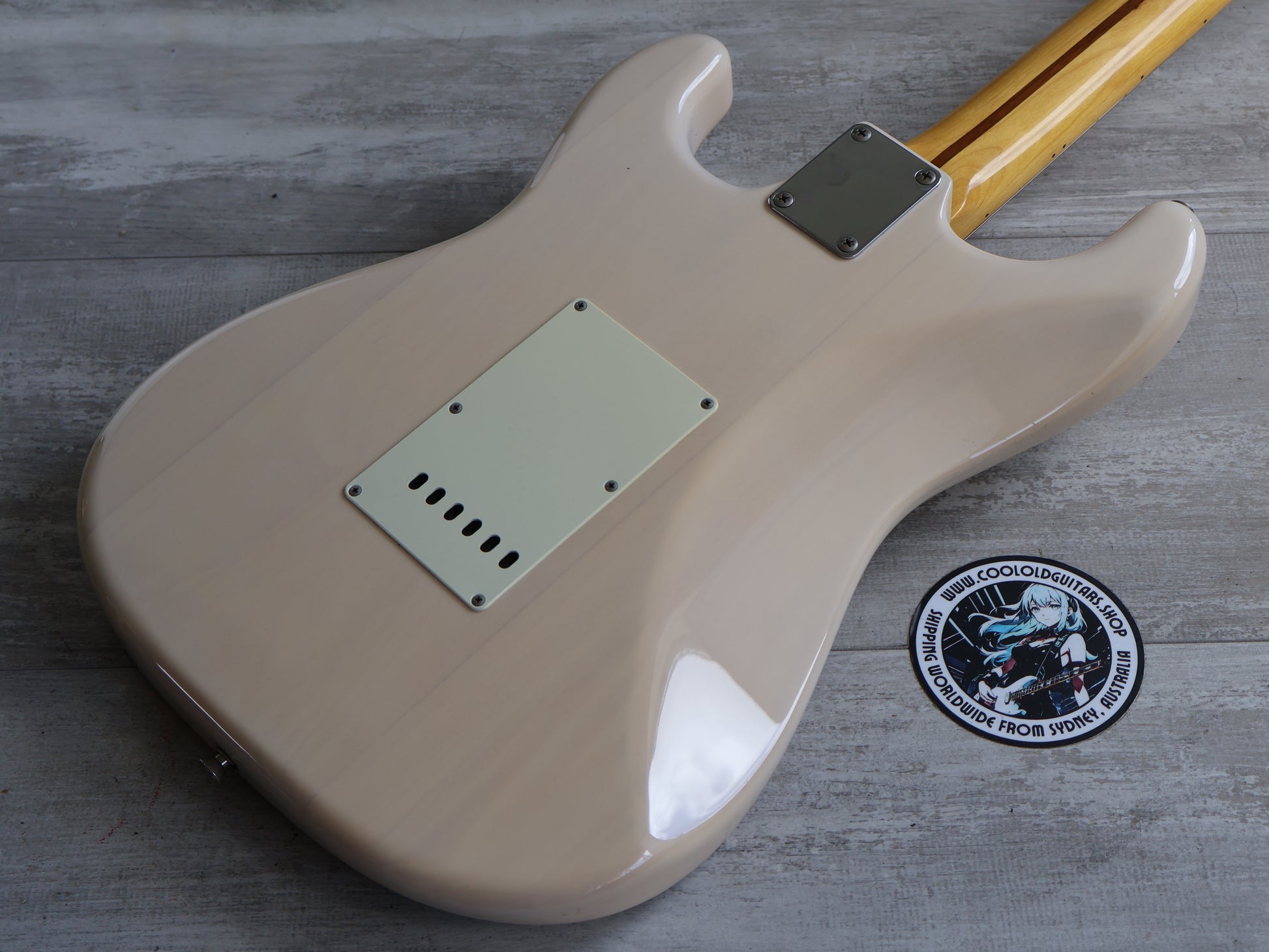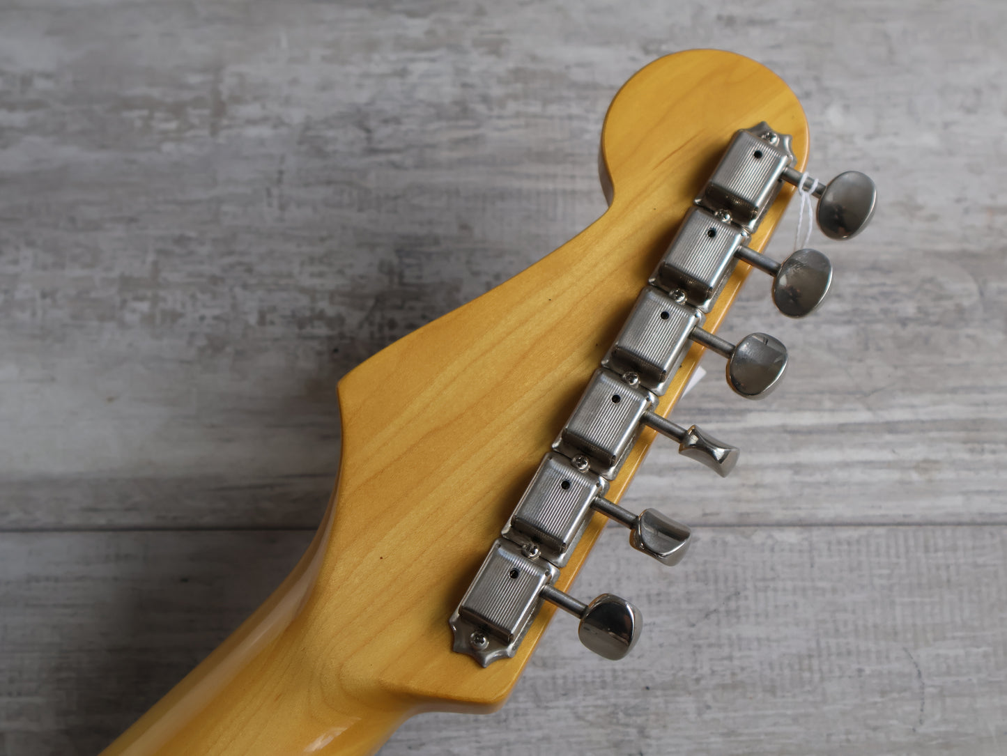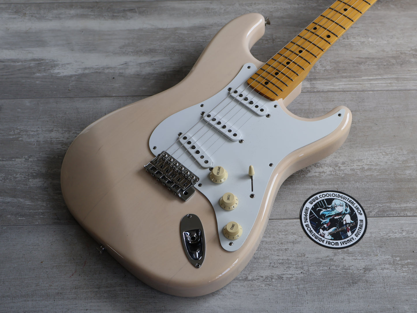 Made by the Tokai factory in 2006, the ST57-66US was a premium model '57 reissue by Fender Japan. Basswood body wearing a rare transparent "US Blonde" finish (that was usually saved for Telecaster models) bolted to a '57 profile one-piece maple neck (7.25" radius, 42mm nut width), it weighs 3.4kg's. Factory loaded with Fender USA ST-Vintage pickups, this one seems to be all original with Fender stamped saddles and vintage-style tuners.