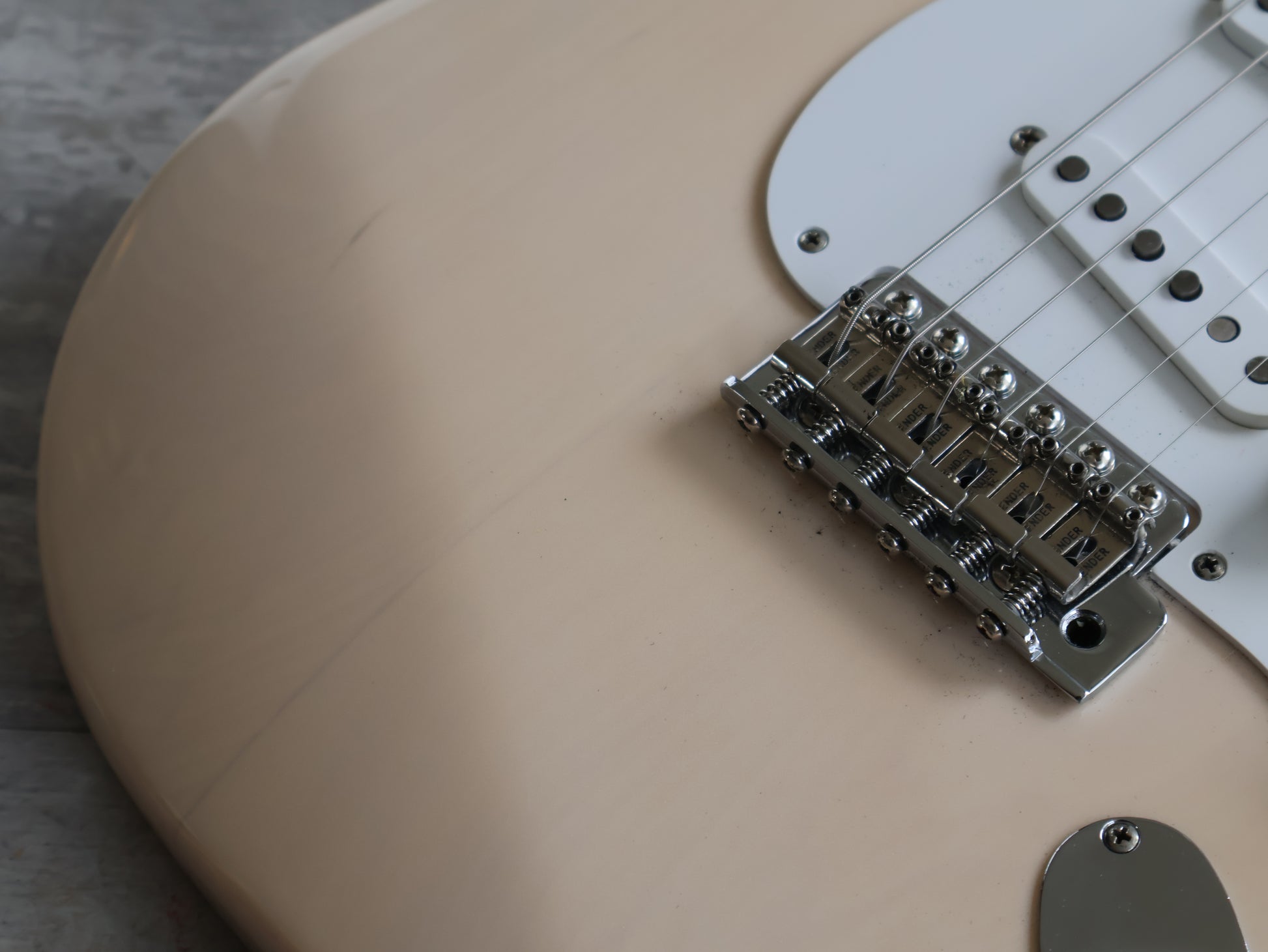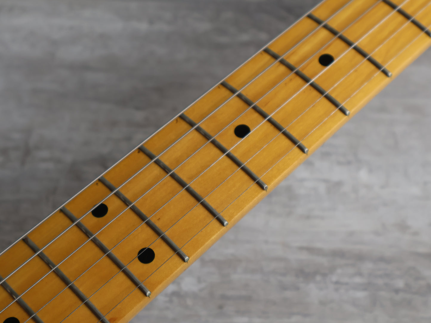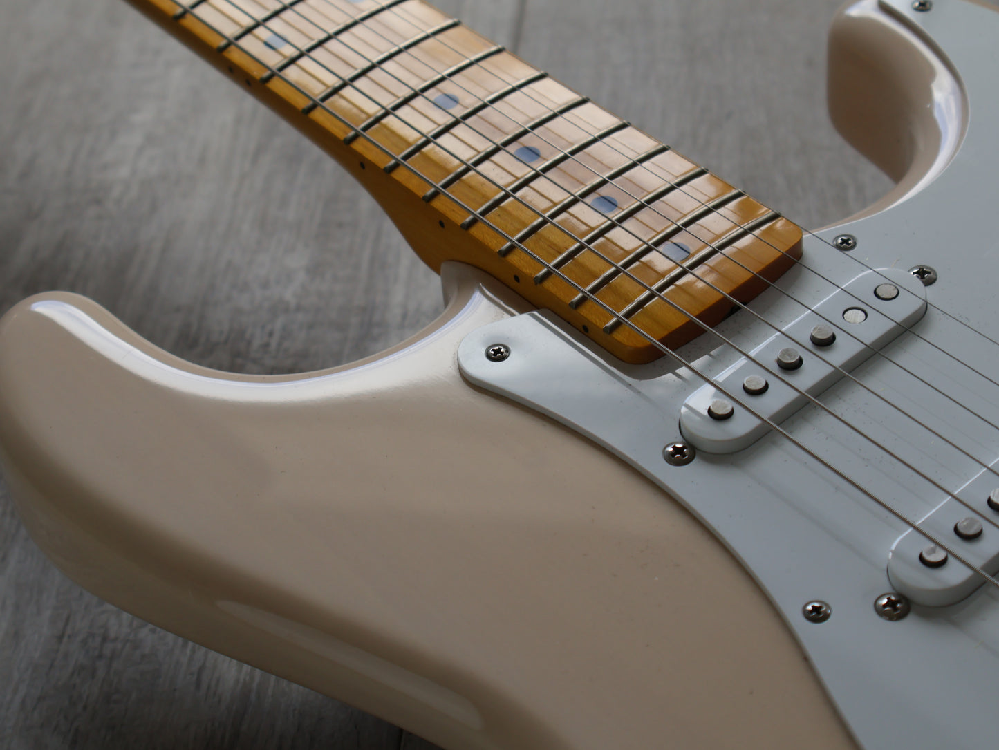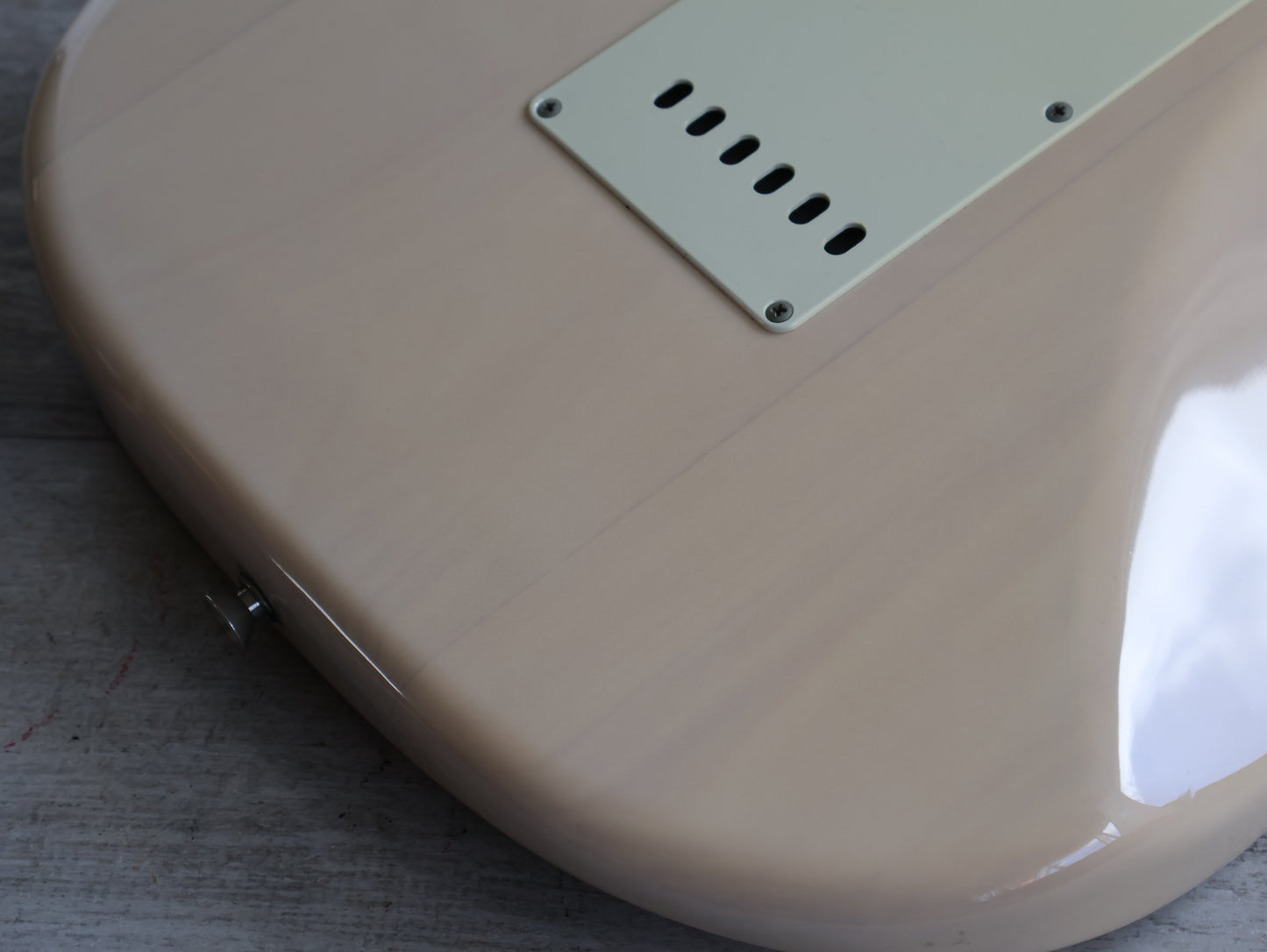 Made by the Tokai factory in 2006, the ST57-66US was a premium model '57 reissue by Fender Japan. Basswood body wearing a rare transparent "US Blonde" finish (that was usually saved for Telecaster models) bolted to a '57 profile one-piece maple neck (7.25" radius, 42mm nut width), it weighs 3.4kg's. Factory loaded with Fender USA ST-Vintage pickups, this one seems to be all original with Fender stamped saddles and vintage-style tuners.