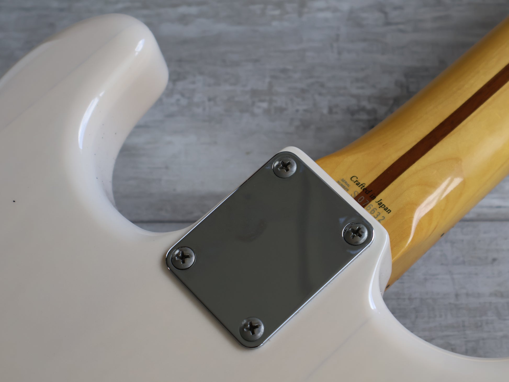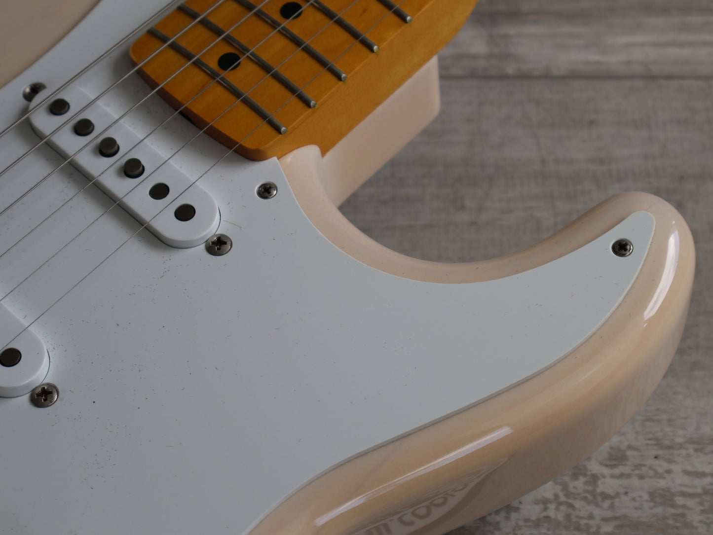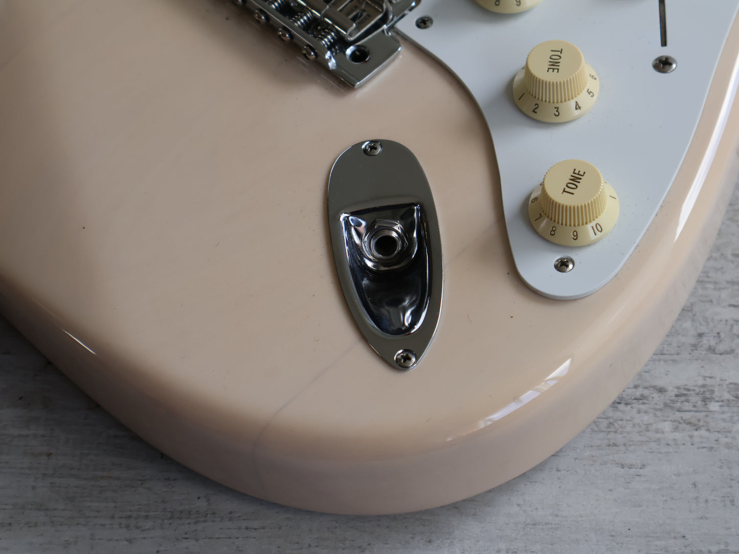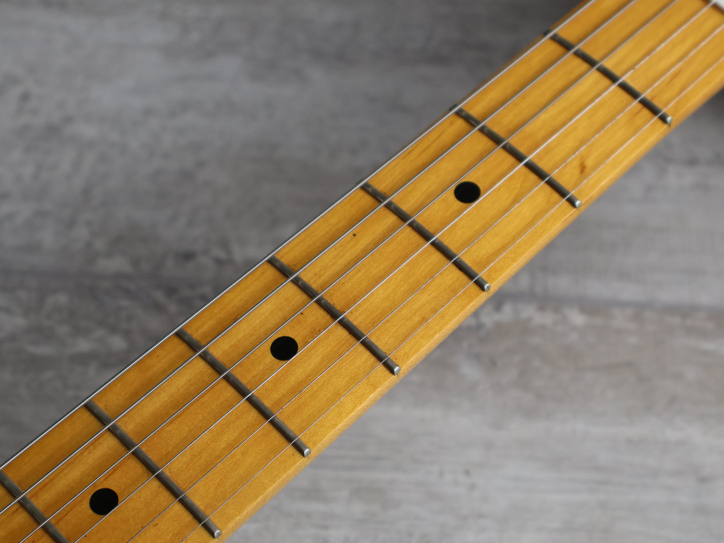 Made by the Tokai factory in 2006, the ST57-66US was a premium model '57 reissue by Fender Japan. Basswood body wearing a rare transparent "US Blonde" finish (that was usually saved for Telecaster models) bolted to a '57 profile one-piece maple neck (7.25" radius, 42mm nut width), it weighs 3.4kg's. Factory loaded with Fender USA ST-Vintage pickups, this one seems to be all original with Fender stamped saddles and vintage-style tuners.