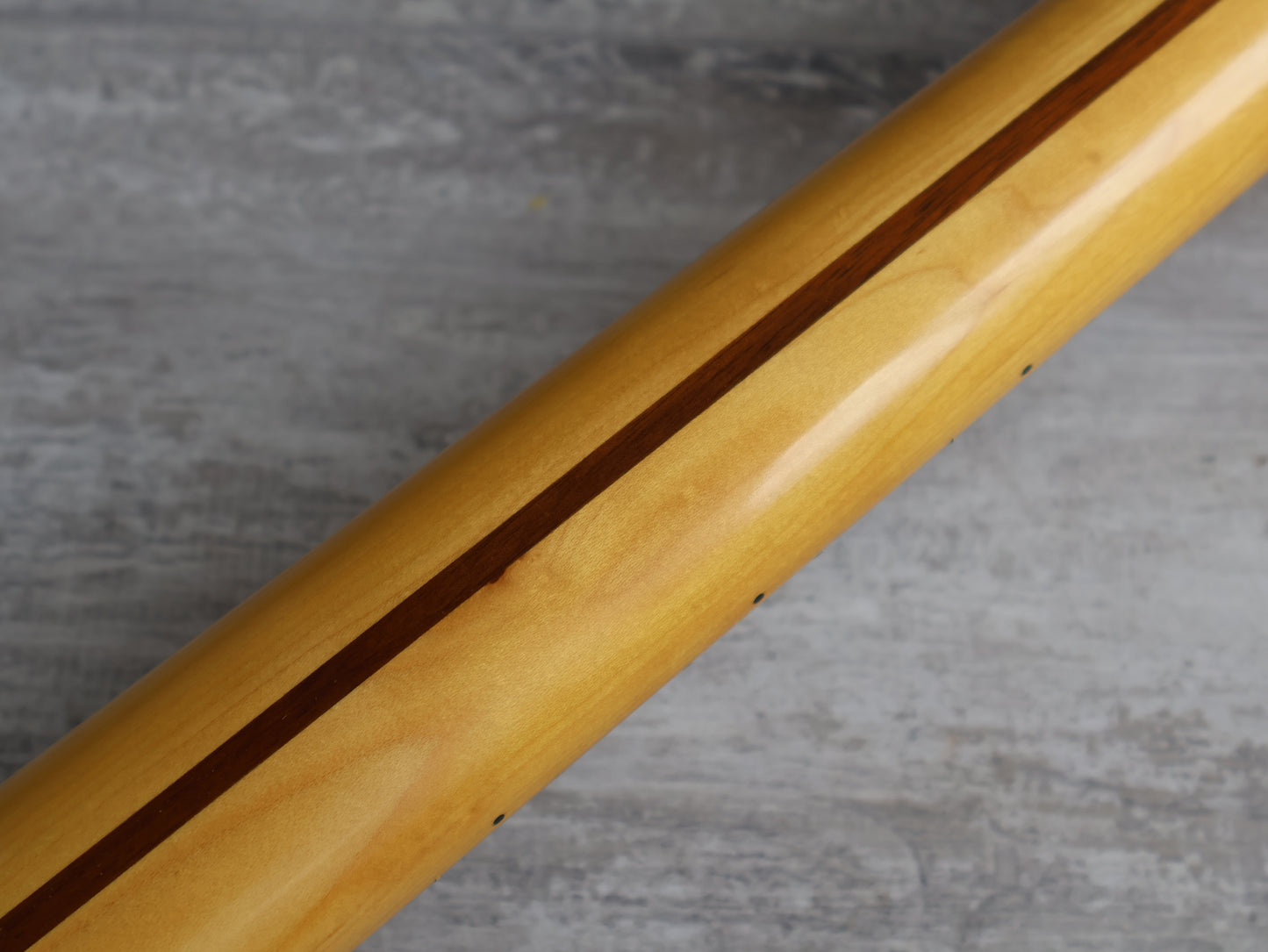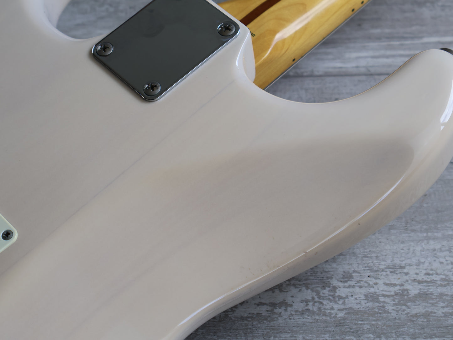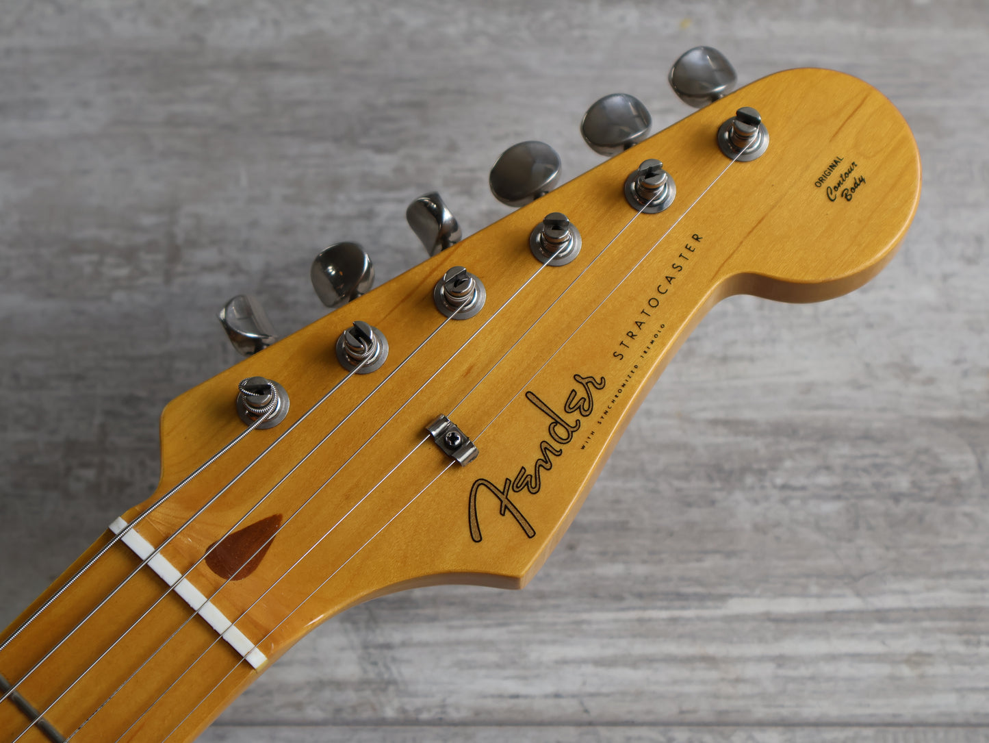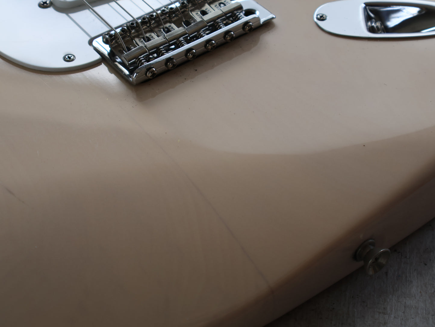 Made by the Tokai factory in 2006, the ST57-66US was a premium model '57 reissue by Fender Japan. Basswood body wearing a rare transparent "US Blonde" finish (that was usually saved for Telecaster models) bolted to a '57 profile one-piece maple neck (7.25" radius, 42mm nut width), it weighs 3.4kg's. Factory loaded with Fender USA ST-Vintage pickups, this one seems to be all original with Fender stamped saddles and vintage-style tuners.