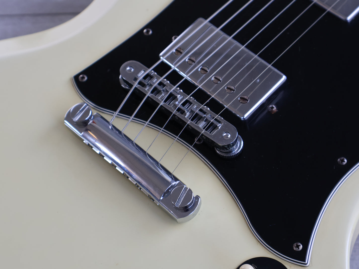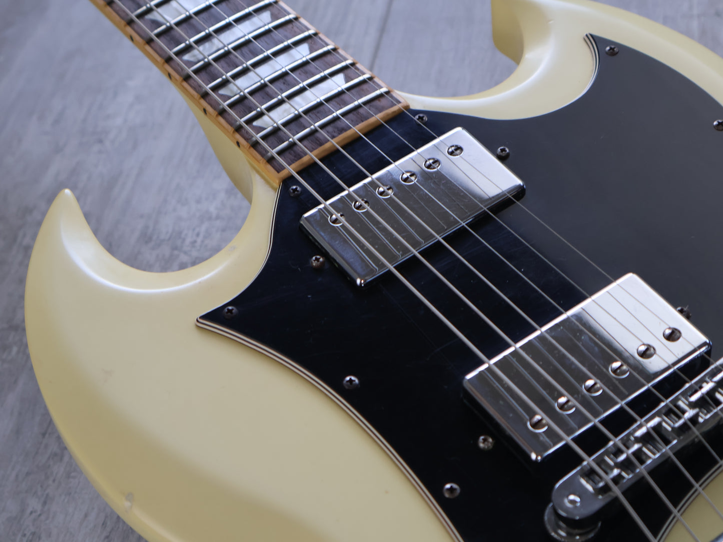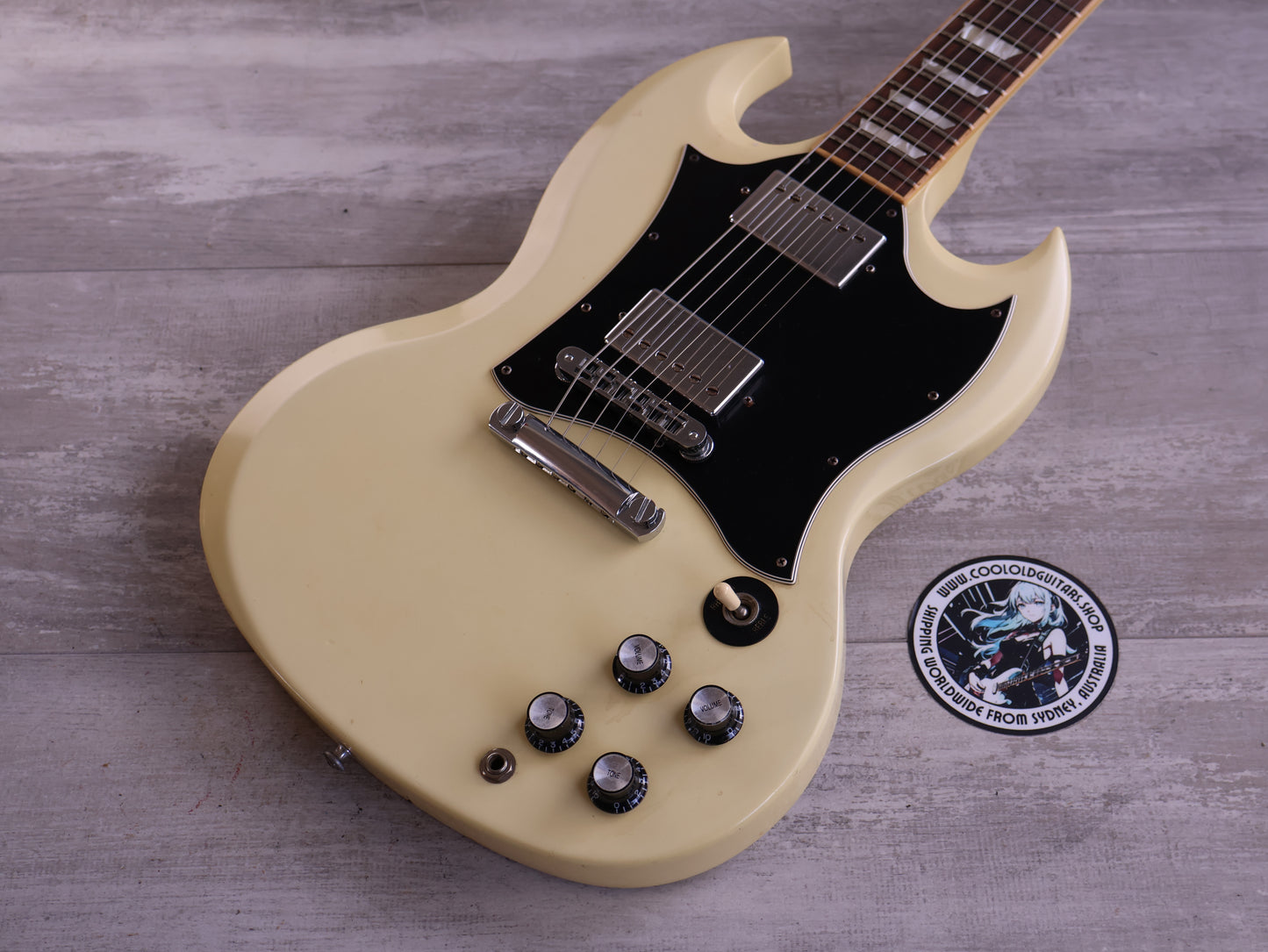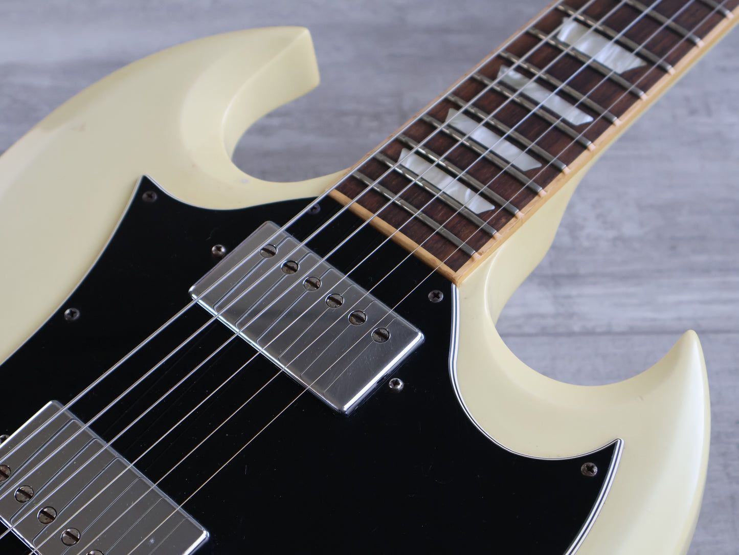 Made in the USA in 2006, this is an SG Standard that was sold to the Japanese market in a non-catalog "Aspen White" finish. Good used condition as pictured with light signs of playwear and general use, restrung and recently serviced. There's a few dings on the back of the neck that a previous owner filled and sanded back so they're reasonably smooth and not overly noticeable when playing. Plenty of life in the frets with a straight neck and fully functional truss, no breaks or repairs to the headstock or neck joint. Weighs 3.2kg's.