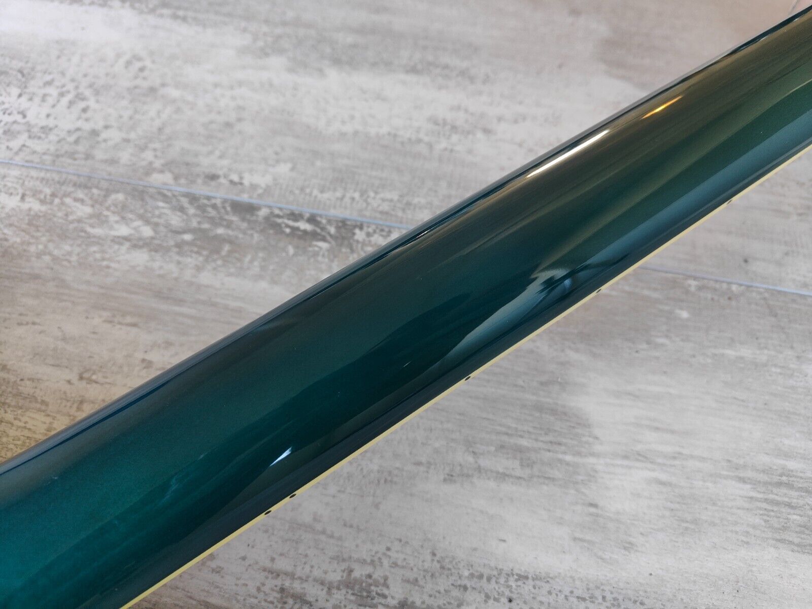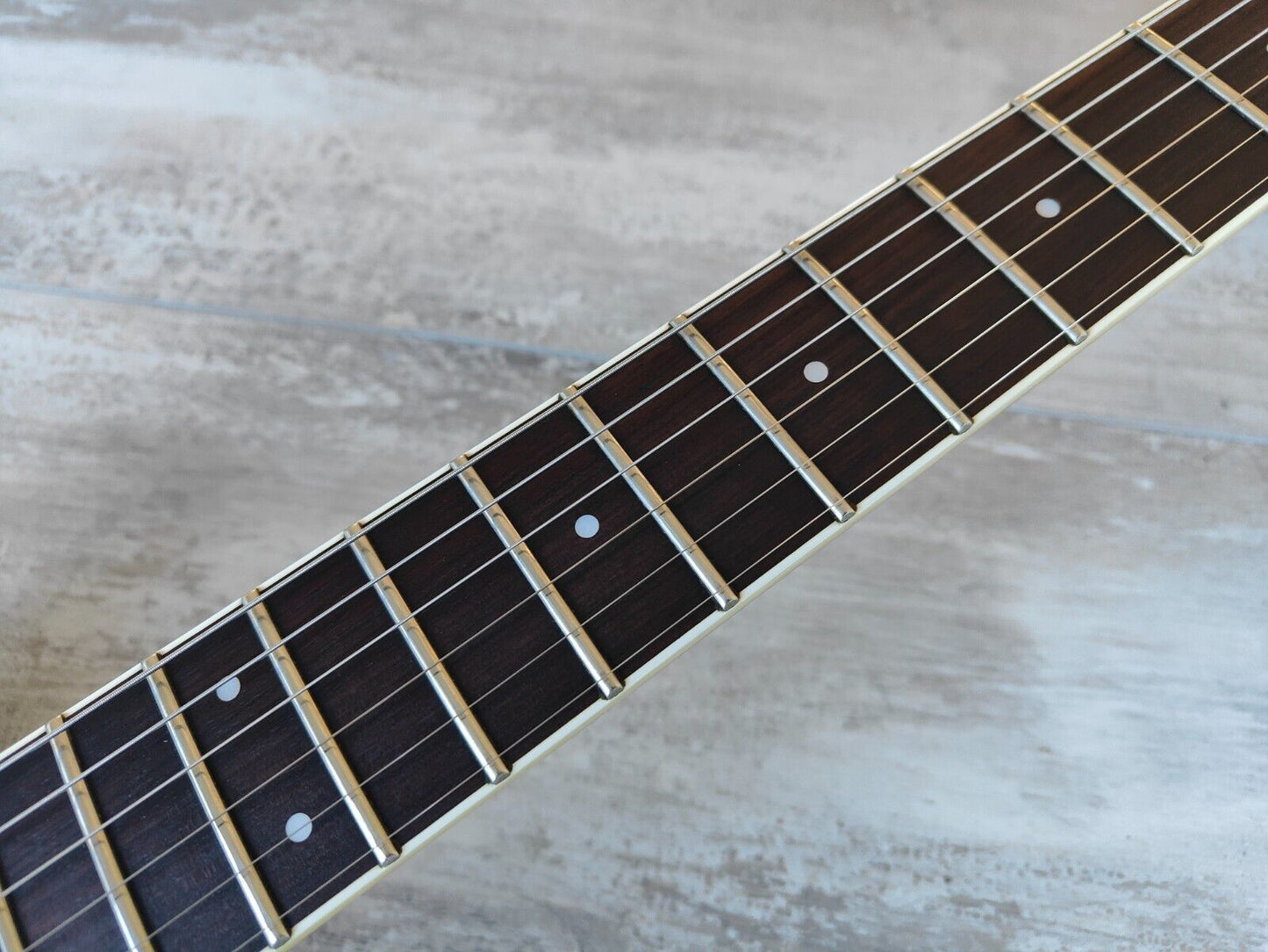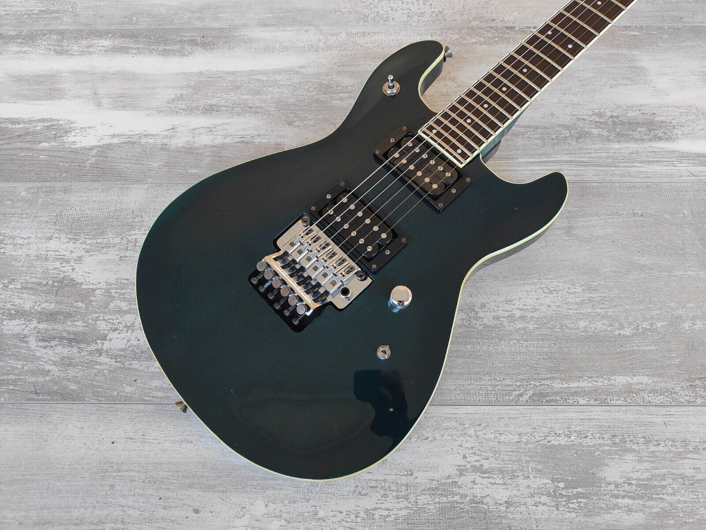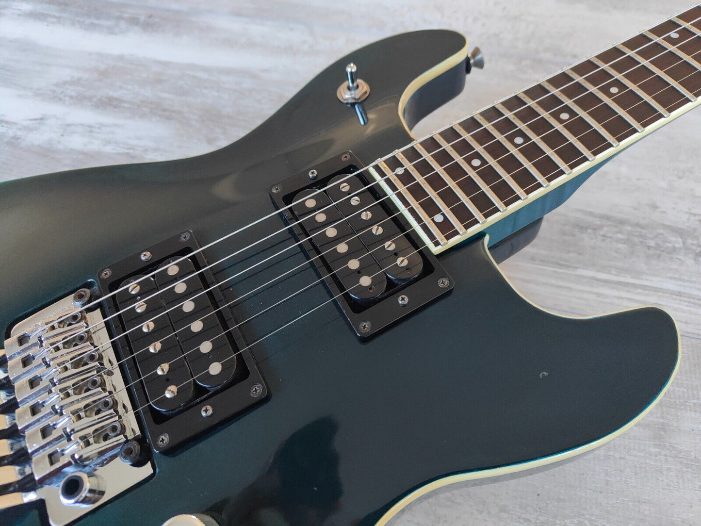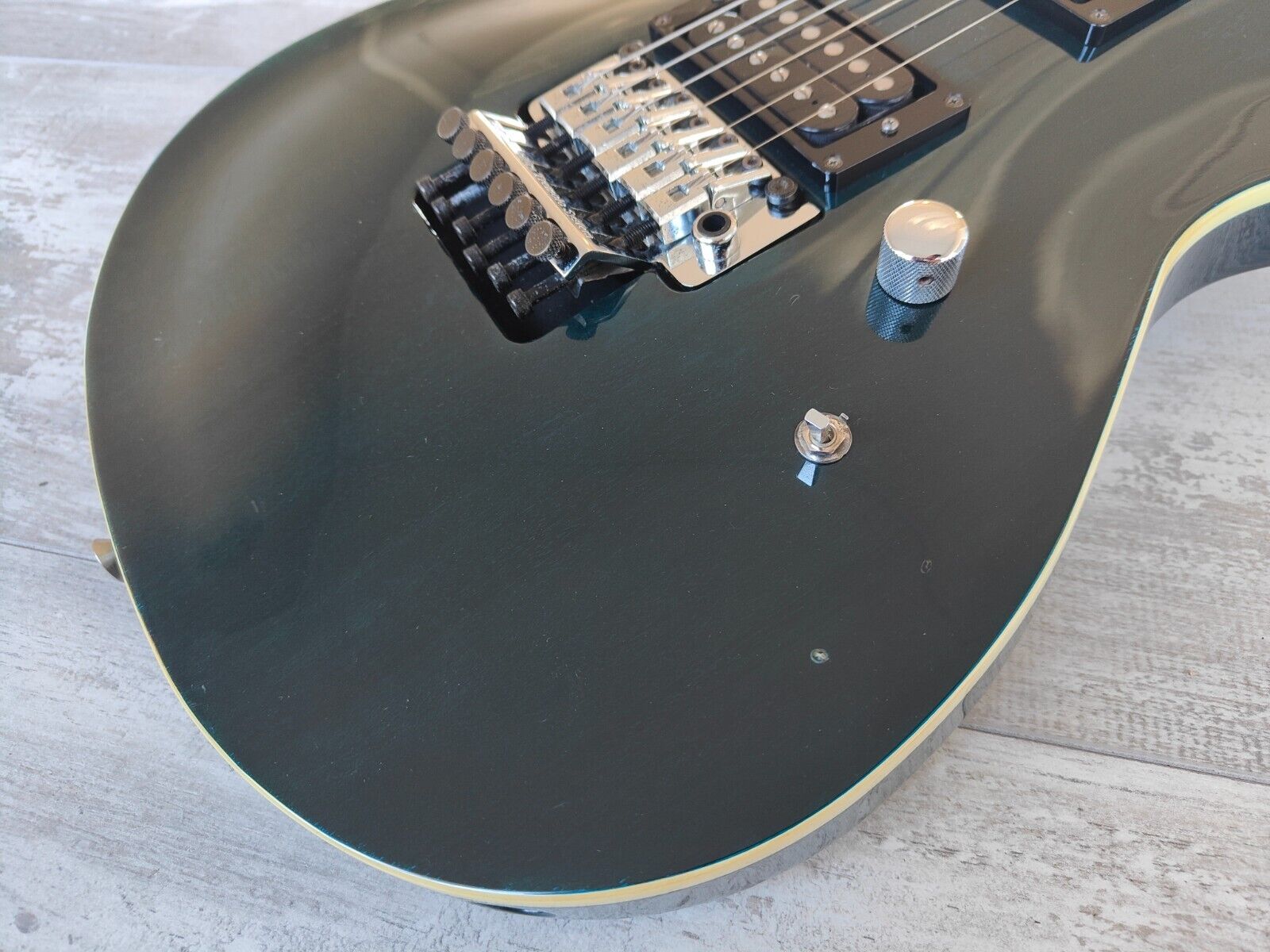 Made in Japan in 2007, the JDA-85Y was the artist model for You of Janne Da Arc (a Japanese band). Whether you've heard of the band or not, this is a really sweet guitar. Double cutaway mahogany body with a maple neck and bound rosewood fingerboard (24 frets, 628mm scale length), weighs 3.3kg's. Very nice deep transparent blue/green finish with cream binding looks great.
