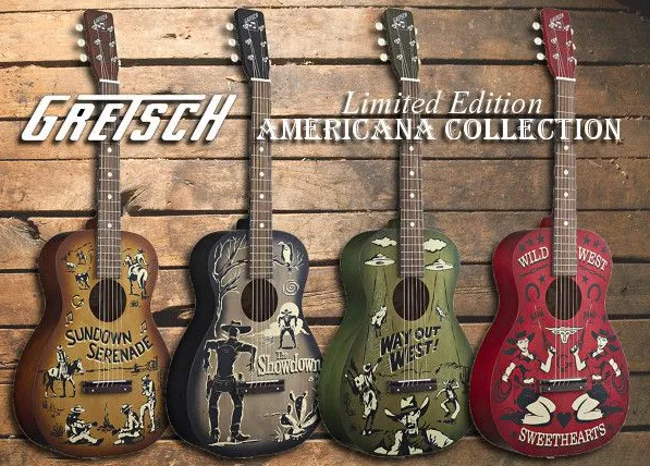 With the Americana Collection, Gretsch has created a unique line of acoustic guitars that are as interesting to look at as they are to play. The Americana Series features a 24" scale length with a steel reinforced neck. Constructed from real wood - yes, it's real wood - and it makes real guitar sounds! The Americana is a real treat to play, and sounds good, too. These beauties are a limited production run, and even the box is uniquely designed.