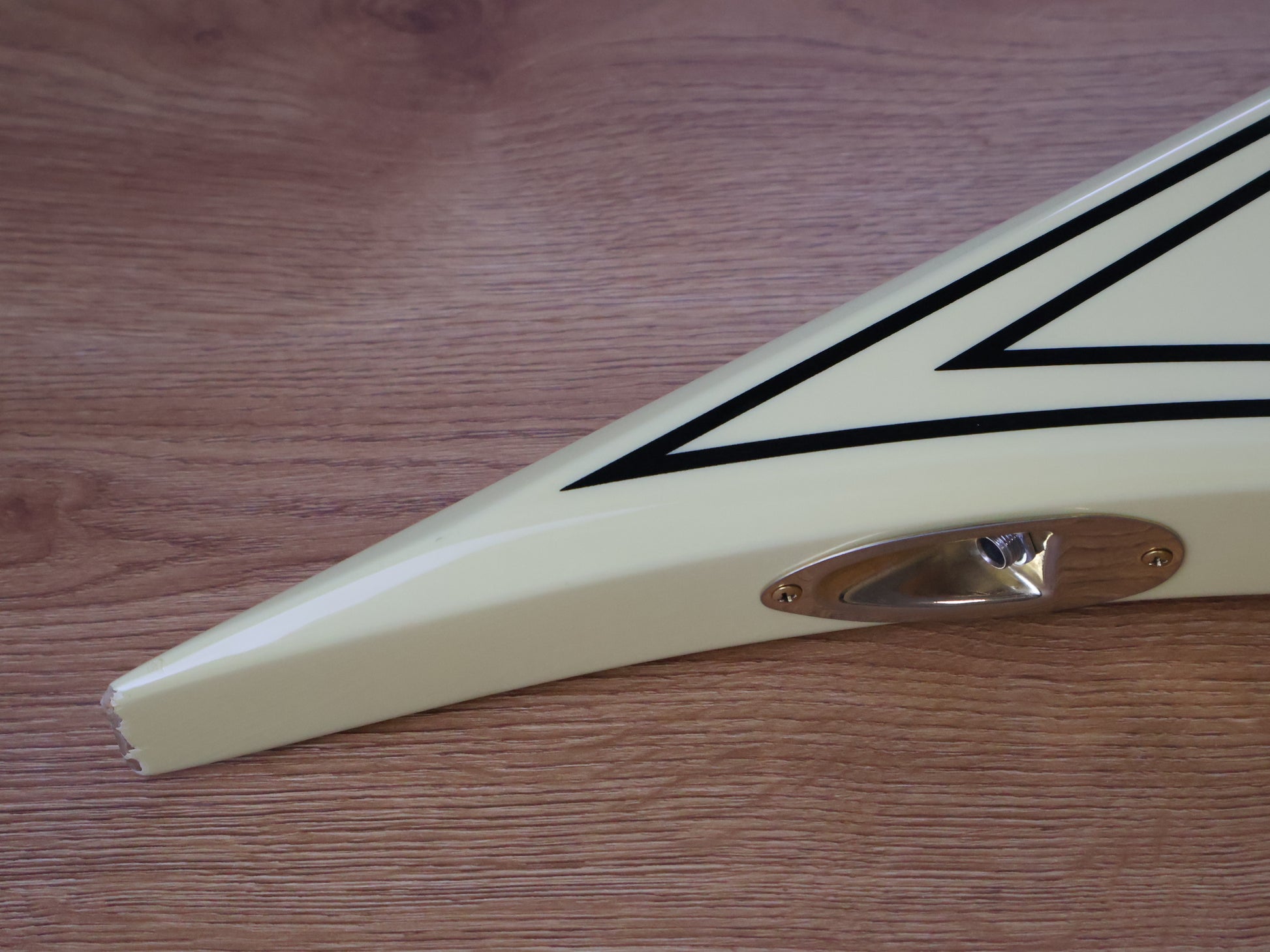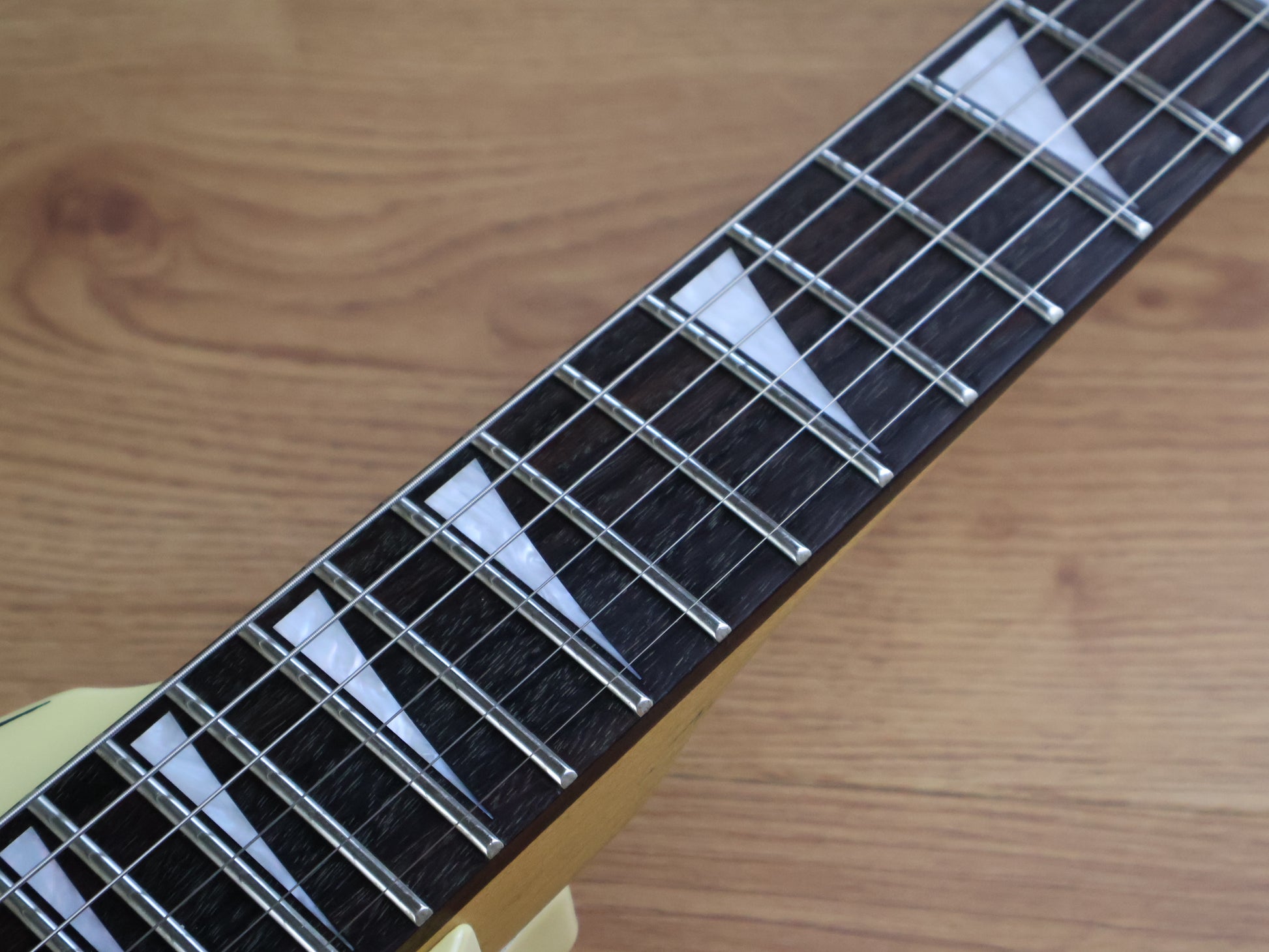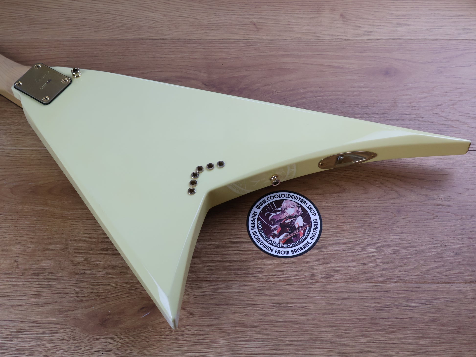Made in Japan by Jackson in 2007, this is a Japanese market Rhoads model flying V wearing the famous black pinstripes on an aged white body. Poplar build, maple bolt on neck with a 22 fret unbound rosewood fingerboard (648mm scale length), it weighs just over 3kg's.
