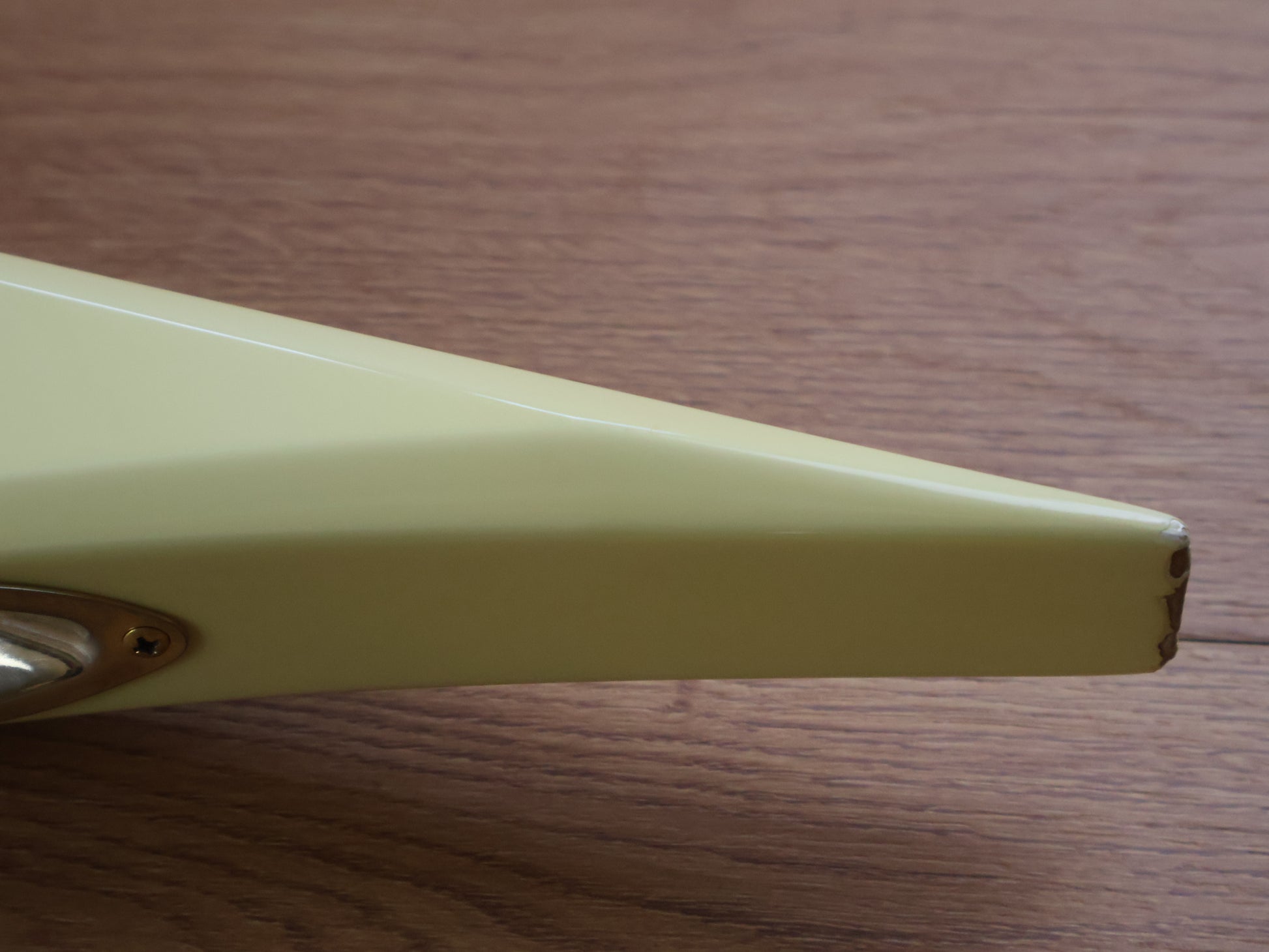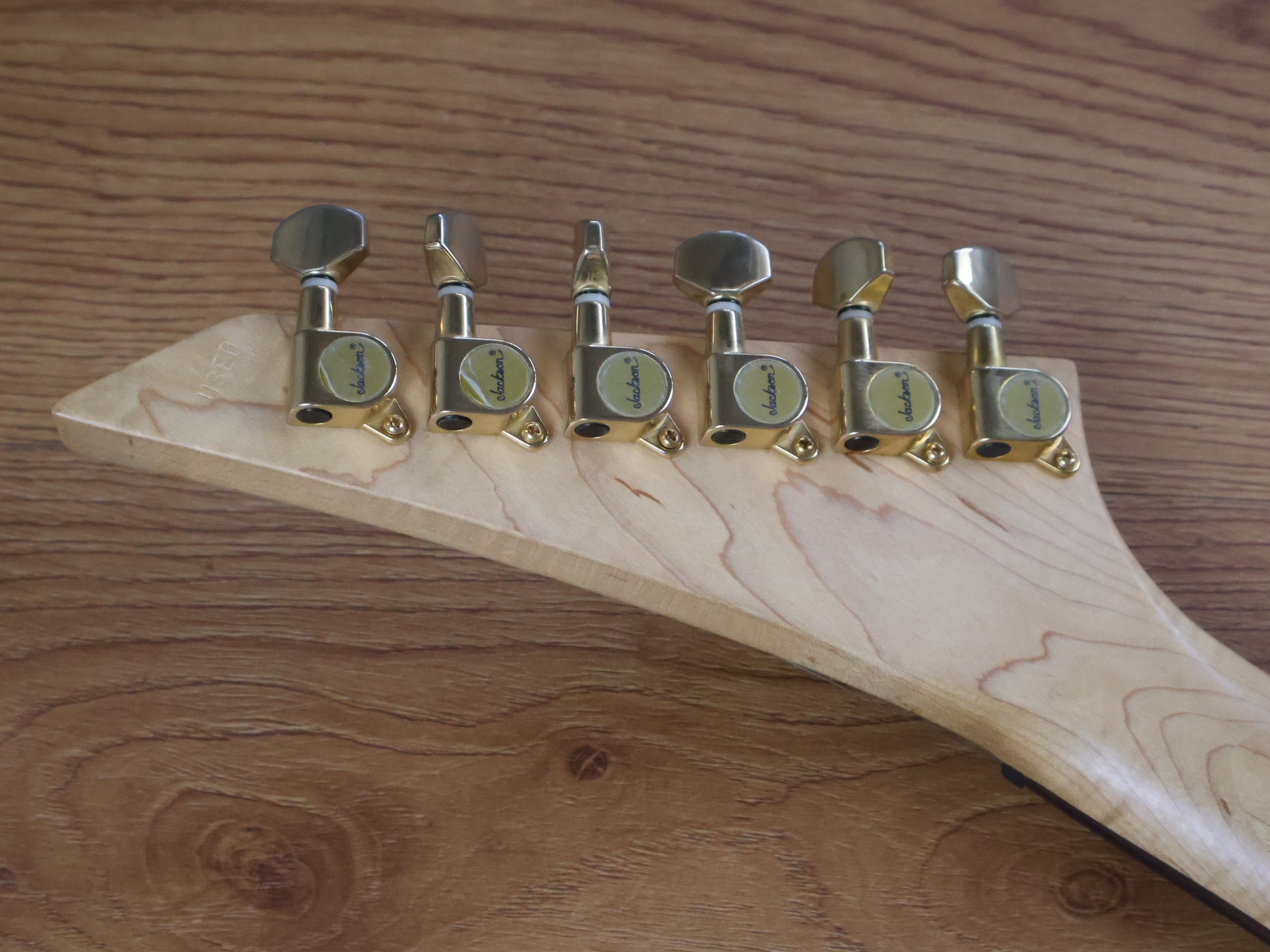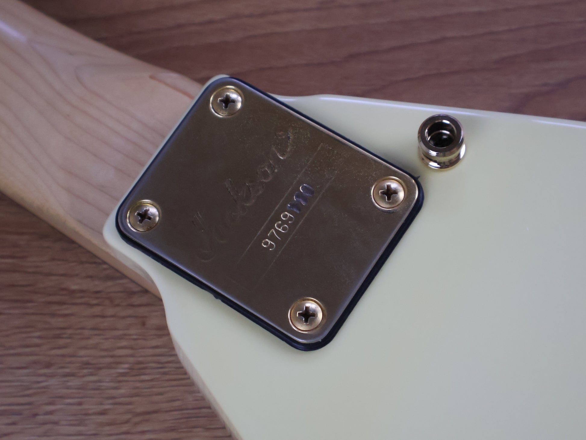 Made in Japan by Jackson in 2007, this is a Japanese market Rhoads model flying V wearing the famous black pinstripes on an aged white body. Poplar build, maple bolt on neck with a 22 fret unbound rosewood fingerboard (648mm scale length), it weighs just over 3kg's.