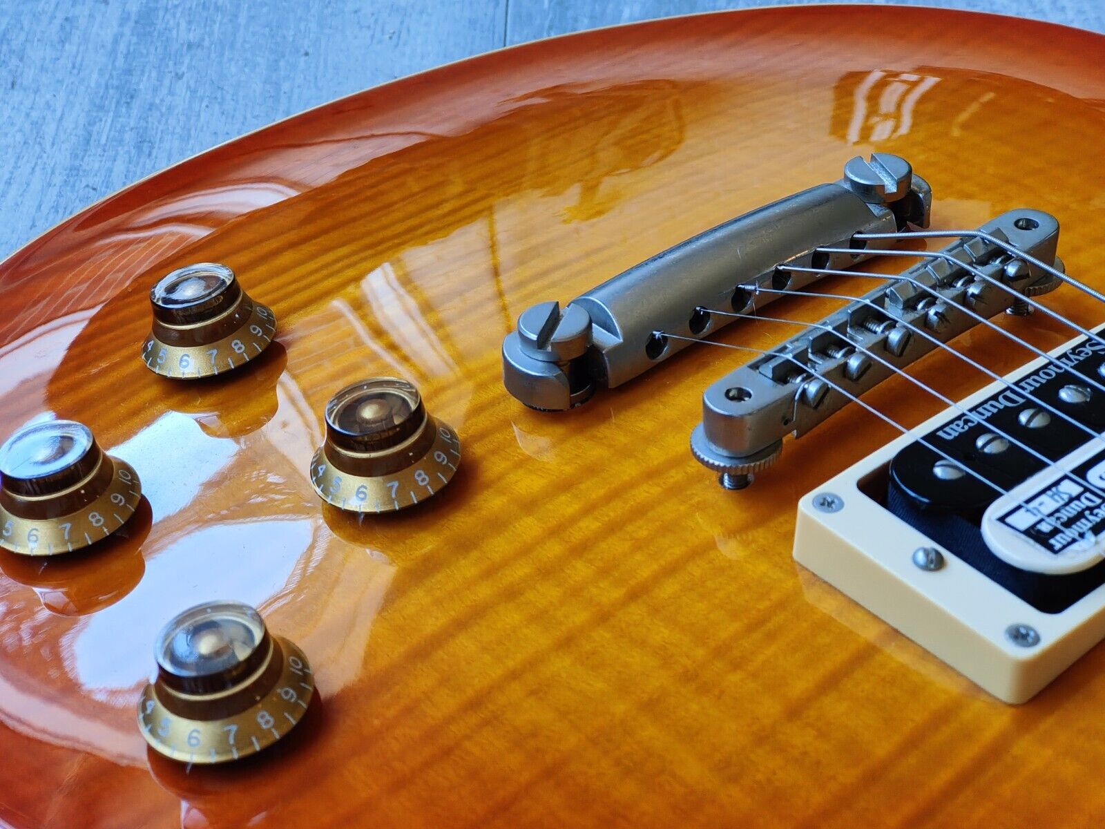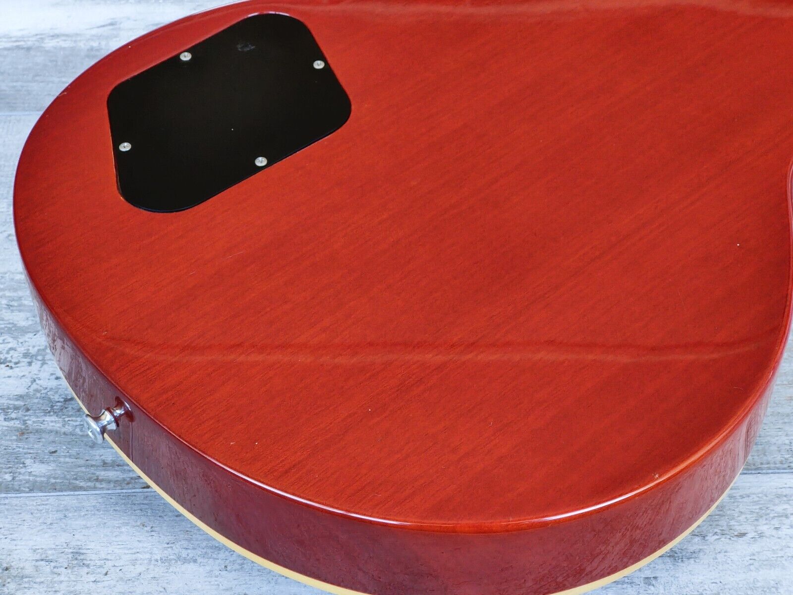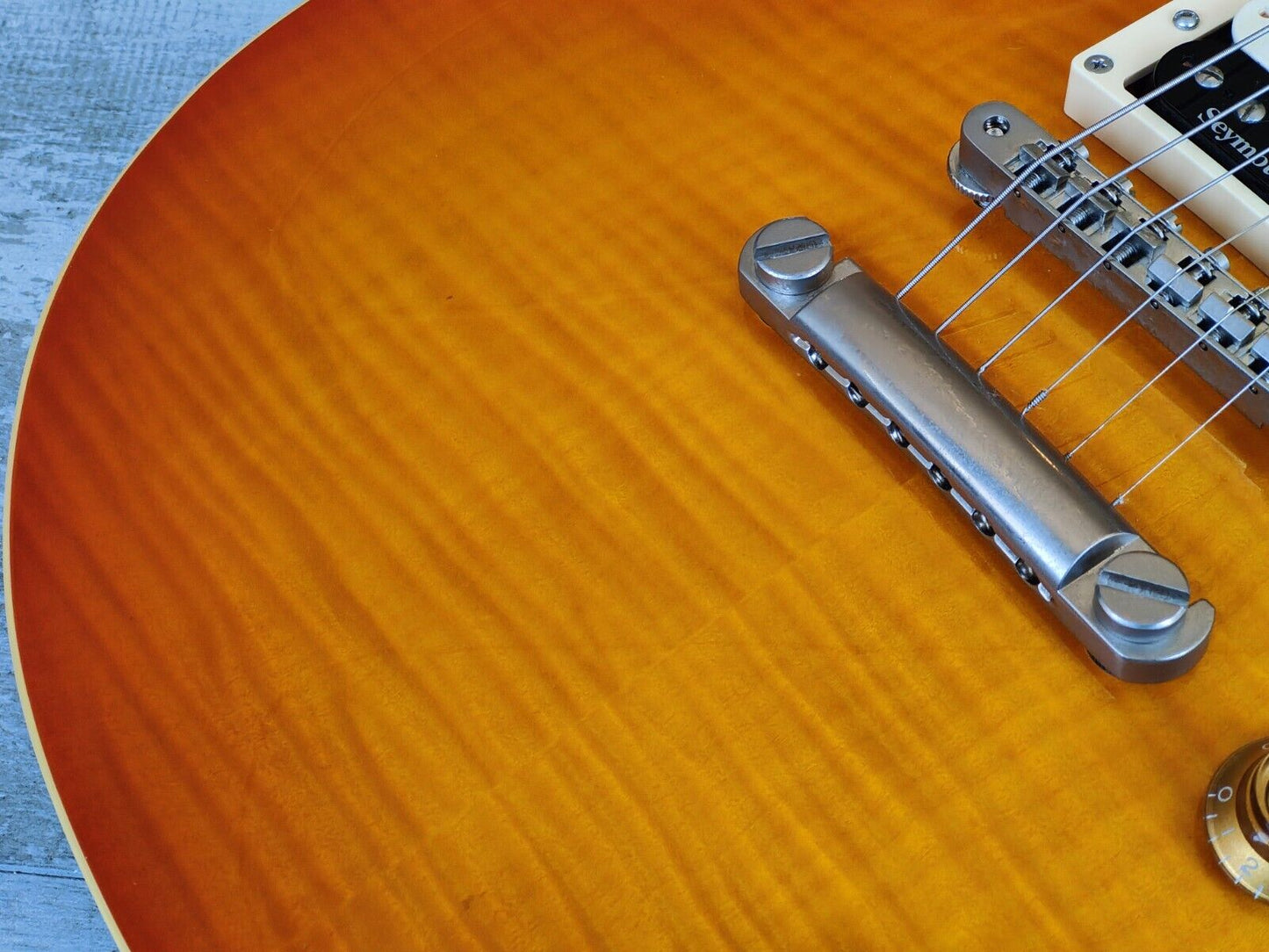 Made in Japan by Edwards in 2008, the E-LP-85SD is a super classy Les Paul from the more modern era of Japanese guitars. The 85SD model wears a poly Cherry Sunburst finish (with no pickguard) on a mahogany body with a laminate maple flame top, a slim 60's style mahogany neck with a rosewood fingerboard (43mm nut, 12" radius), it weighs 3.5kg's. Factory loaded with a pair of Seymour Duncan SH-1n/4 pickups and Gotoh hardware.