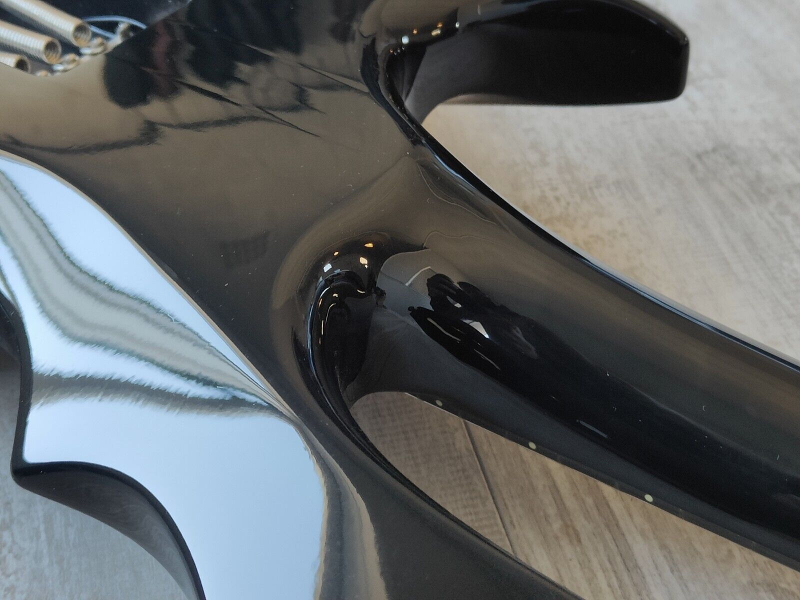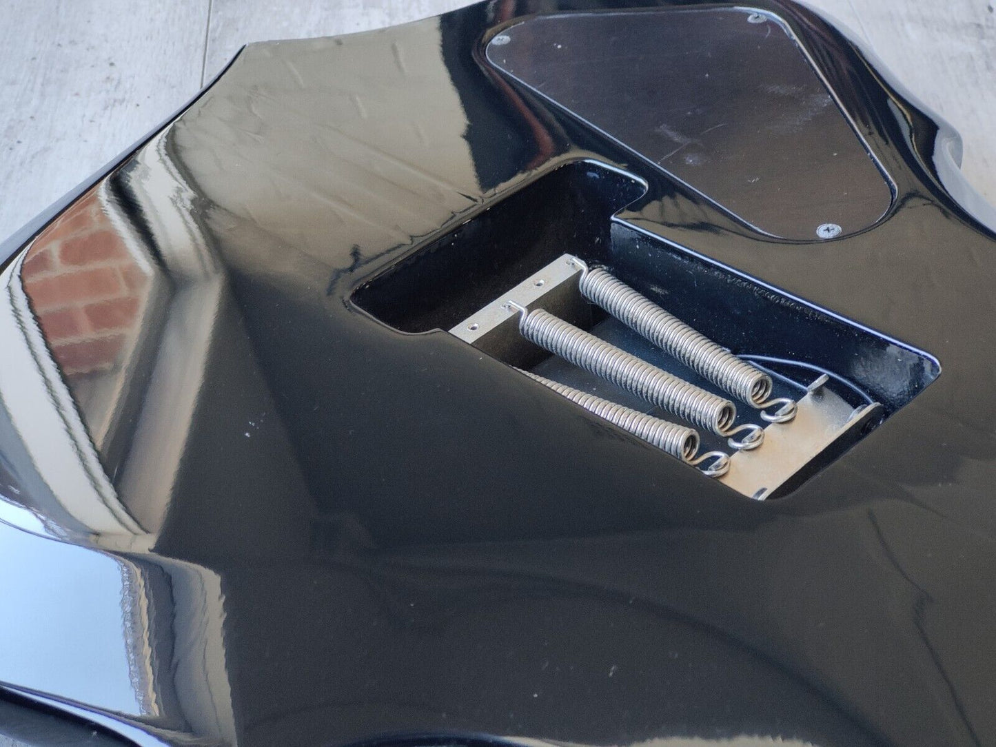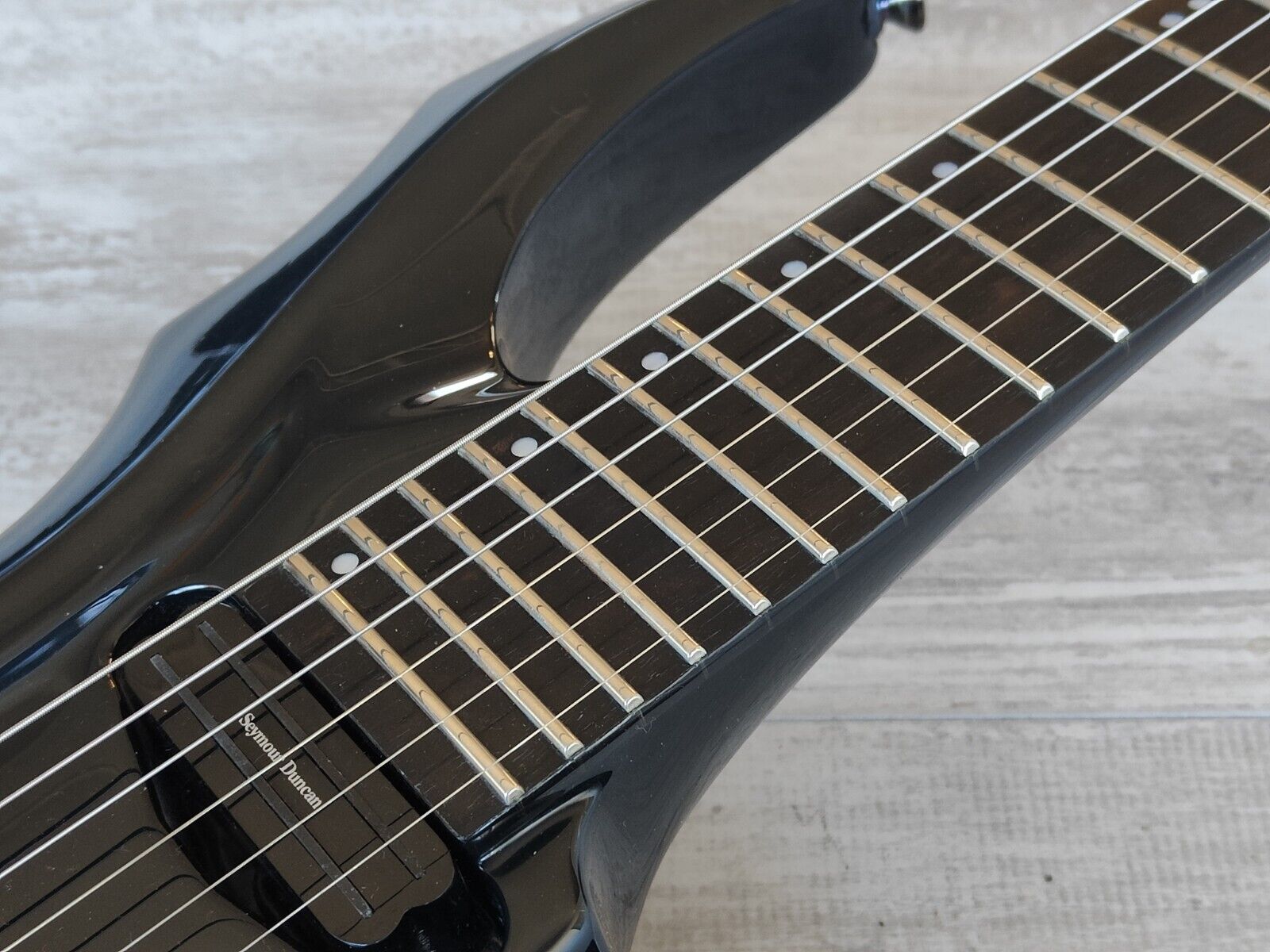 The E-FR-140GT/BA was an exceptional build with a 7-piece maple/walnut neckthrough design, maple top, alder back and a 24 fret ebony fingerboard. 12" radius with a 648mm scale length, it weighs 3.6kg's. Stock components include GOTOH tuners, a Floyd Rose (FRT-5000) tremolo and Seymour Duncan SHR-1n/TB-4 pickups.