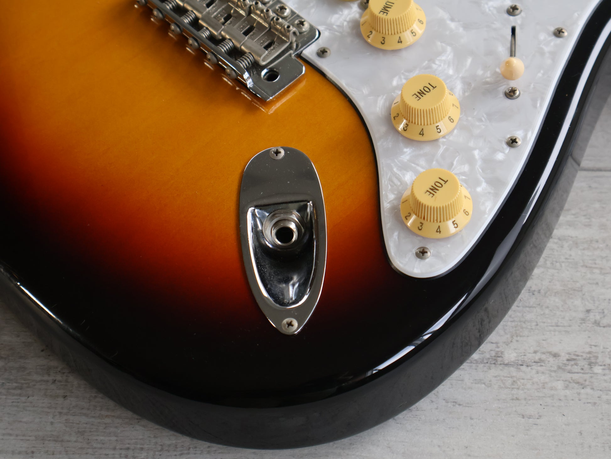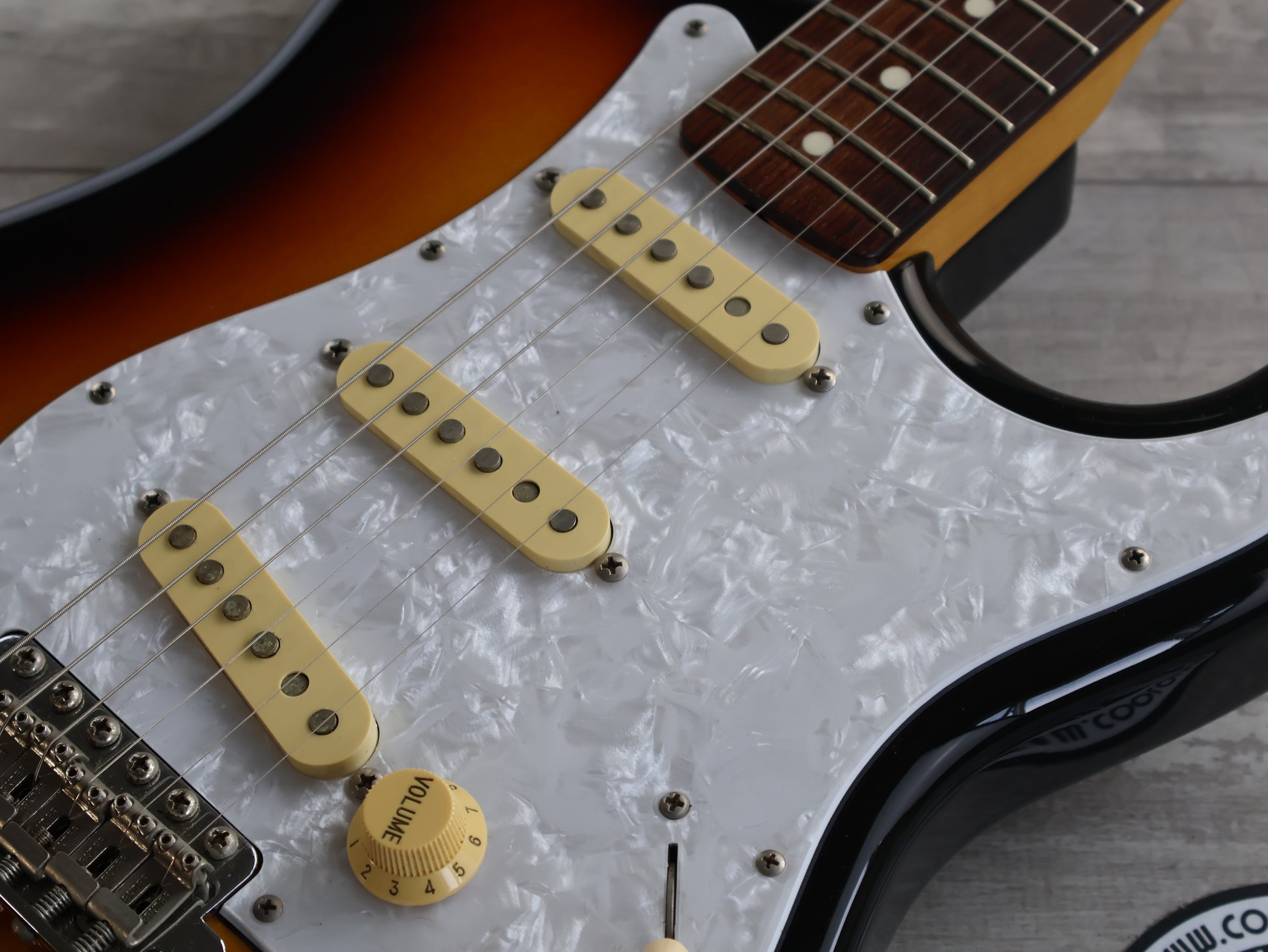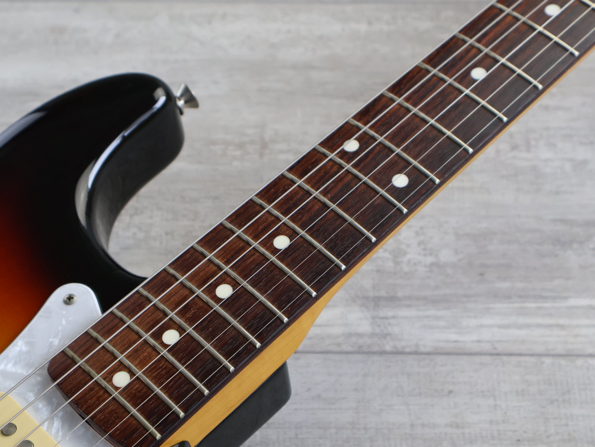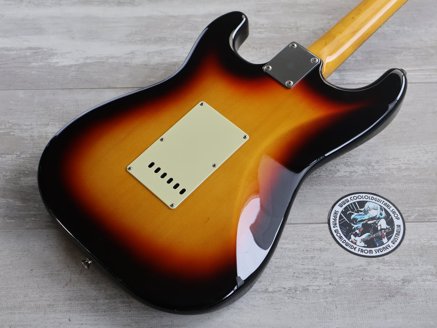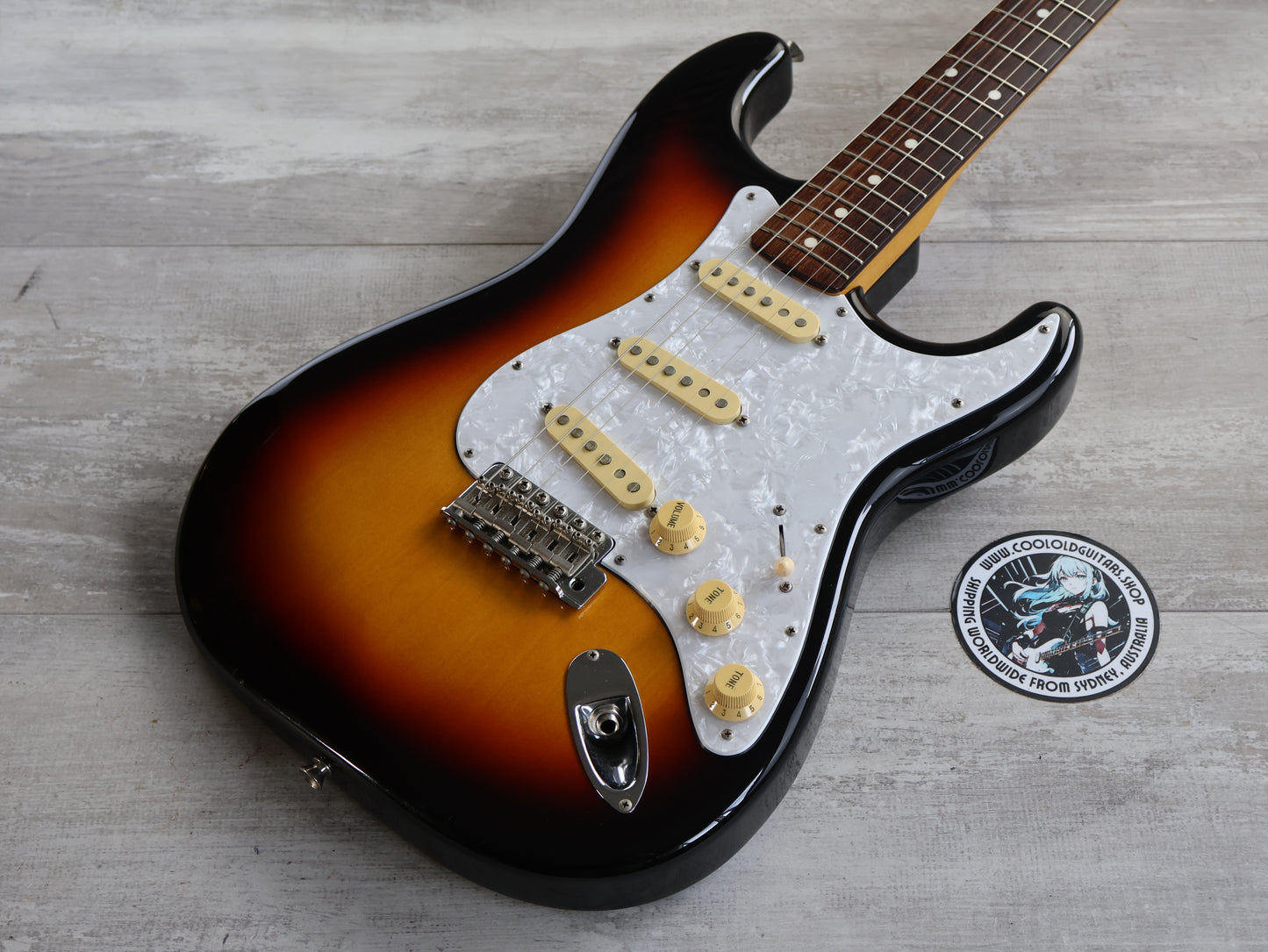 Loaded with the original Japanese ceramic single coil pickups and Japanese pots with a 5-way switch, this one seems all original apart from an aftermarket white pearloid style pickguard.