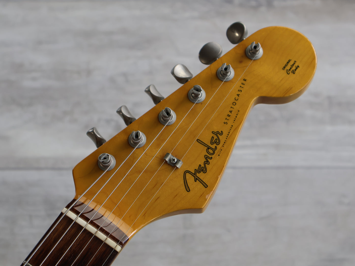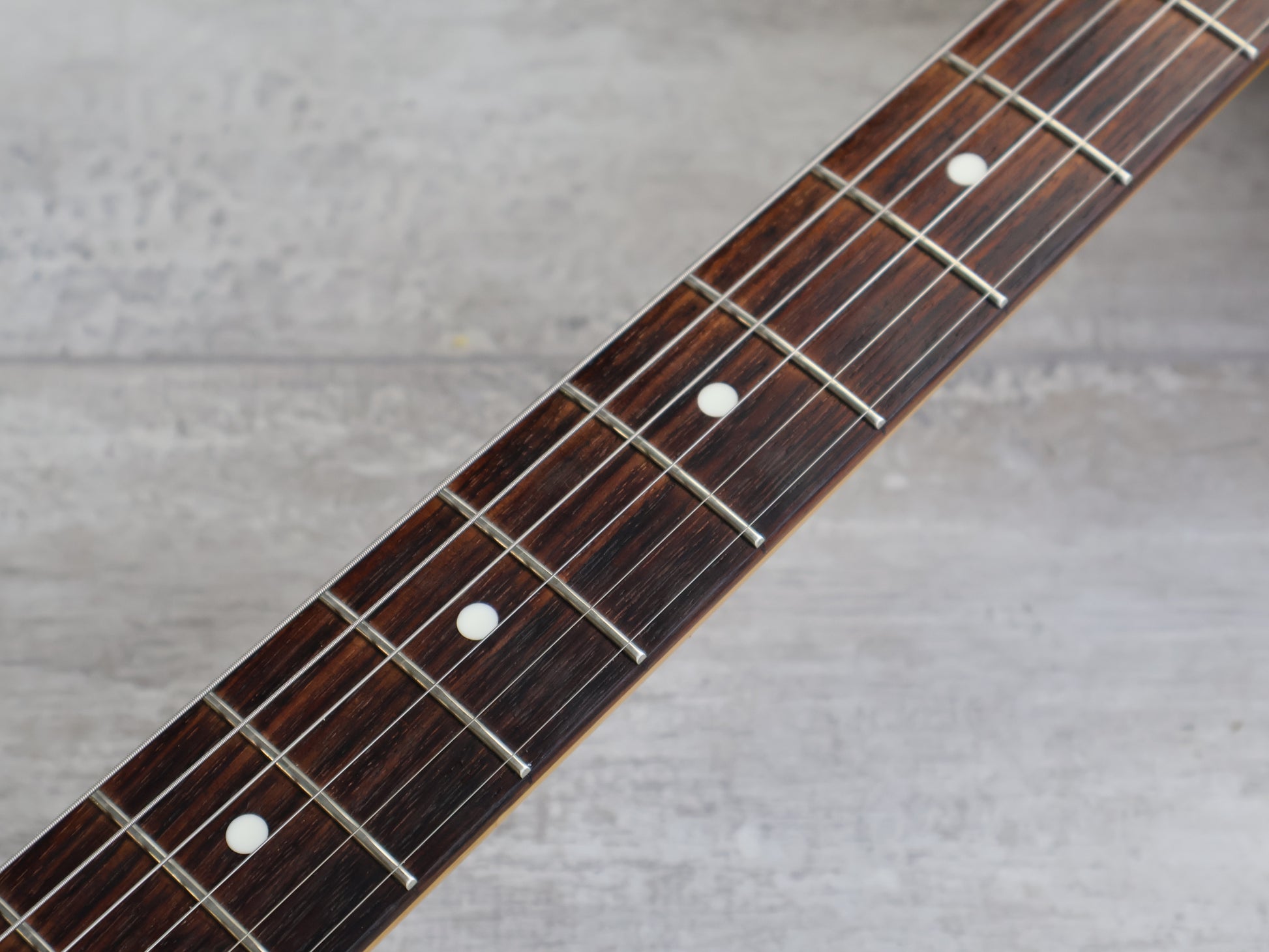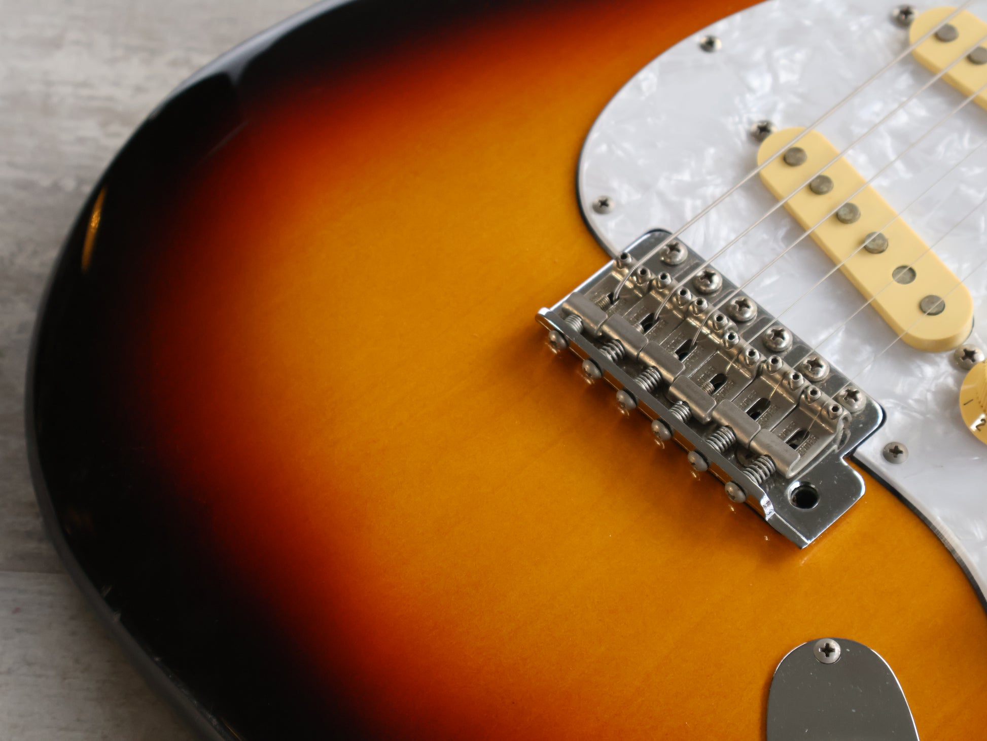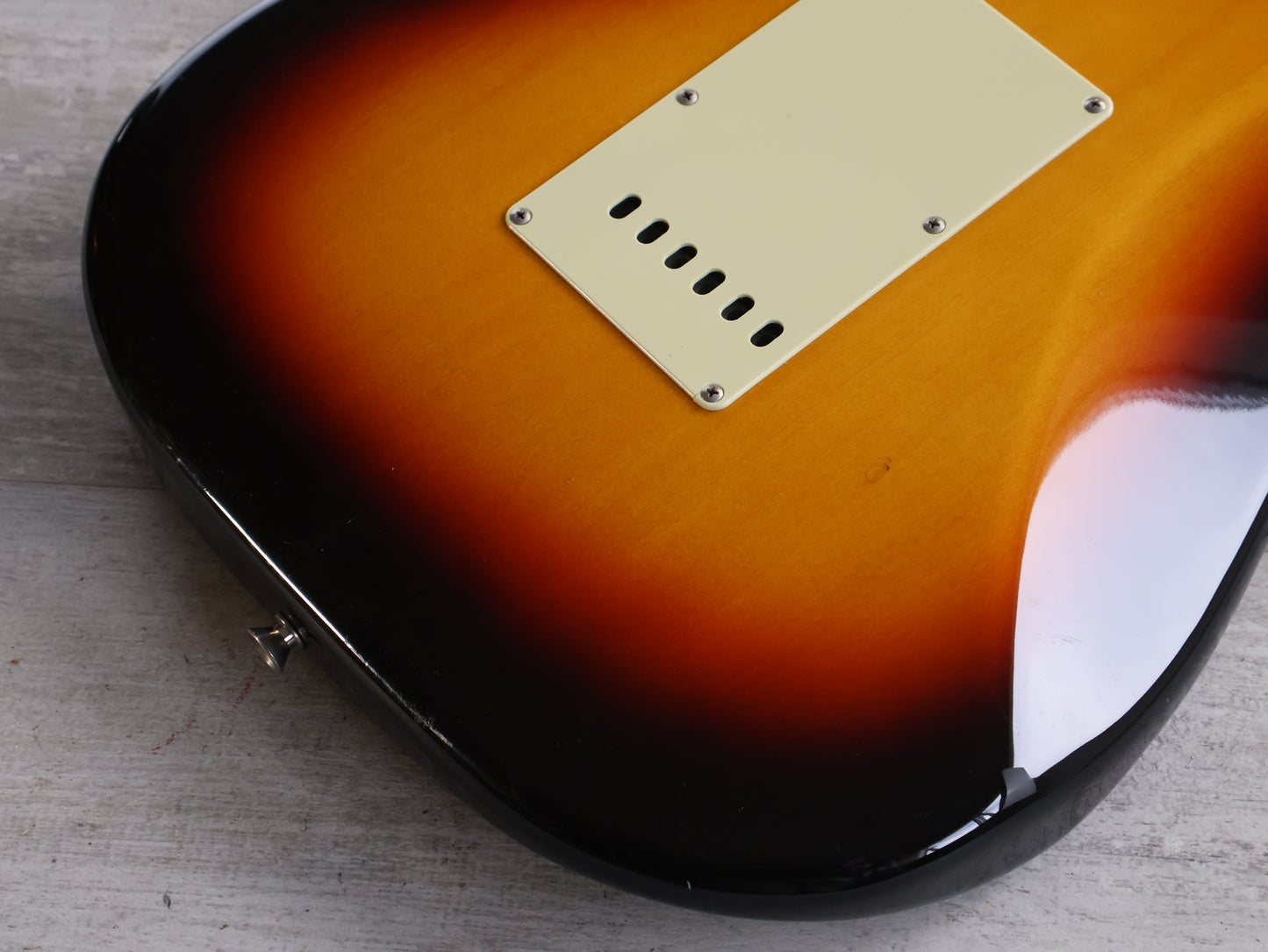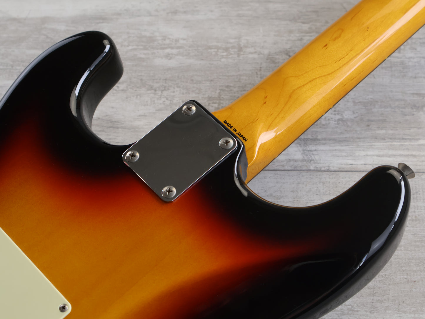Loaded with the original Japanese ceramic single coil pickups and Japanese pots with a 5-way switch, this one seems all original apart from an aftermarket white pearloid style pickguard.