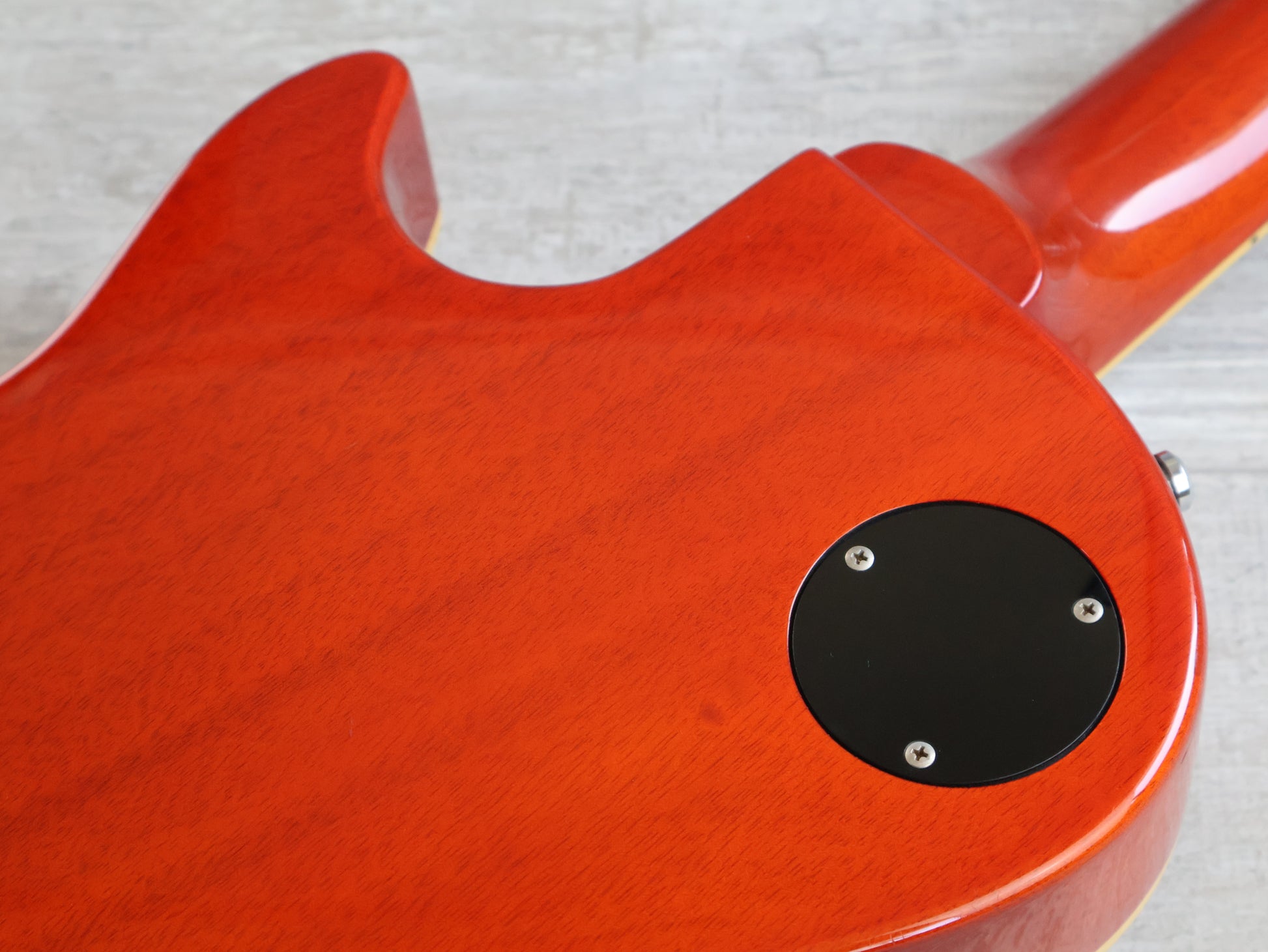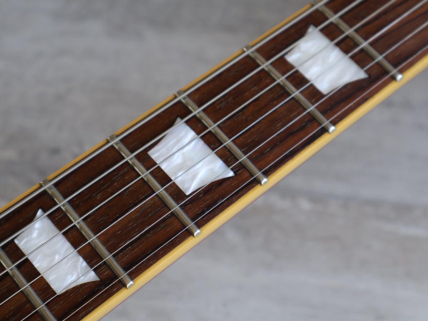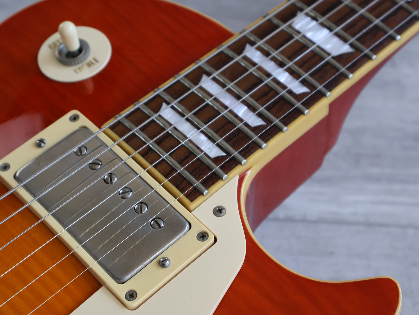 Made in Japan by Edwards in 2011, the E-LP-108SD is a super classy Les Paul from the more modern era of Japanese guitars. Mahogany body with a laminate maple flame top, slim 60's mahogany neck with a rosewood fingerboard (43mm nut, 12" radius), it weighs 3.4kg's. Factory loaded with a pair of Seymour Duncan SH-1n/4 pickups and Gotoh hardware including upgraded Gotoh locking tuners.