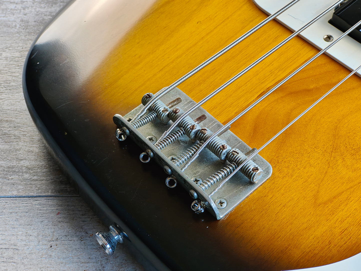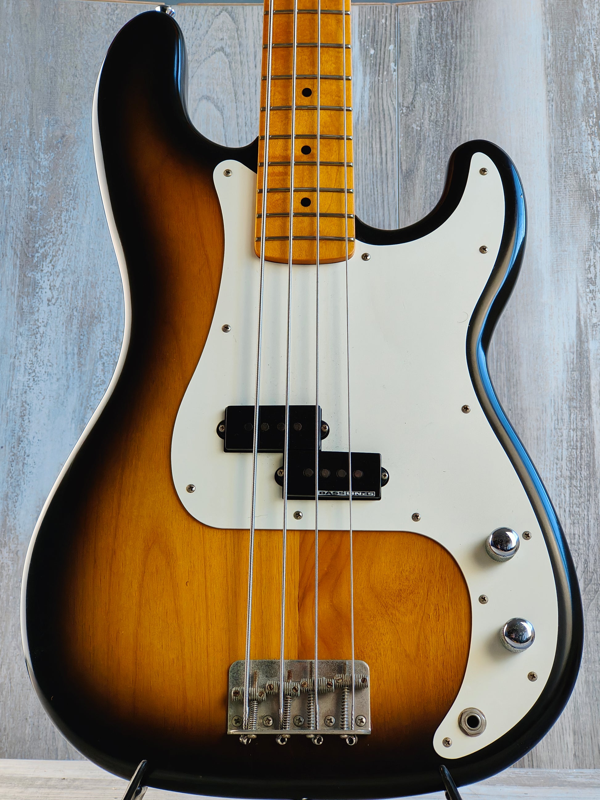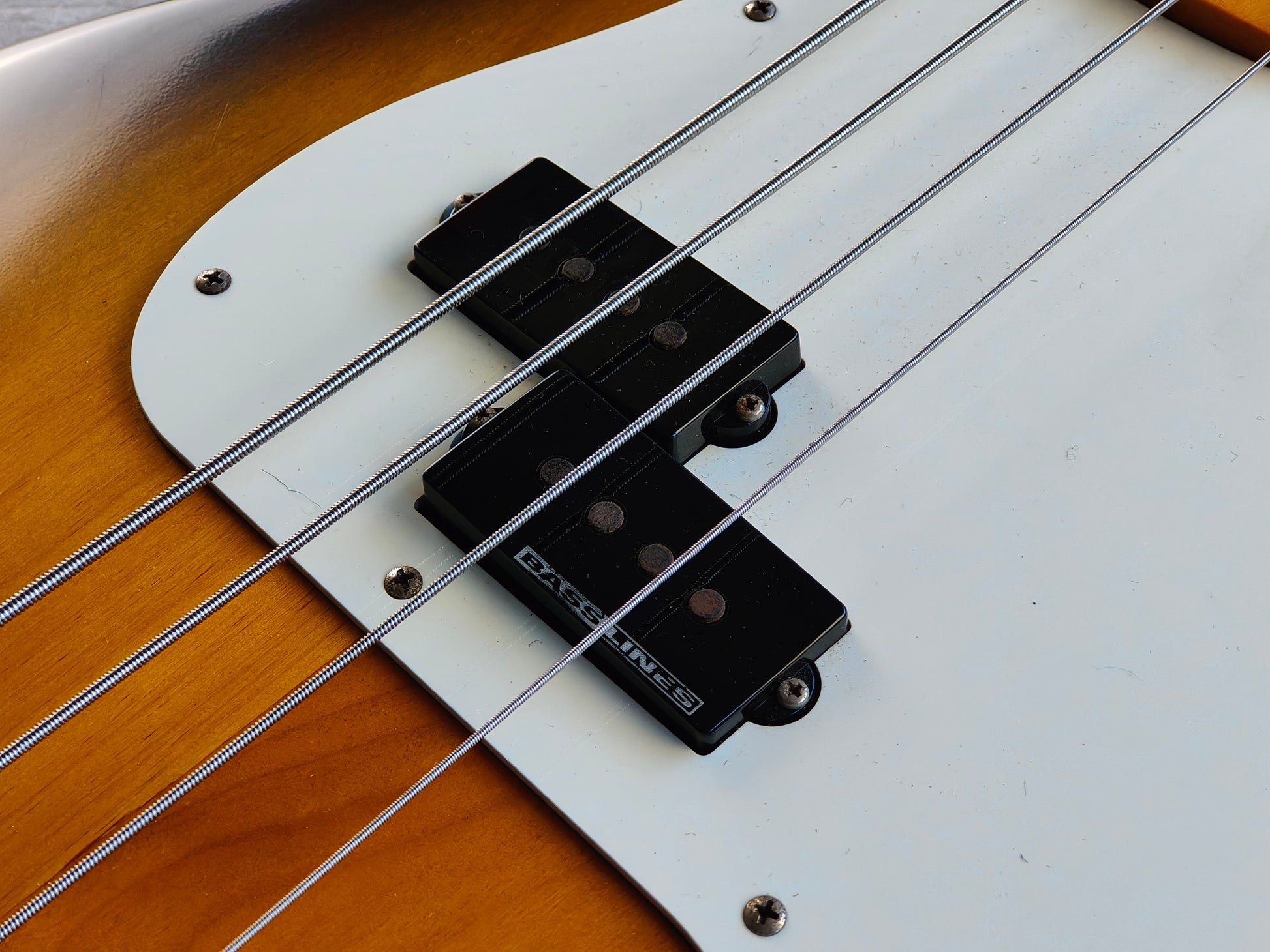 Loaded with a Basslines pickup with master volume/tone controls and a dual-sound (series/parallel) push/pull switch on the tone knob along with the original vintage style bridge with spiral saddles and Gotoh tuners.