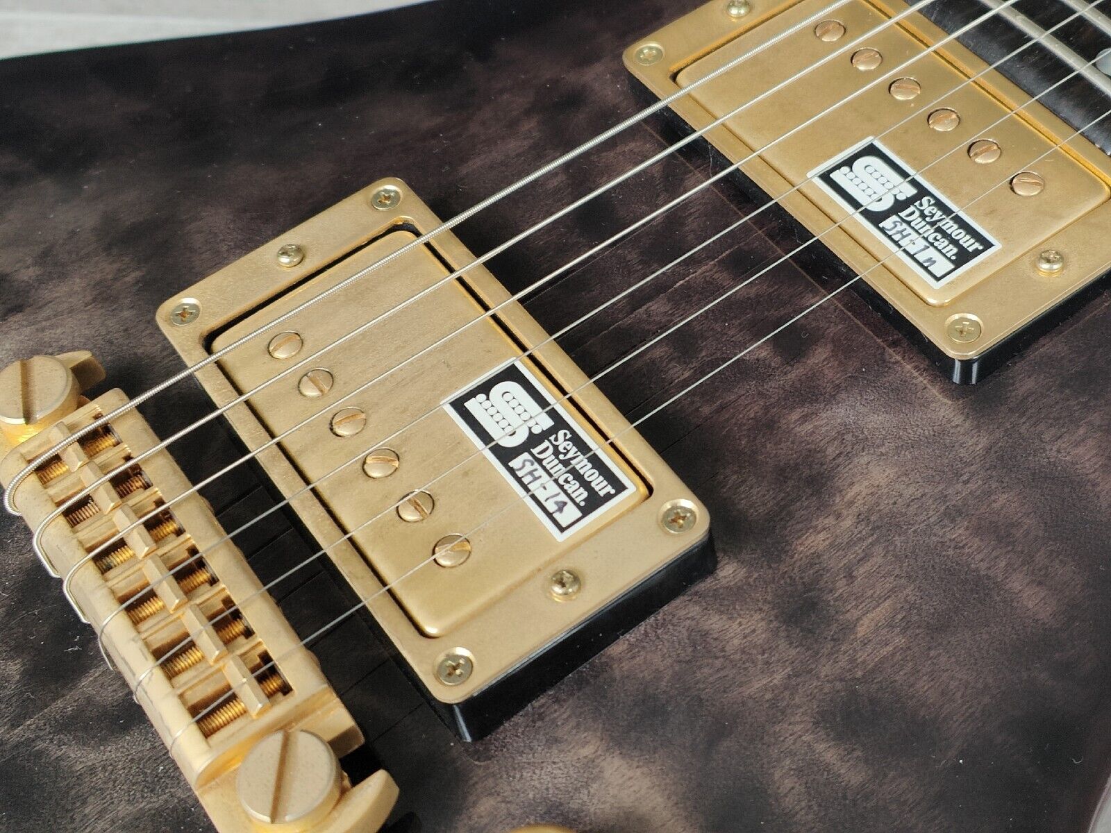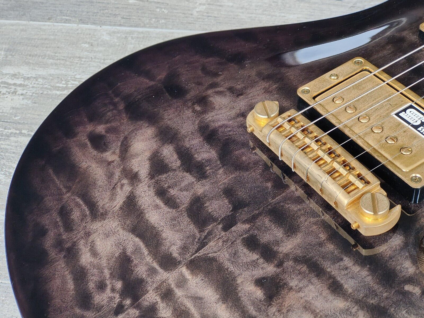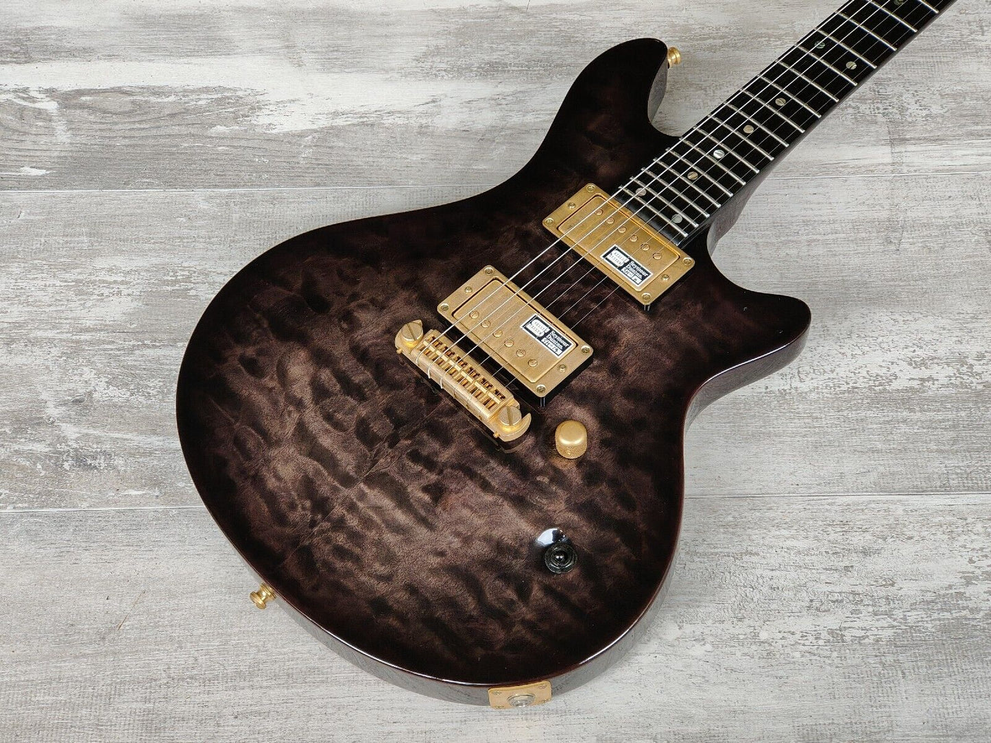 Made in Japan under the eyes of ESP, this is one of the Edwards artist models made with input from Uruha of "the GazettE". Quilt maple veneer top with a mahogany back and slim 60's maple neck, 24 fret ebony fingerboard (648mm scale length, dot inlays), it weighs 3.7kg's. Factory loaded with a TonePros AVT2G wraparound tailpiece along with gold Seymour Duncan SH-1N/SH-14 humbuckers controlled by a master volume knob and a three-way pickup selector.