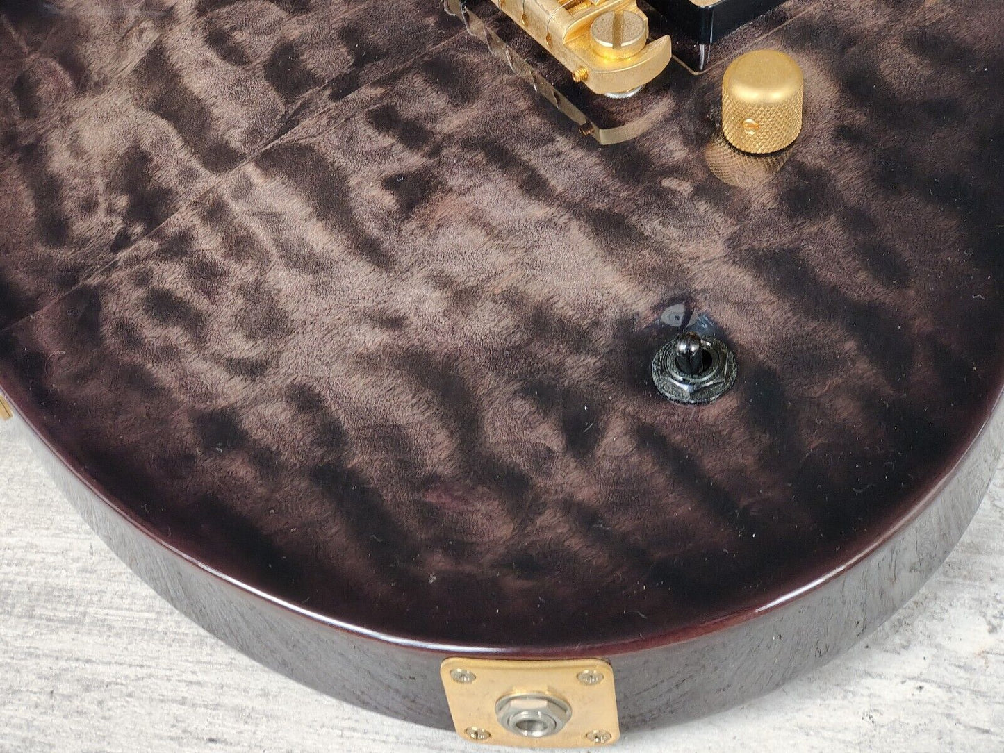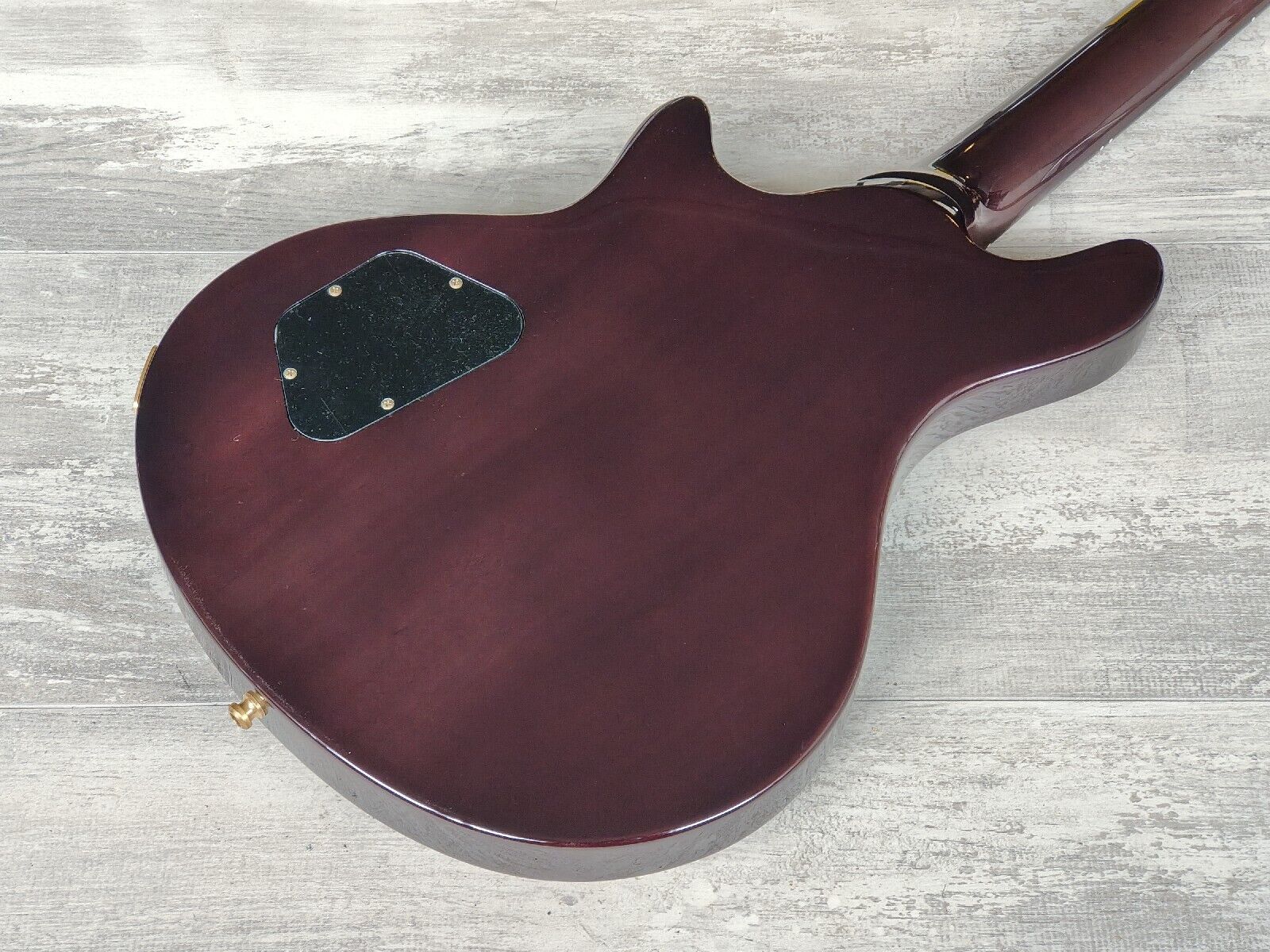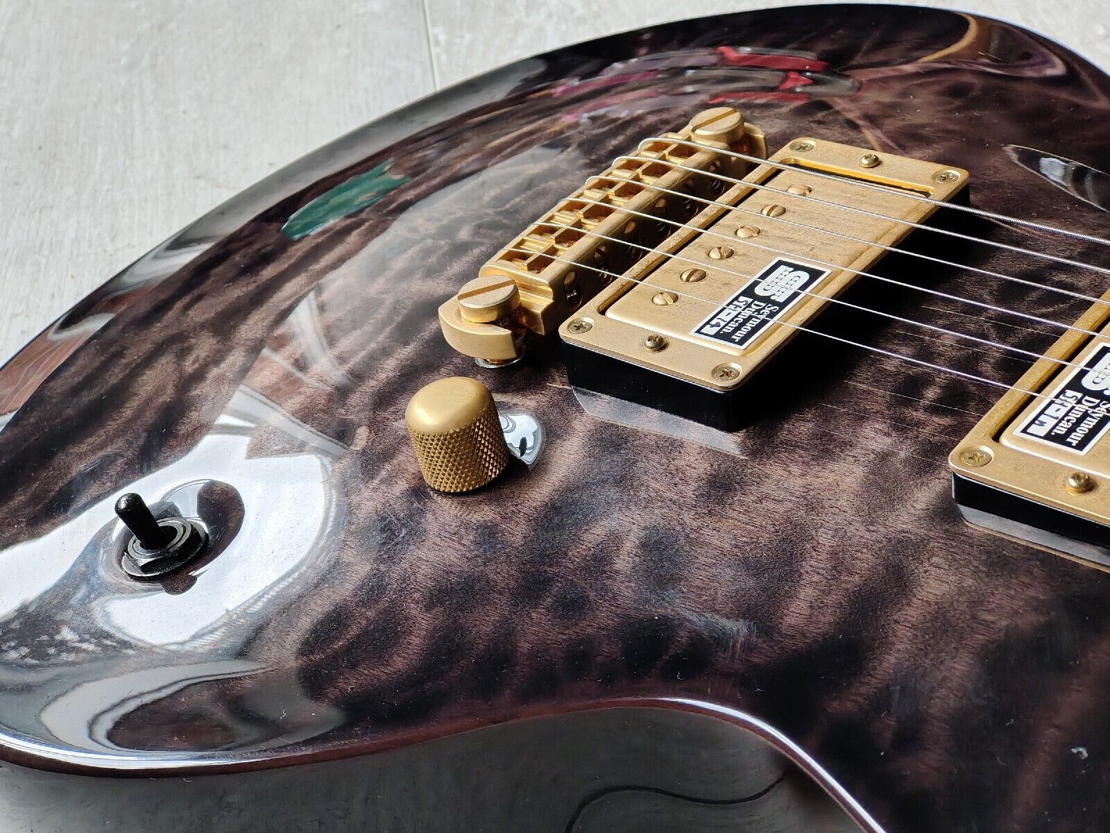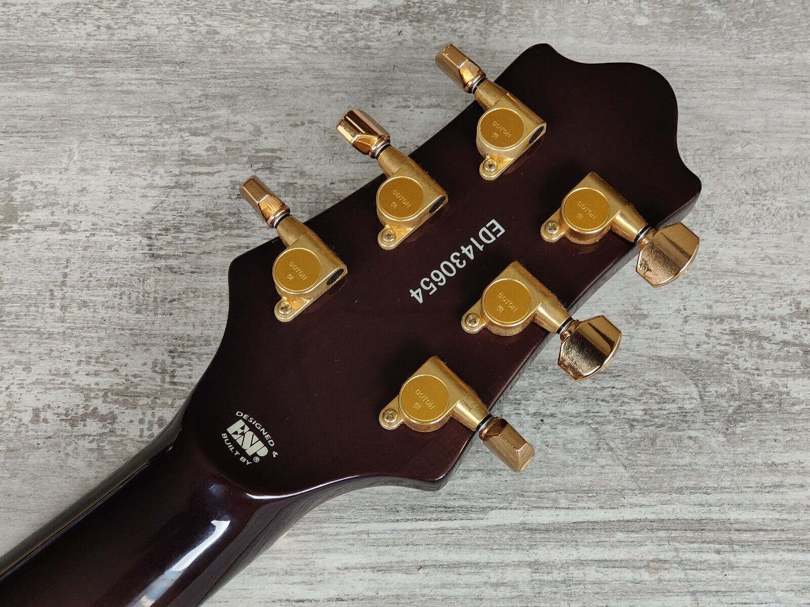 Made in Japan under the eyes of ESP, this is one of the Edwards artist models made with input from Uruha of "the GazettE". Quilt maple veneer top with a mahogany back and slim 60's maple neck, 24 fret ebony fingerboard (648mm scale length, dot inlays), it weighs 3.7kg's. Factory loaded with a TonePros AVT2G wraparound tailpiece along with gold Seymour Duncan SH-1N/SH-14 humbuckers controlled by a master volume knob and a three-way pickup selector.