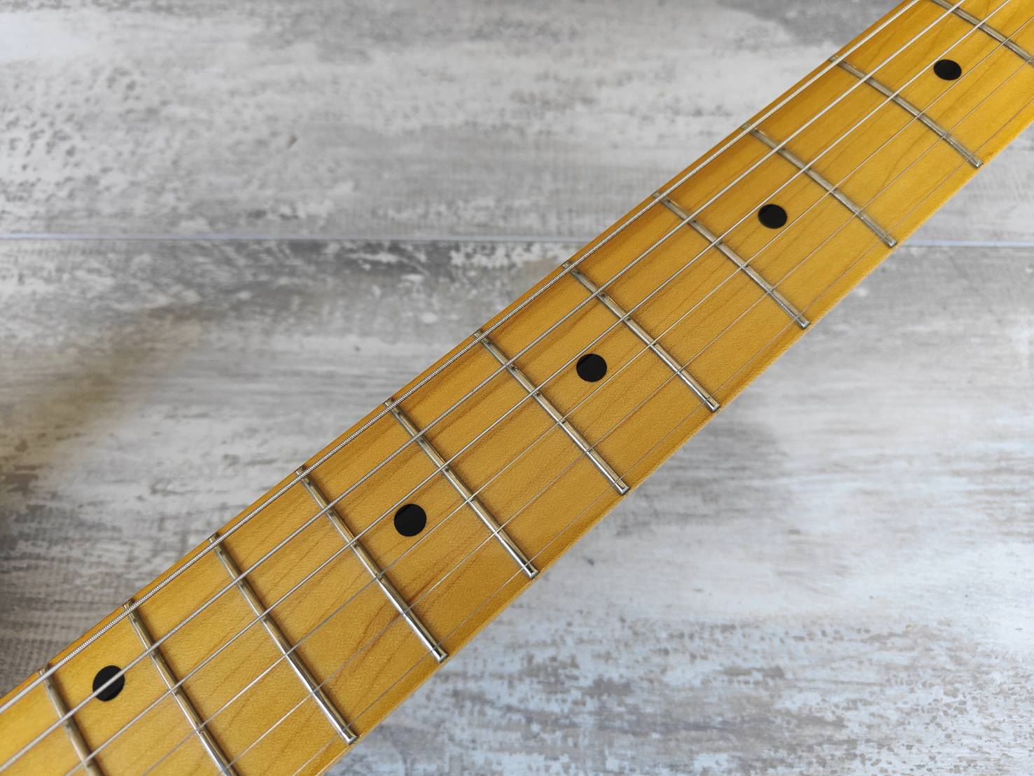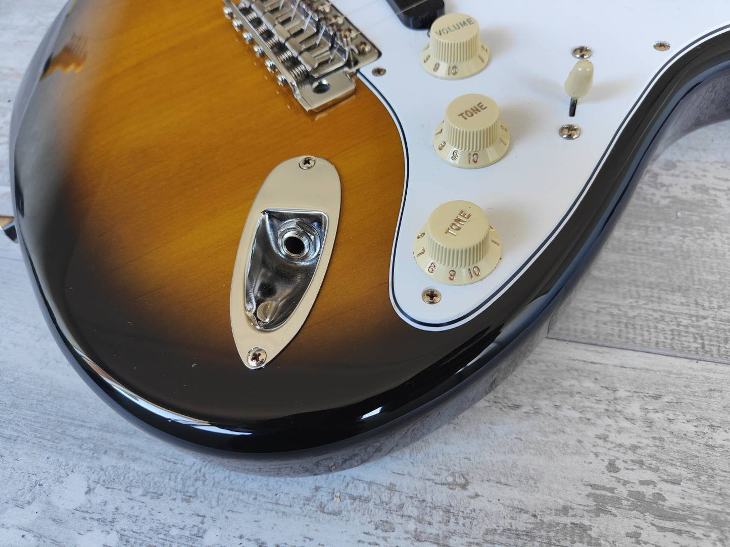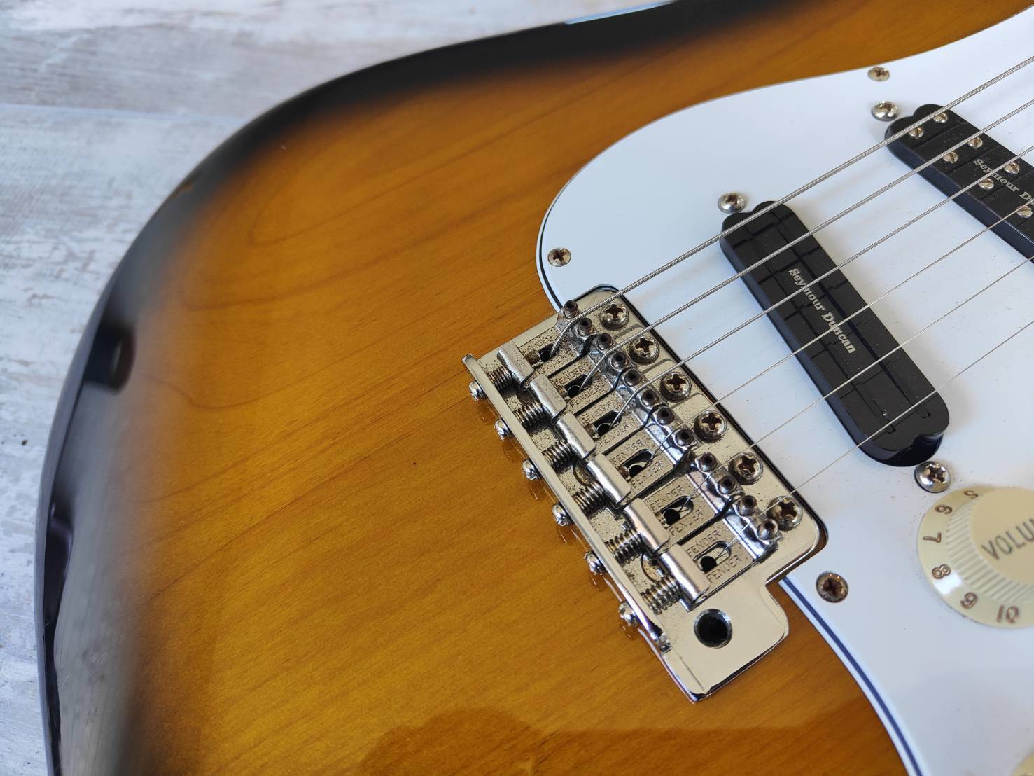 Made in the Fujigen factory in 2014, this was originally designed to be a faithful '57 reissue from Fender Japan, but it's since been converted into an absolute beast. Alder body with a brown sunburst finish, '57's style maple neck with a 7.25" radius, weighs 3.5kg's. The previous owner dropped in a new loaded pickguard with Seymour Duncan Hot Rails pickups in the neck and bridge position paired with an SL59 in the middle and a 5-way pickup selector to give a huge range of very impressive and powerful tonal options.