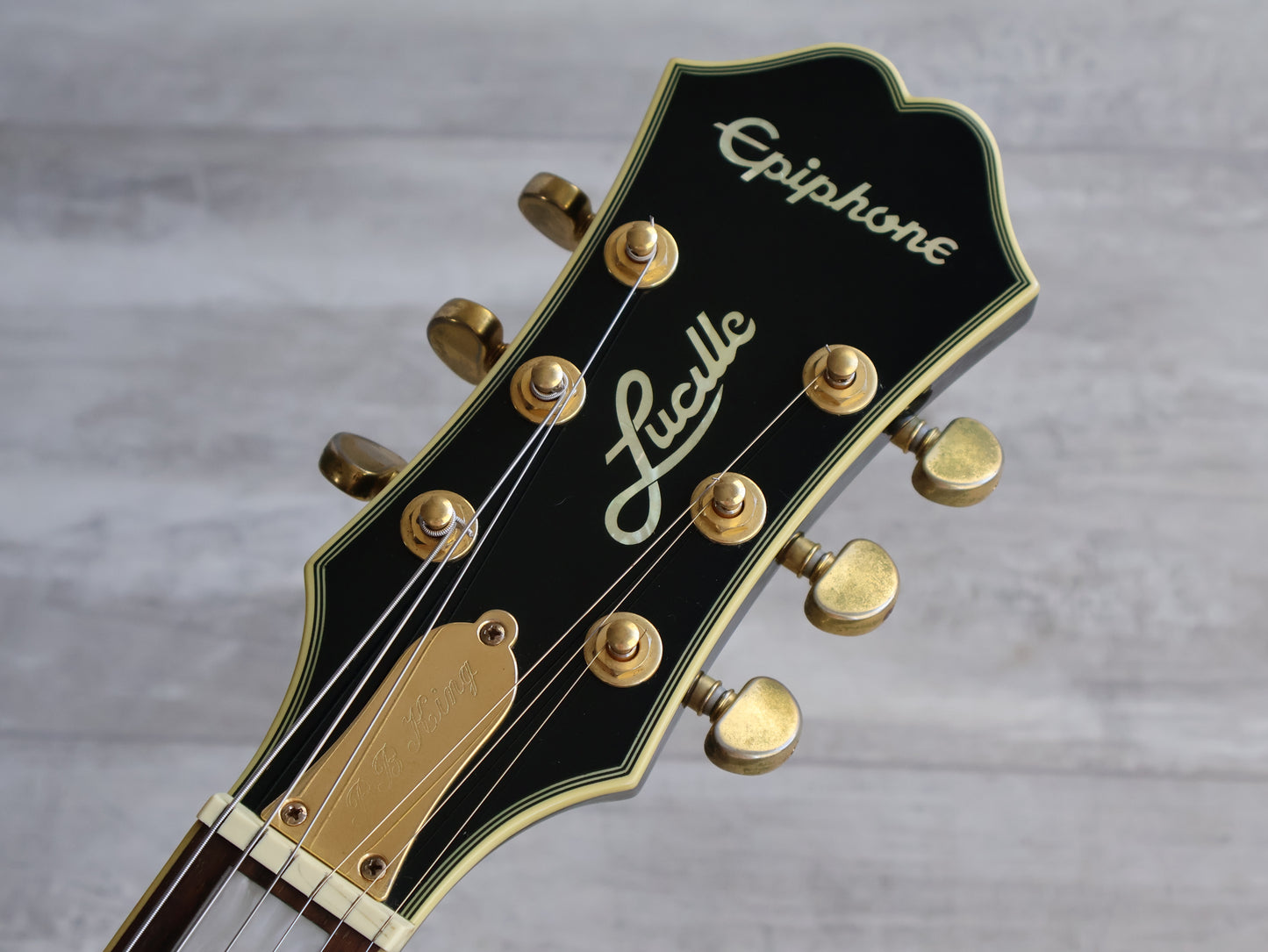 Based on the famously named guitars of blues legend B.B. King, the Epiphone B.B. King Lucille was inspired by the various Gibson ES™ models he played over the years - all of which were named Lucille. Standout features that make this Lucille such a stunning guitar and loving tribute include gold hardware, Grover® Rotomatic® tuners, a Graph Tech® nut, ebony fretboard with pearloid block inlays, a brass truss rod cover with B.B. King’s name engraved on it, mother of pearl Lucille inlay on the headstock face, multi-ply binding on the body and headstock, a TP-6 tailpiece with fine tuners, and a semi-hollow body with a maple center block to reduce feedback.