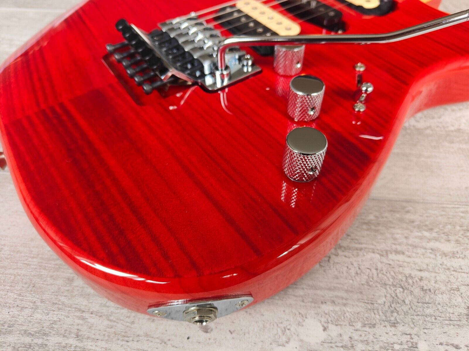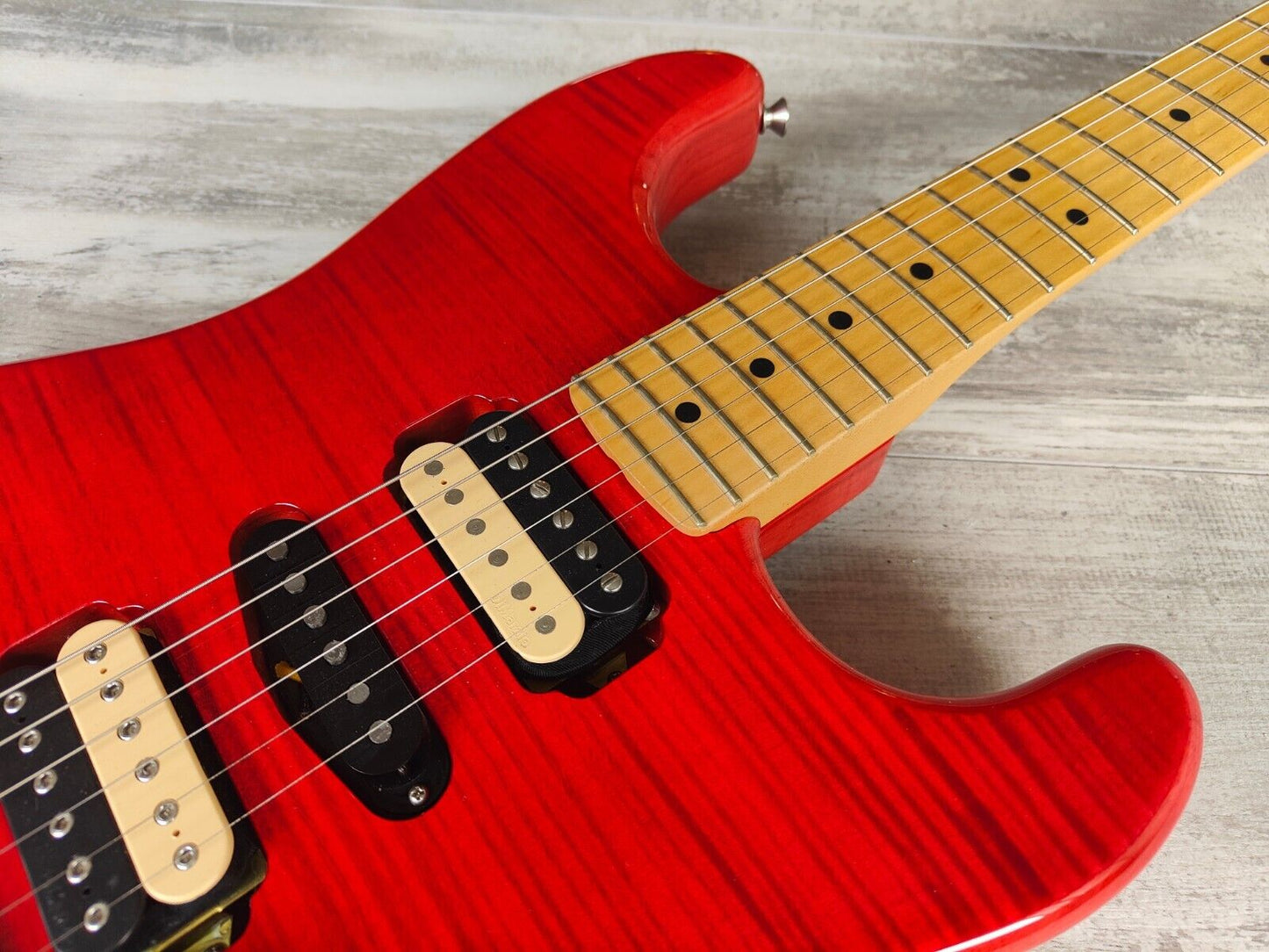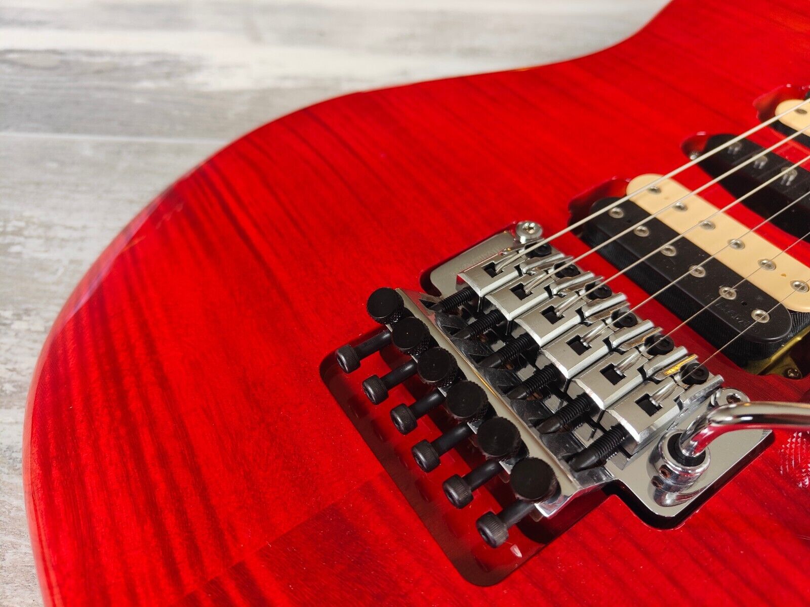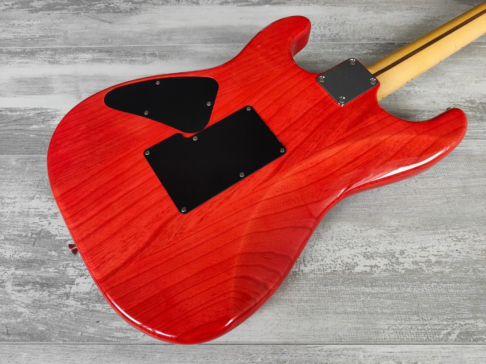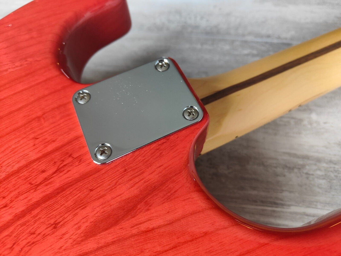 Ash body with a quilt maple top, it wears a "Trans Pink" polyester finish that is a little closer to red than traditional pink. Maple neck with a slight V profile and a urethane satin finish, 22 fret fingerboard (medium jumbo frets, 42mm nut width), it weighs 3.9kg's. Factory loaded with a Gotoh locking tremolo system and Fender "F Stamped" tuners.